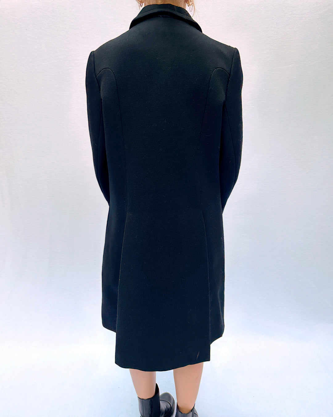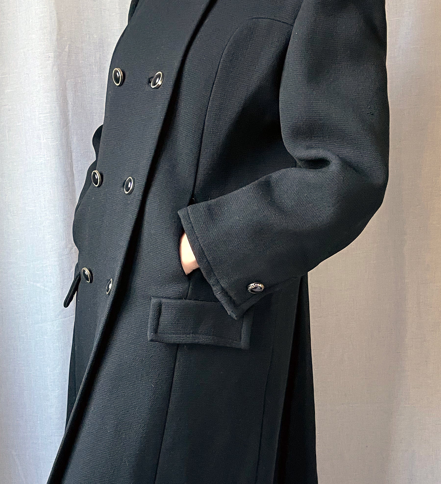 This vintage peacoat is so timeless: a piece you'll have in your wardrobe forever. It's made of a thick woolen fabric; the fiber content is not listed, but it has the heavy feel of a wool canvas or cotton duck. It has a double-breasted closure, with black enamel buttons with an etched silver bezel. It features faux flap pockets at the bottom front, with a hidden muff pocket above. A double vent in the back, plus the A-line silhouette, makes it perfect for layering. This coat is fully lined and super warm!