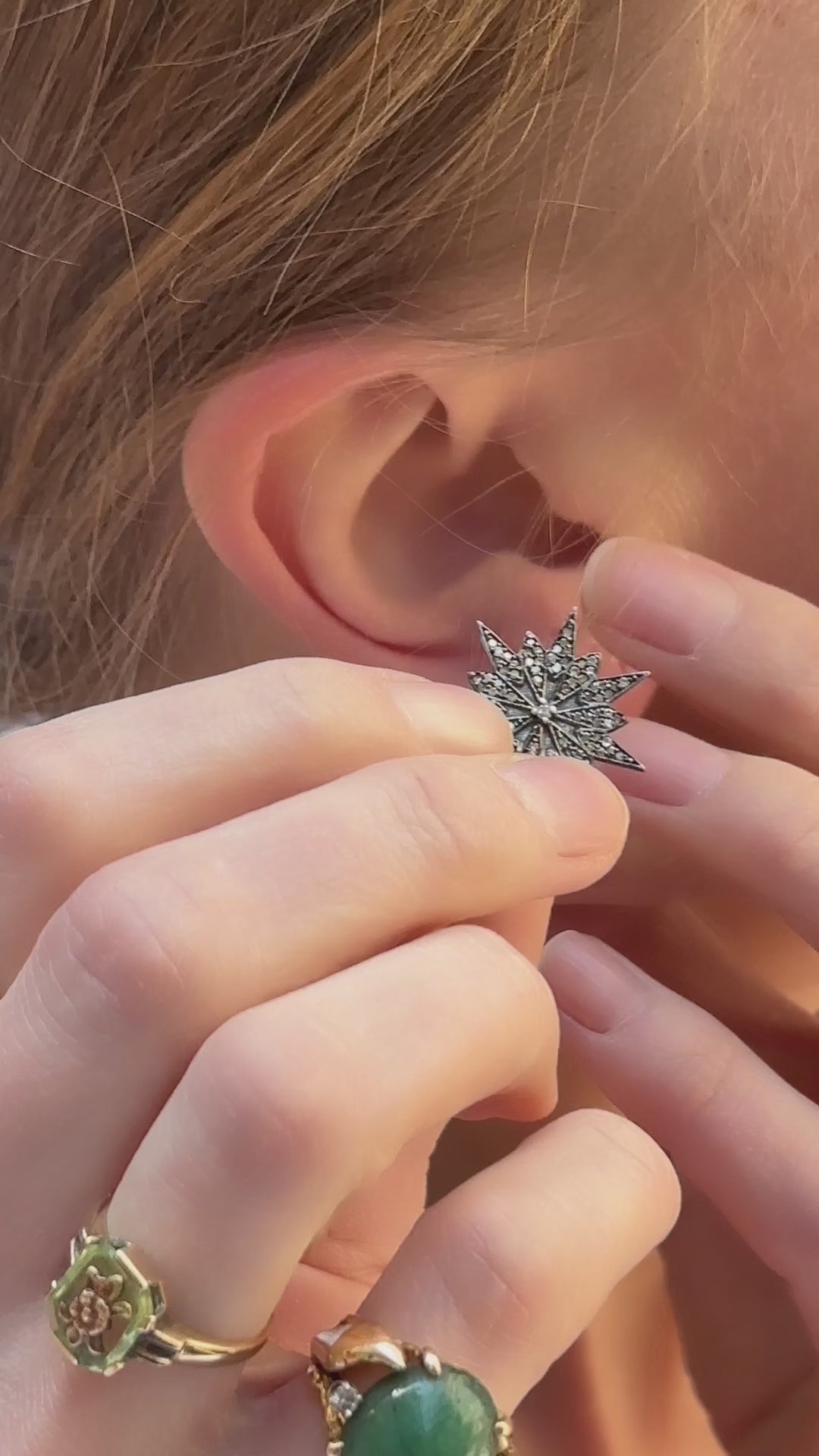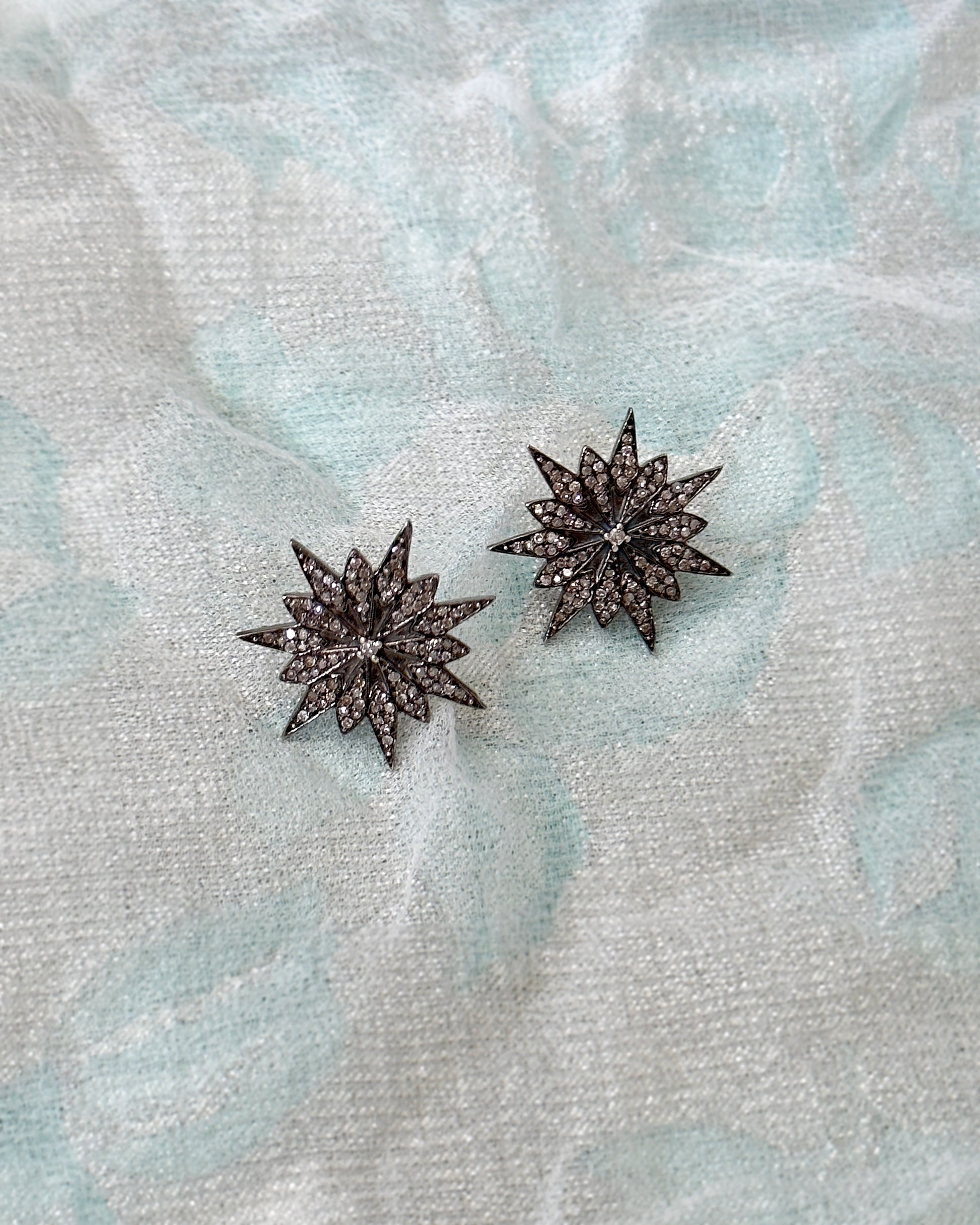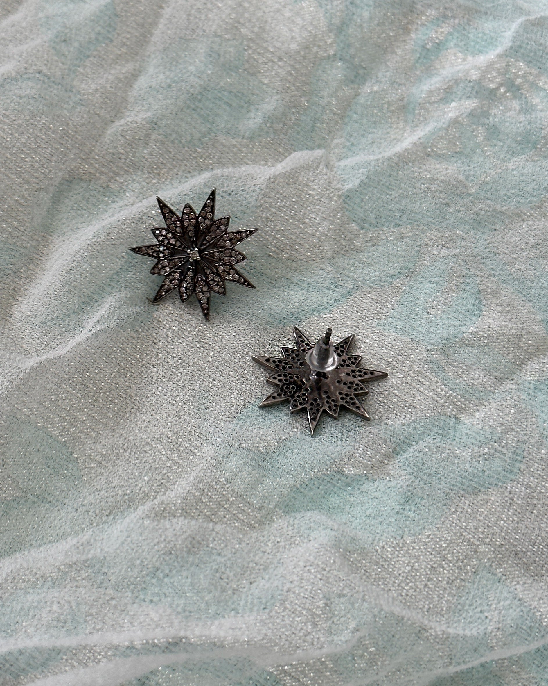 These gorgeous vintage diamond and sterling silver earrings feature a starburst motif (also resembling a spider web) with dozens of individual diamonds creating a magnificent glowing effect. The "blackened gold" look gives these a Victorian feeling. They are set in solid sterling silver, containing .68 karats of diamonds. Finished with a post back, and measures about 11 mm diameter. The Vintage 1970s Halter Dress pictured is also available.