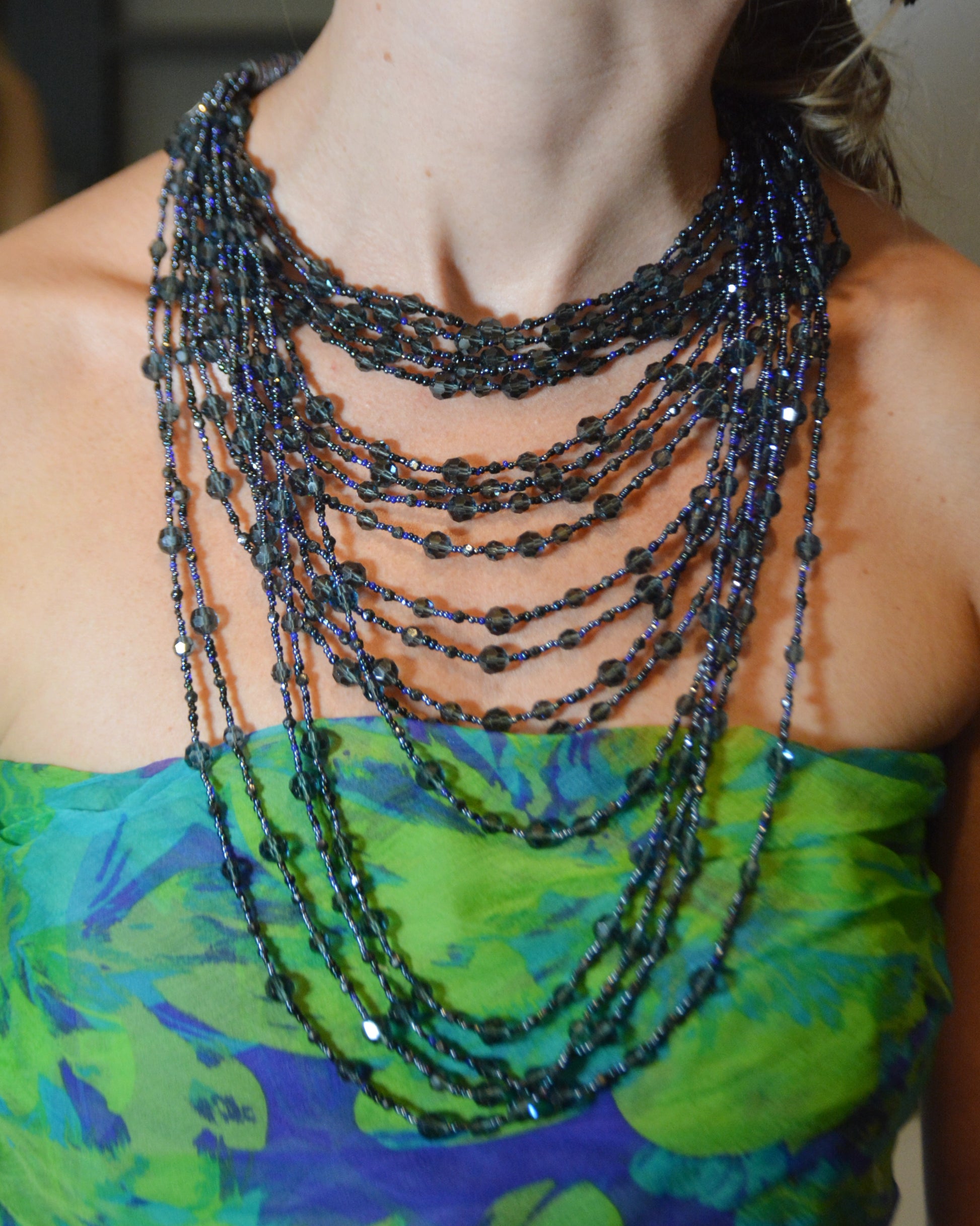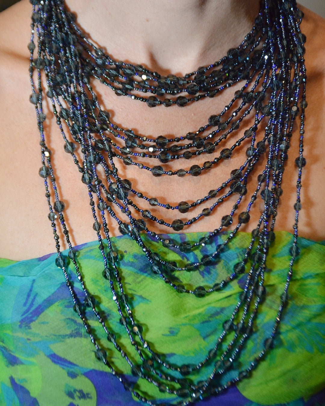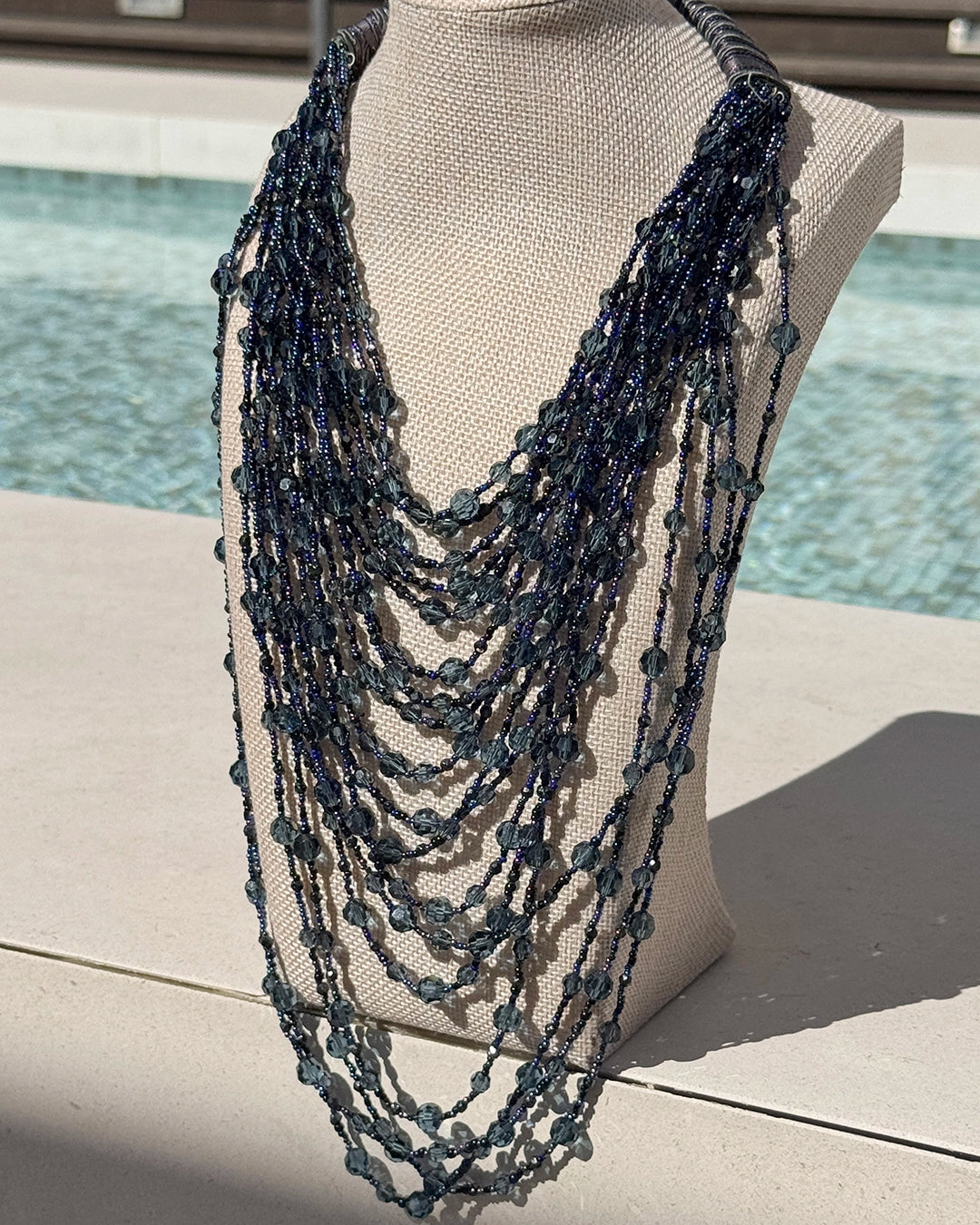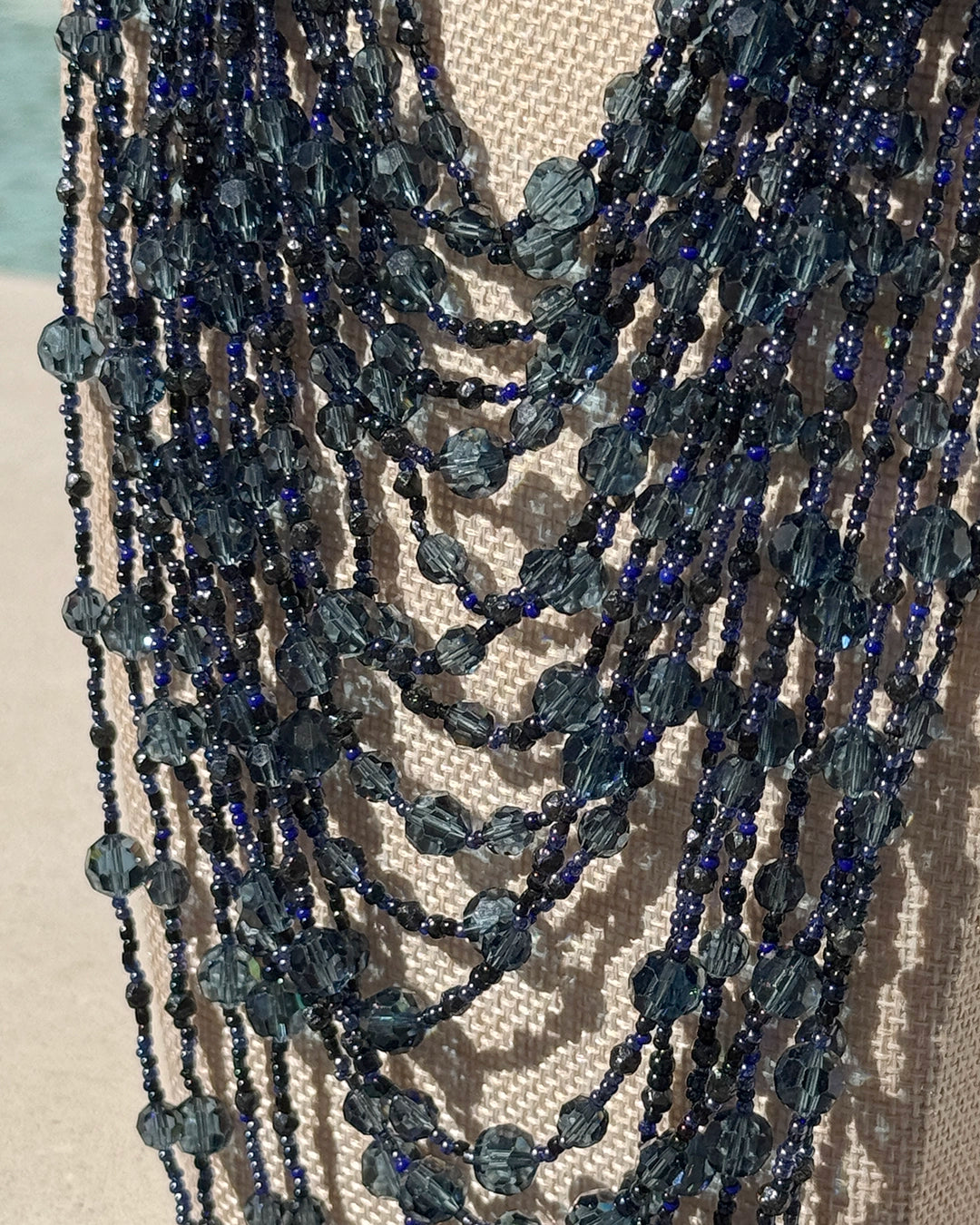 This vintage draped multistrand beaded statement necklace reminds me of the necklaces that walked the runway in the Christian Dior Fall 1997 collection, John Galliano's first ever ready-to-wear collection for Christian Dior, and a highly influential fashion moment of the end of the 20th century. A version of this necklace walked the runway with the majority of looks (see below). Layered with handfuls of strands at graduating lengths, this necklace features gorgeous iridescent sapphire-blue seed beads, with larger semi-transparent faceted beads interspersed. Note that the piece is unsigned.