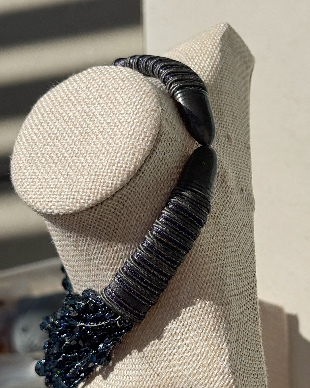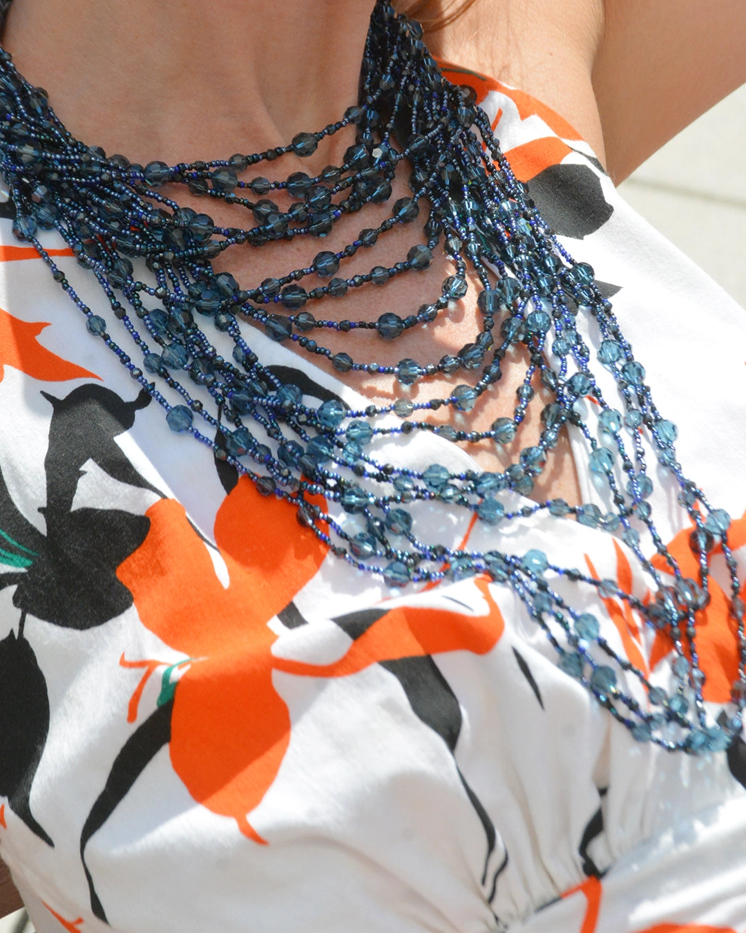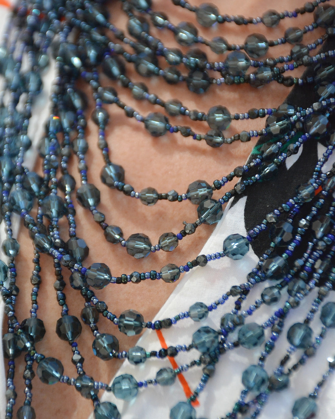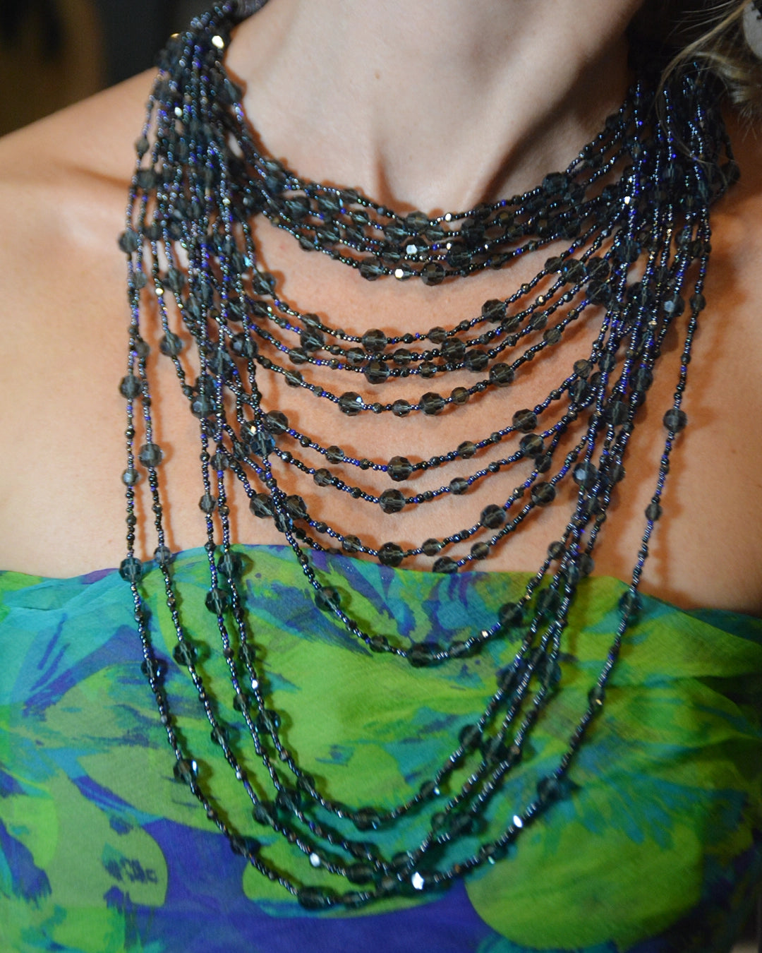 This vintage draped multistrand beaded statement necklace reminds me of the necklaces that walked the runway in the Christian Dior Fall 1997 collection, John Galliano's first ever ready-to-wear collection for Christian Dior, and a highly influential fashion moment of the end of the 20th century. A version of this necklace walked the runway with the majority of looks (see below). Layered with handfuls of strands at graduating lengths, this necklace features gorgeous iridescent sapphire-blue seed beads, with larger semi-transparent faceted beads interspersed. Note that the piece is unsigned.