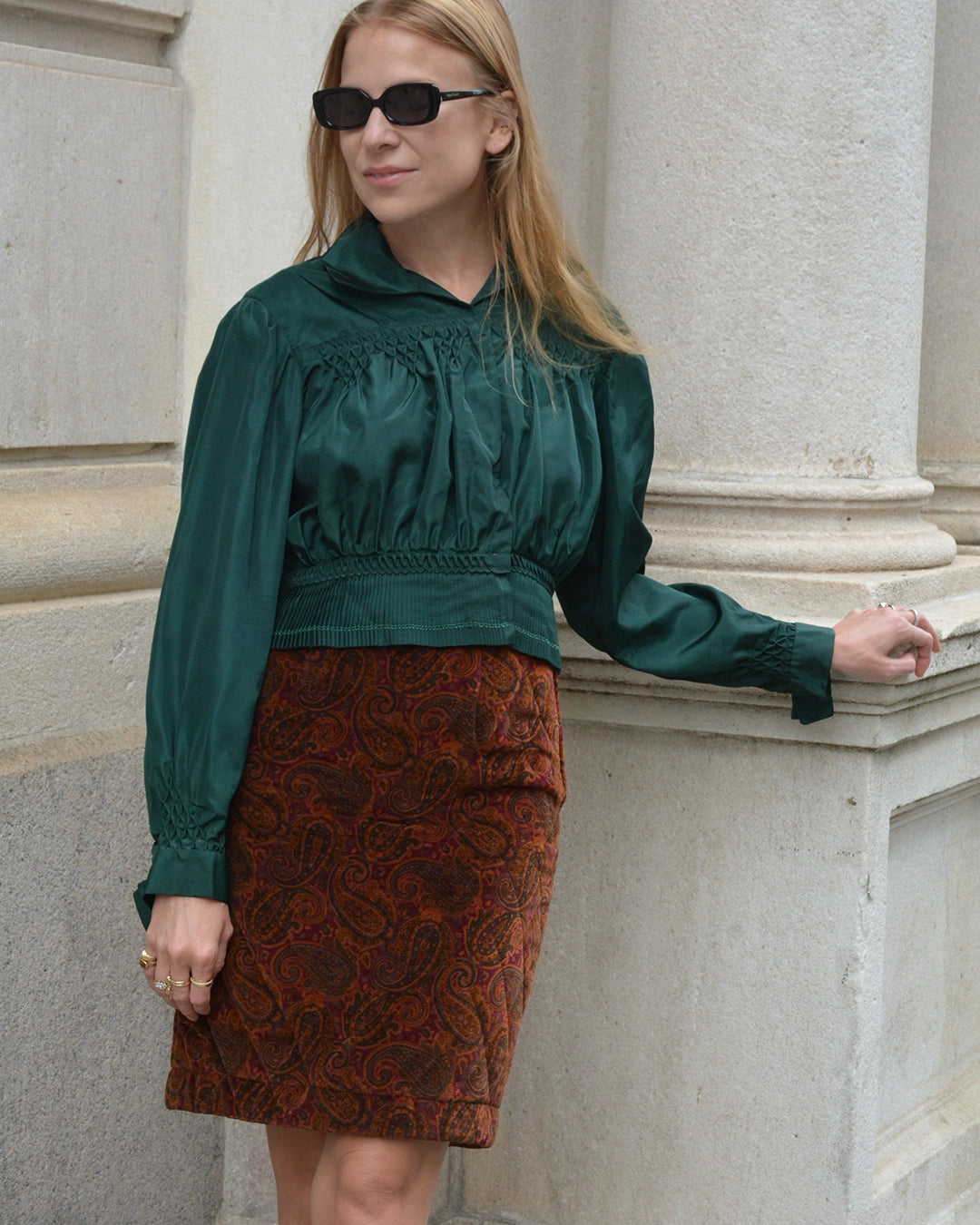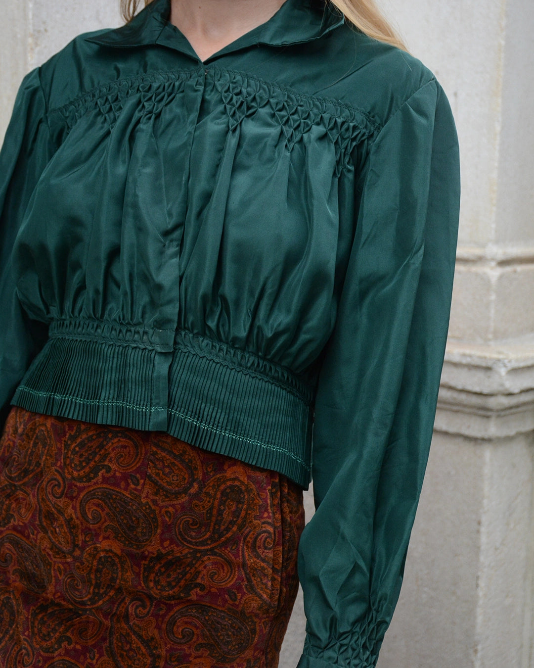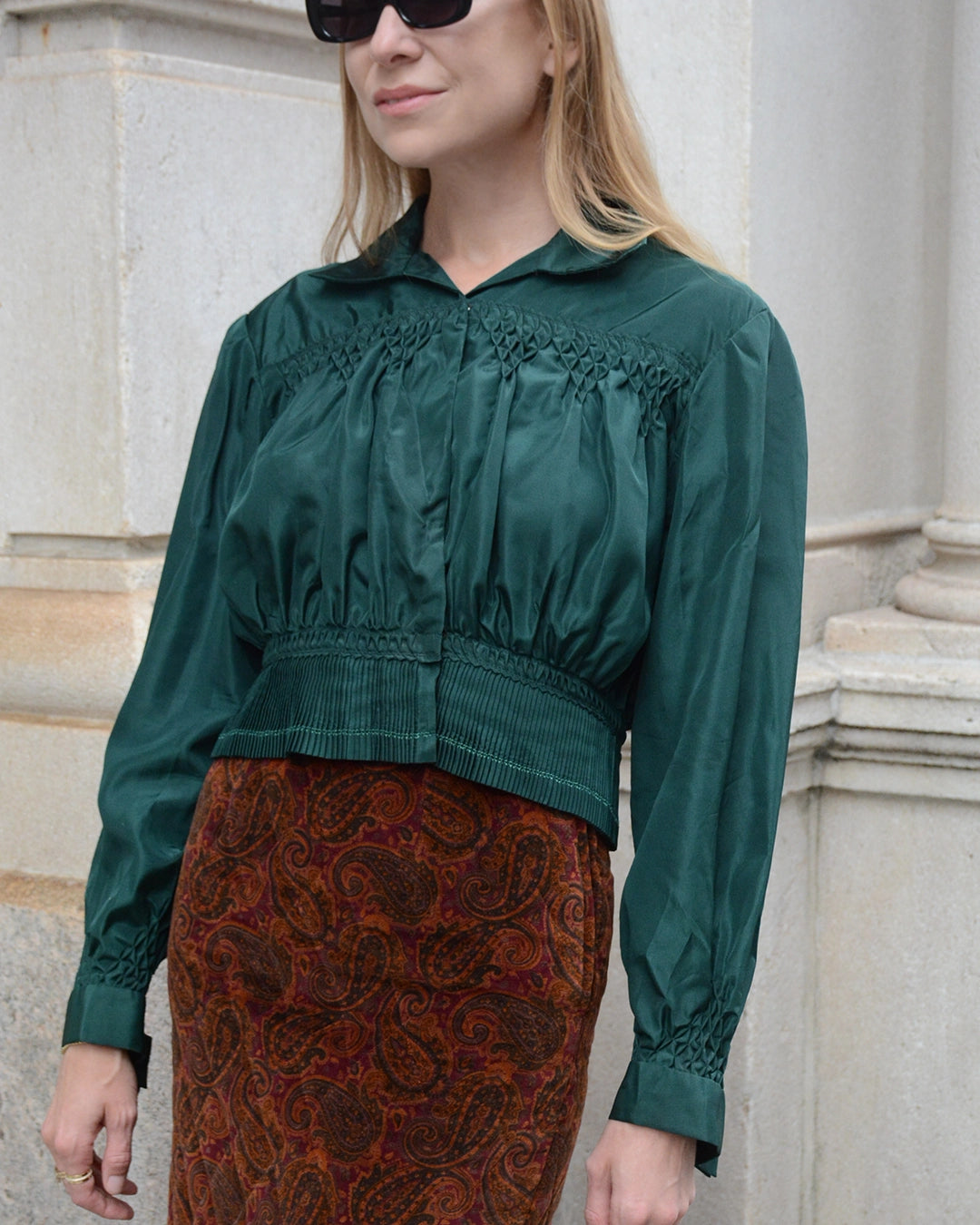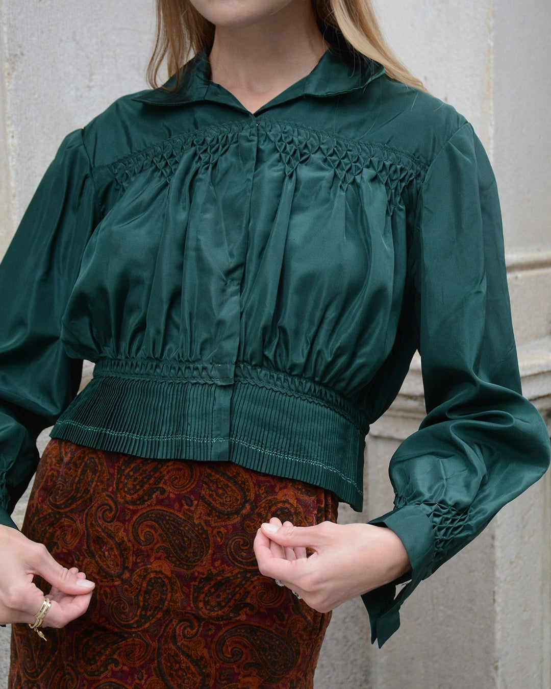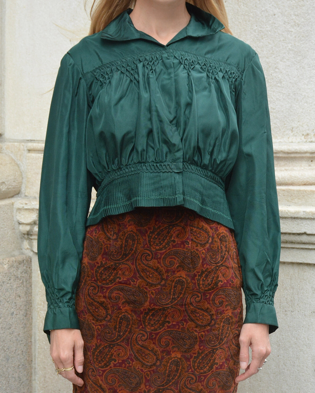 Great vintage condition. Note that the blouse is handmade so there are some irregularities, which only add to its artisanal "folk" charm. There is one small area of discoloration at the cuff, which is not noticeable when worn. With any questions about the specific condition or size, please email shop@verybreezy.com for additional photos or measurements, as all sales are final.