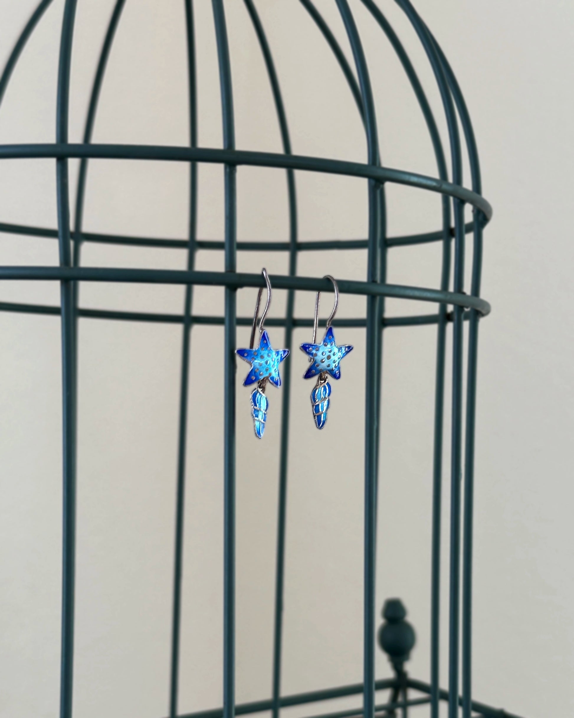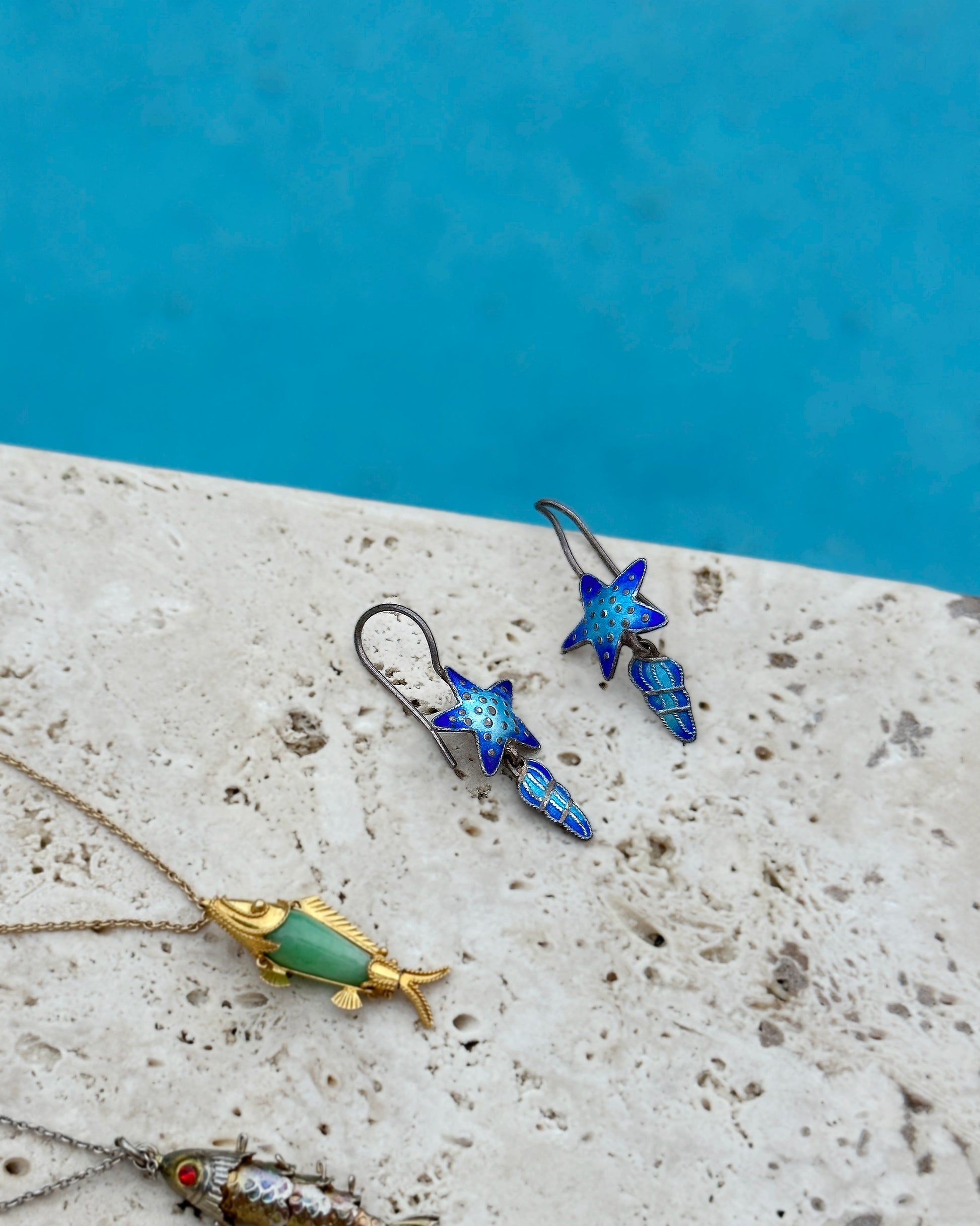 These vintage seashell earrings are made of sterling silver, with cloisonné enamel detail punctuating the surface of the starfish and auger seashell with an ombré layer of ocean blue. They are so lightweight, and basically feel like nothing on the ear. The small size makes them fun to layer with other earring in your ear stack. Since they are crafted from fine sterling silver, they are designed to stand the test of time, and can always be polished back to their original condition should any tarnishing occur. Signed S925 for sterling silver. Finished with a hook for pierced ears, and measures about 36 mm total drop. The Vintage Silver Bird Choker, Vintage Articulated Fish Pendant, and Vintage 14k Gold and Jadeite Fish Pendant are also available.