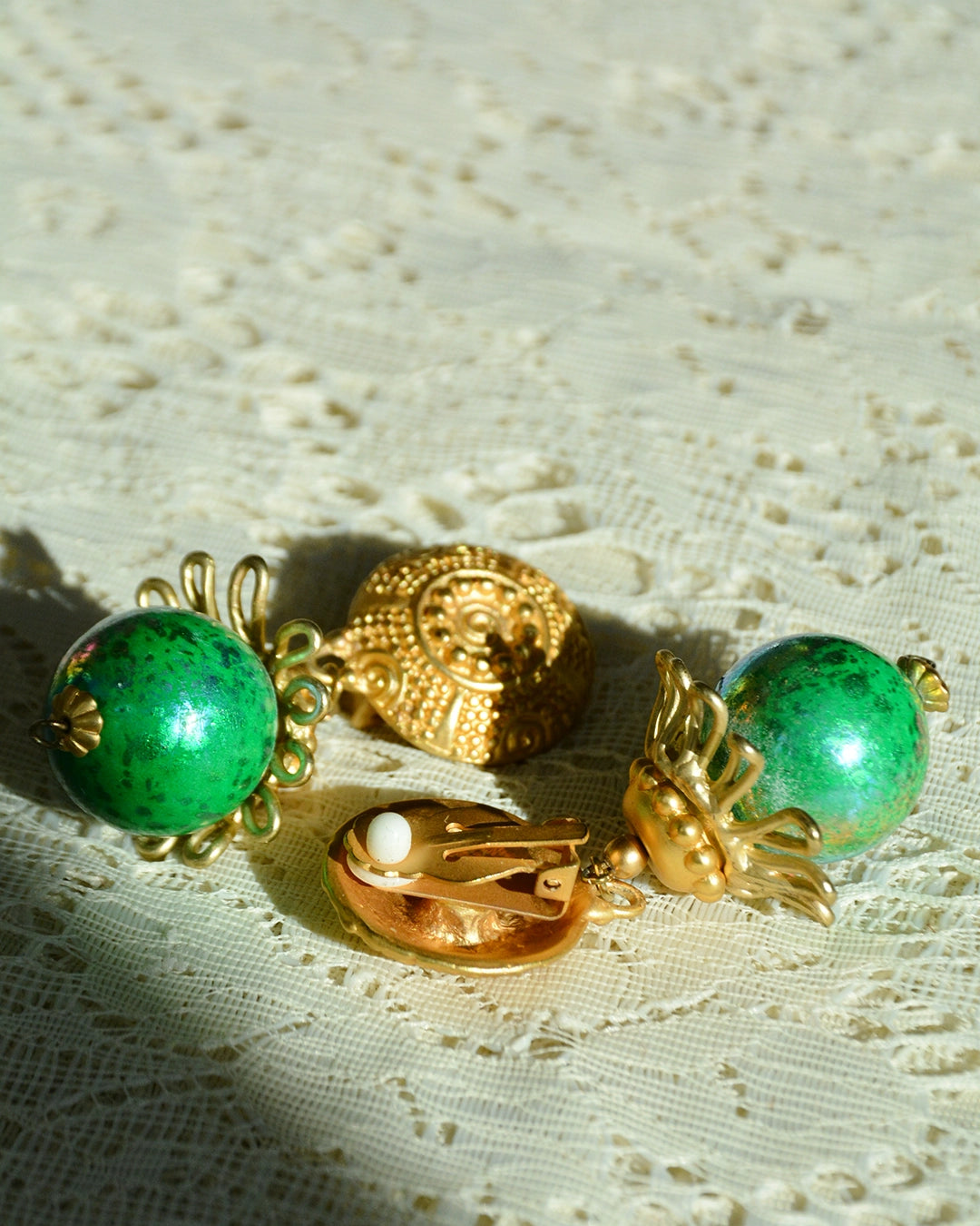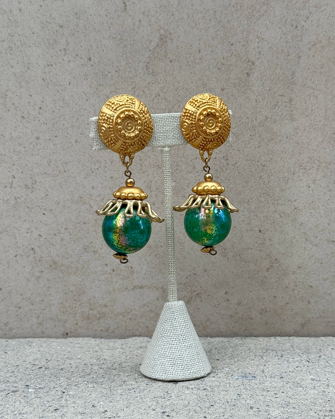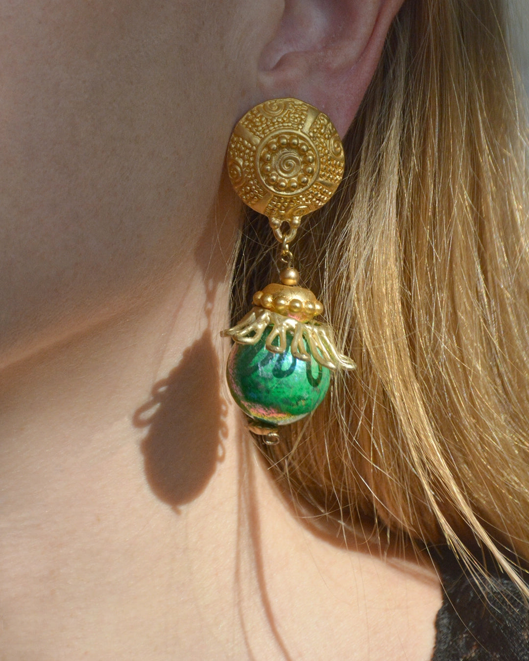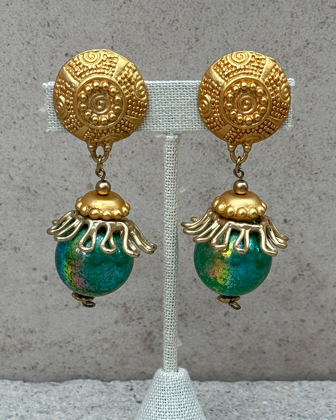 These vintage Etruscan Revival gold earrings feature several nods to Etruscan jewelry, including buttery-yellow matte gold resembling actual high-karat gold, distinct granule details, and colorful details. The marbled green orbs that drop from the earrings resemble mercury glass with their magical iridescence reflecting a subtle rainbow of hues. The squiggly gold cap on top of the orbs moves! They are finished with a clip-on lever back; despite their size, these earrings are lightweight and comfortable (as is the case with most vintage clip-ons compared to modern jewelry, because of the quality that went into their hand-made construction.) Measures about 7cm long.