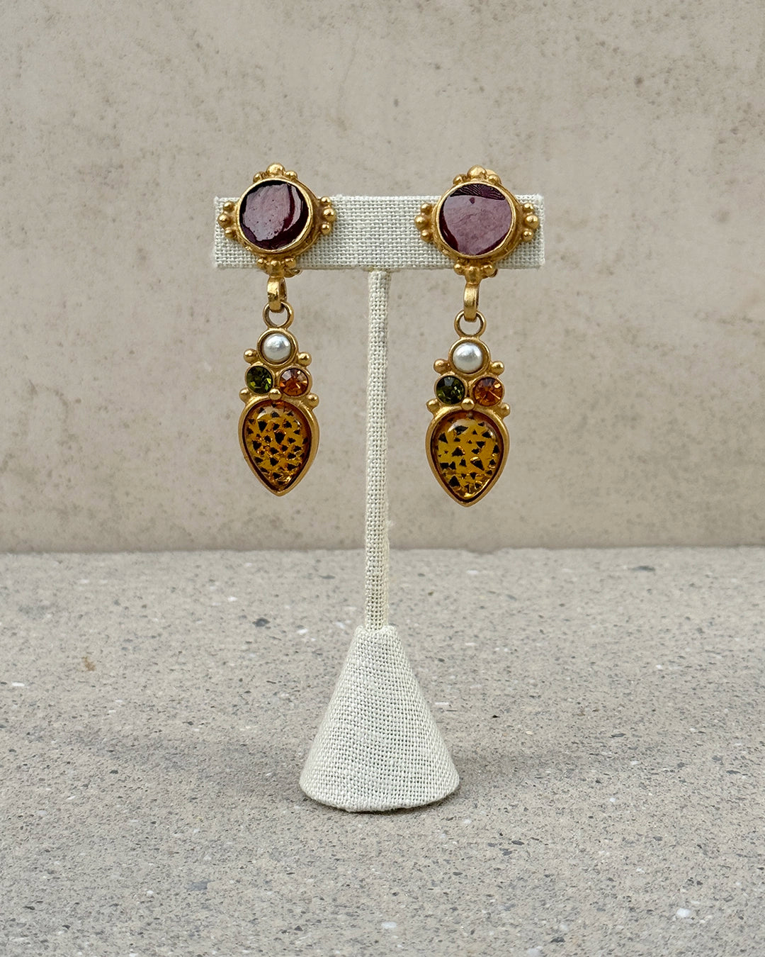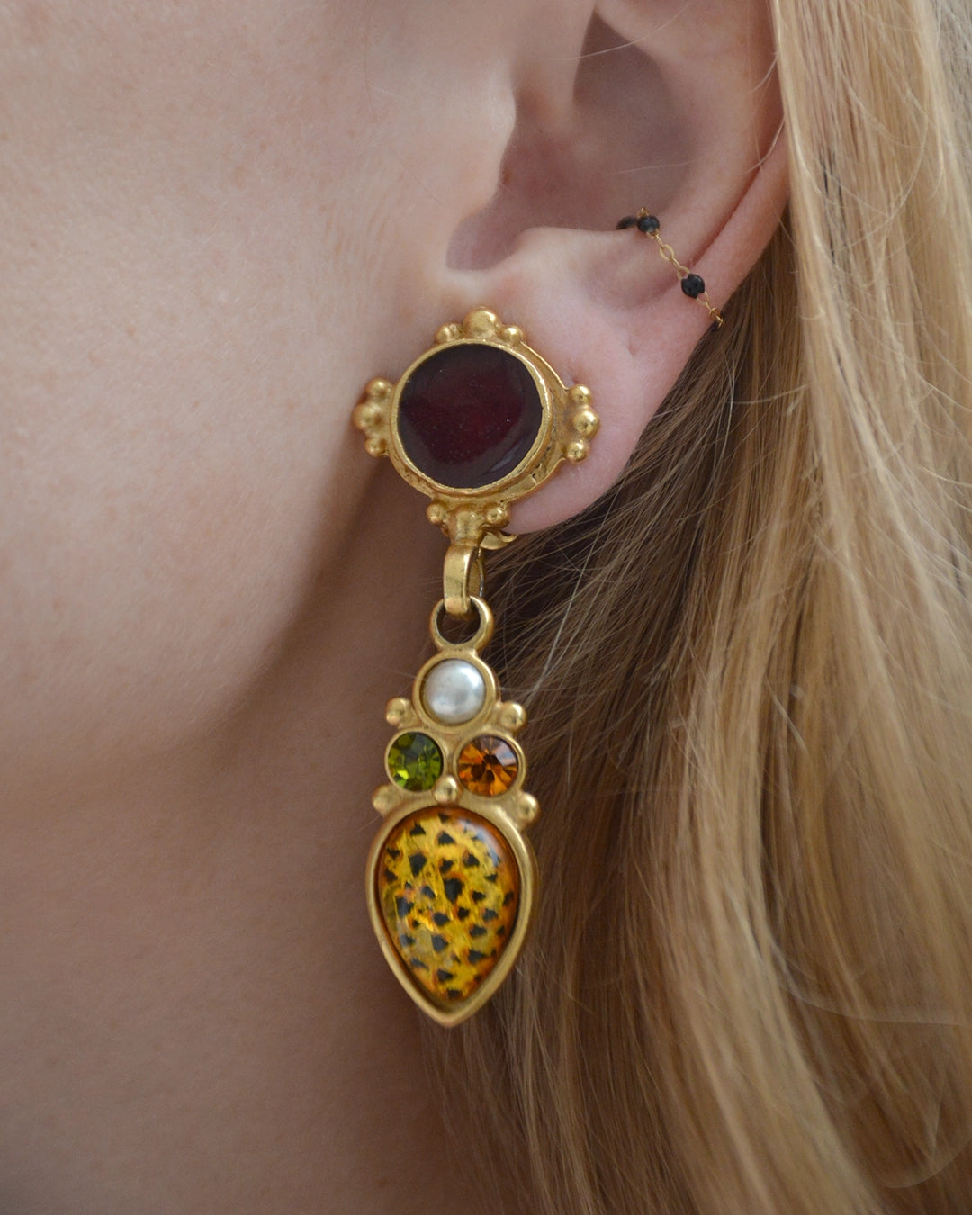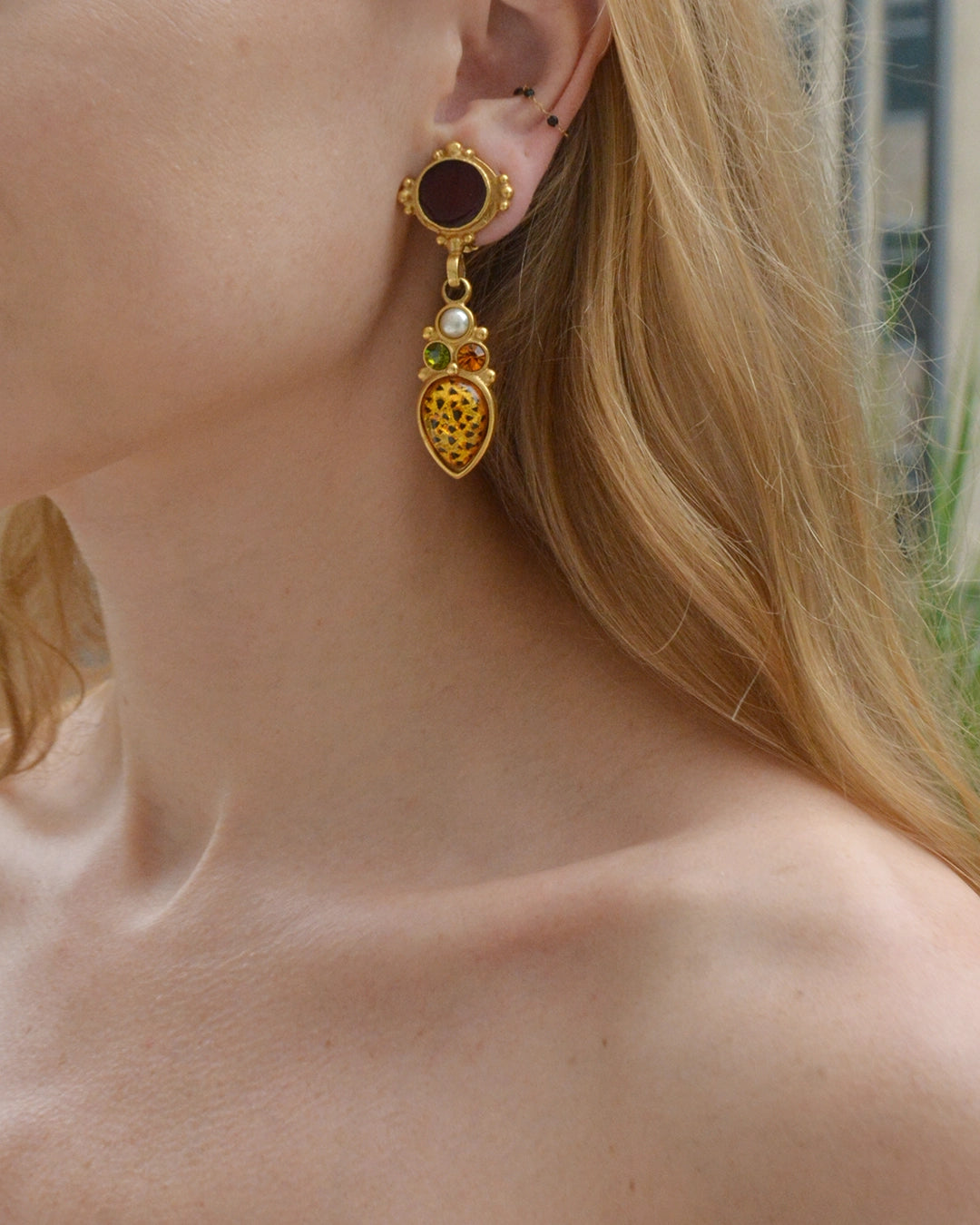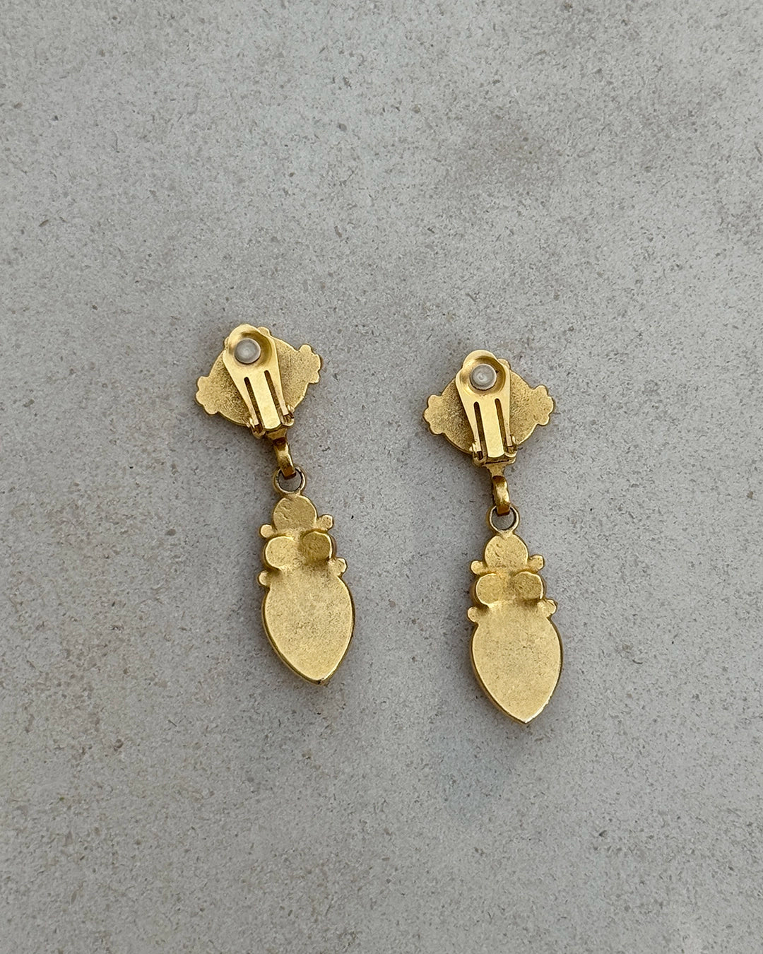 These vintage earrings are done in an Etruscan Revival style, with buttery-yellow matte gold resembling actual high-karat gold, distinct granule details, and colorful glass and crystal details calling to mind ancient intaglios. They are finished with a clip-on lever back; despite their size, these earrings are lightweight and comfortable (as is the case with most vintage clip-ons compared to modern jewelry, because of the quality that went into their hand-made construction.) Measures 67 mm long x 23 mm at widest point.