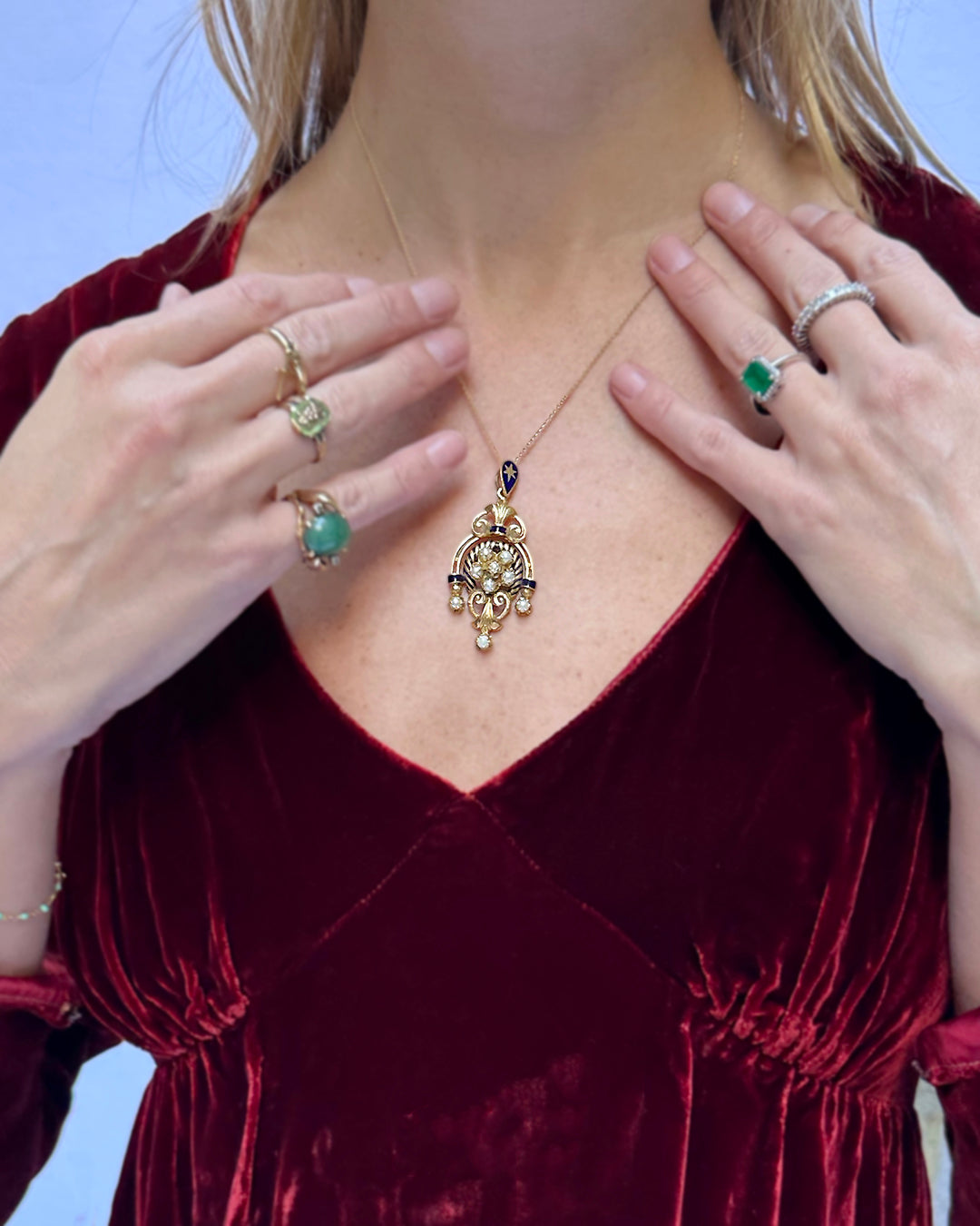 This vintage lavalier pendant is an incredibly special piece that will be in your collection and certainly become an heirloom. It features an ornate architectural volute motif, crafted from solid 14k gold with blue enamel work and seed pearls. I love the star detail at the upper teardrop— it lends a sort of celestial, magical feeling to the piece. This pendant was made in Greece in 1946, and very much feels influenced by the style of famous Greek jeweler Ilias Lalaounis, who is known for his work with gold + blue enamel. It's such a one-of-a-kind piece, and would make a lovely gift. The bale is a good size and will accomodate almost any chain; you have the option to buy just the pendant, or add a chain if you need one. Measures about 2" long x 7/8" at widest point.