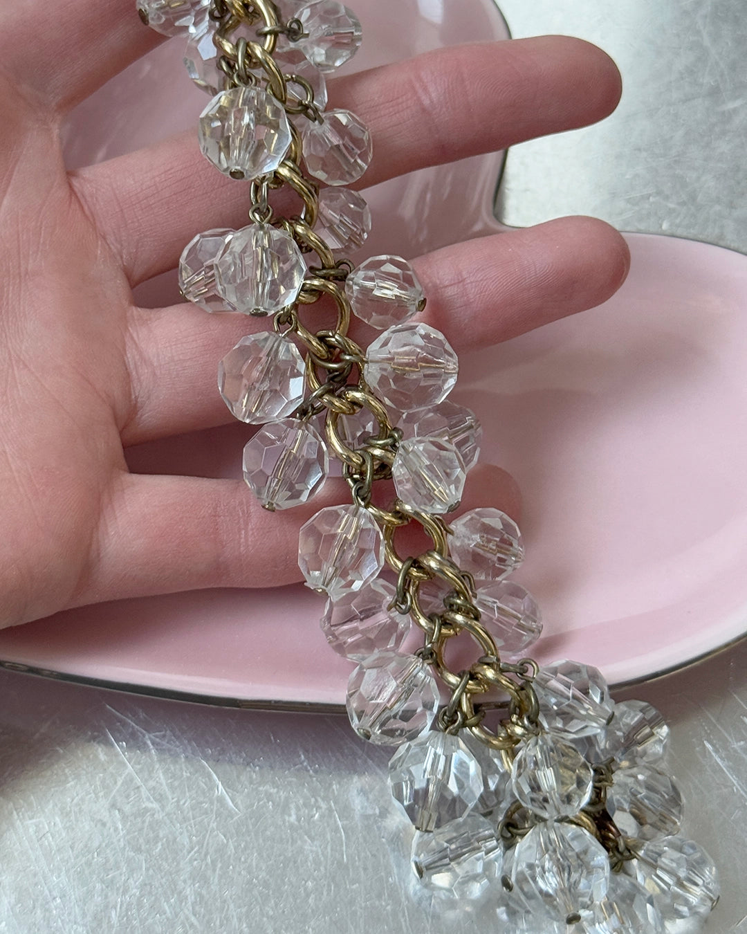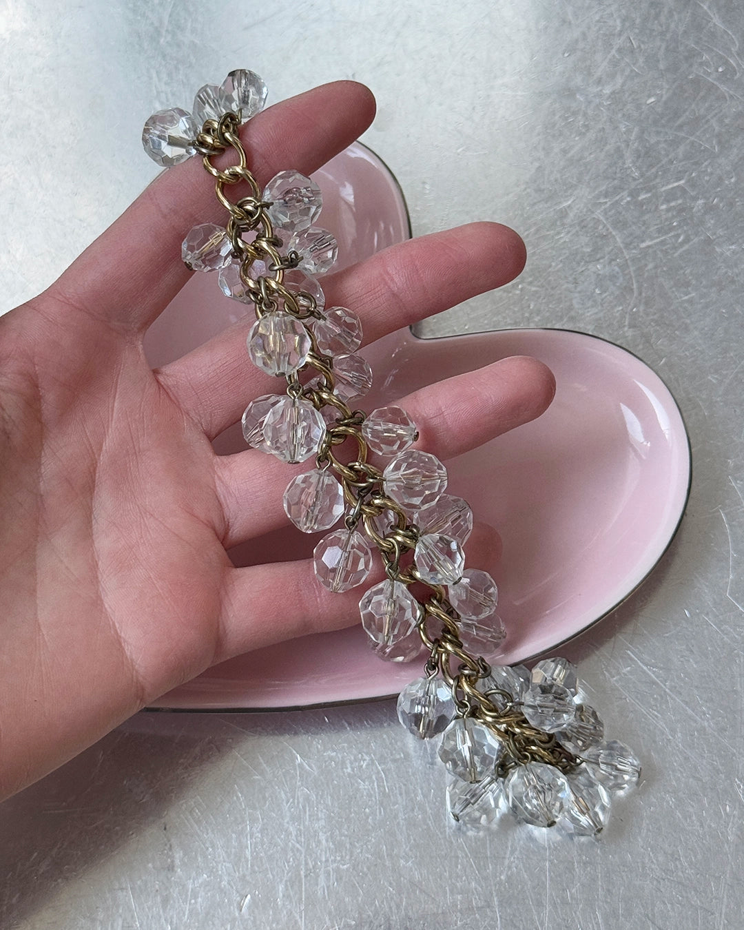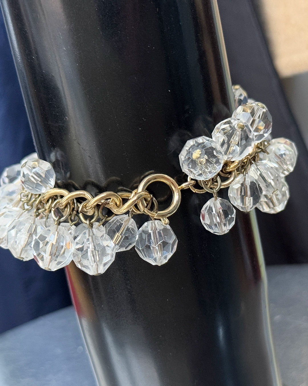 Circa 1960s, this vintage faceted bead charm bracelet is such a fun piece to wear. It is just swimming with colorless faceted beads in different sizes, imitating briolette diamonds. Their dangling nature gives the piece so much movement. It's grounded by a gold-tone chain and fastens with a C-ring clasp. Measures about 8.25"; since the links are on the large size, it could also be fastened on a different part of the chain to be worn shorter, or it could easily just be shortened altogether.
