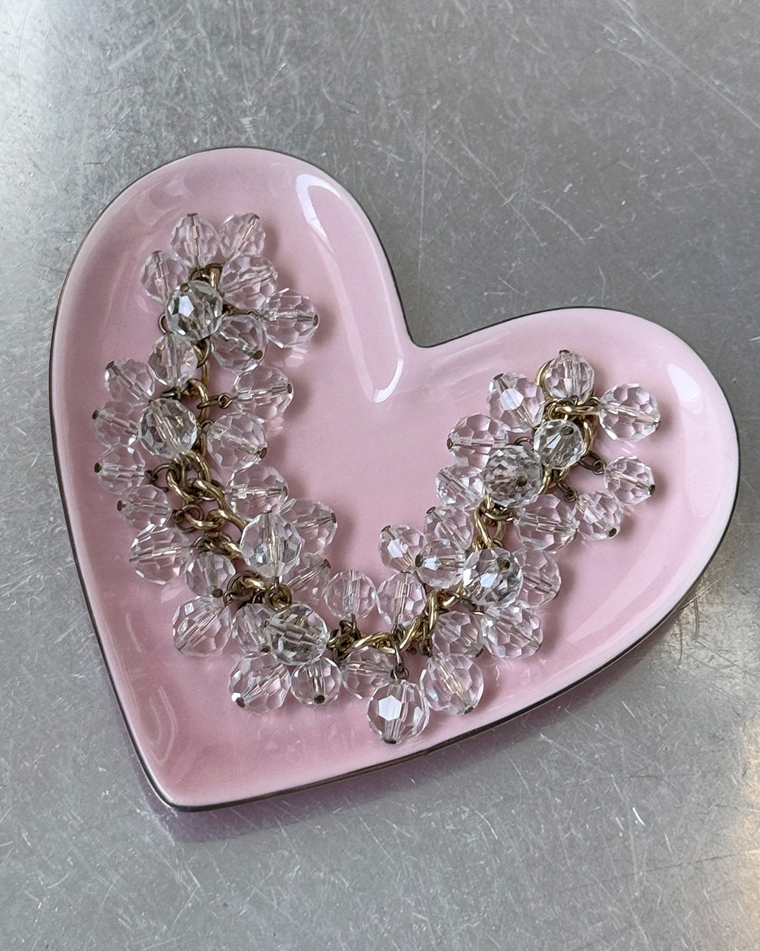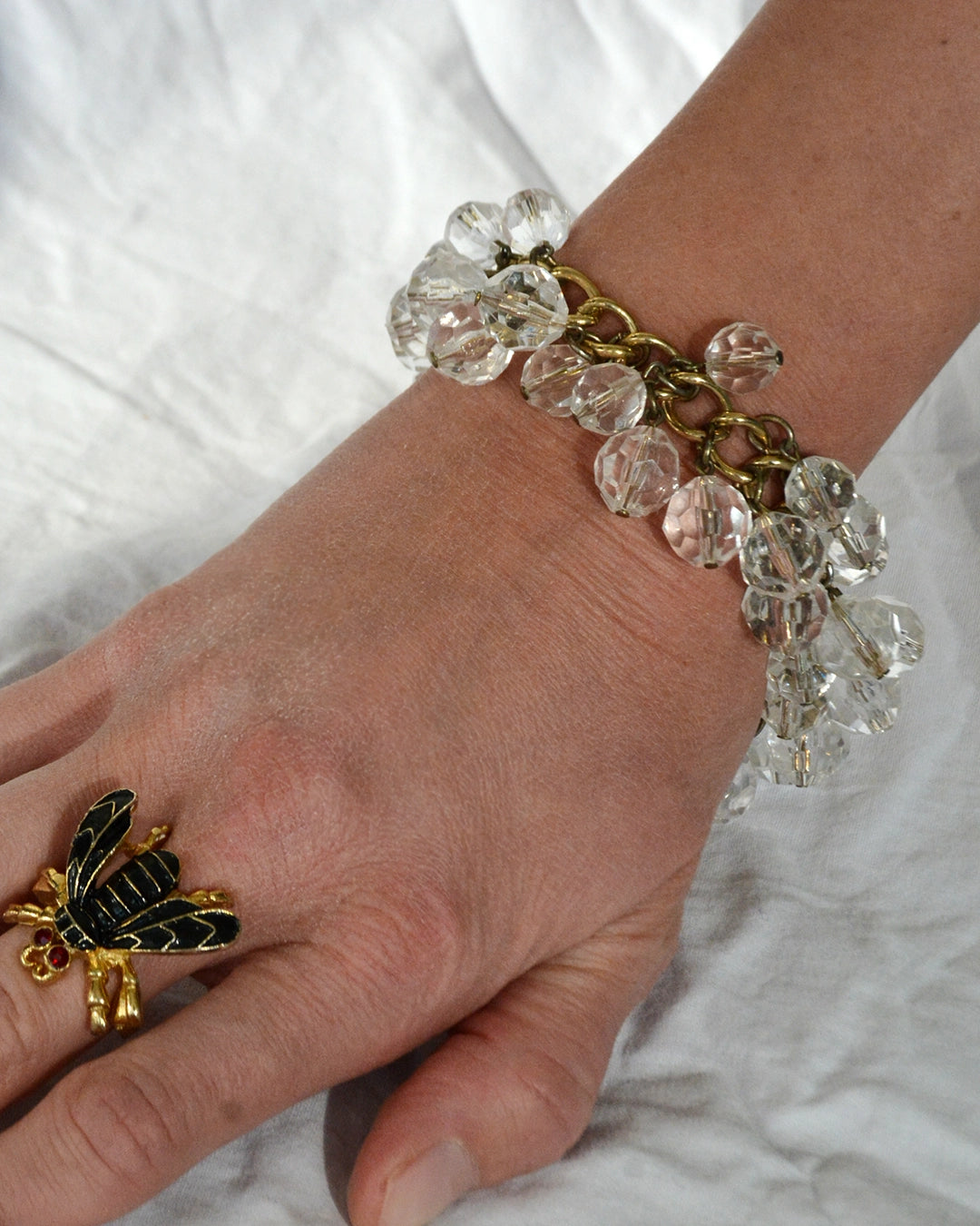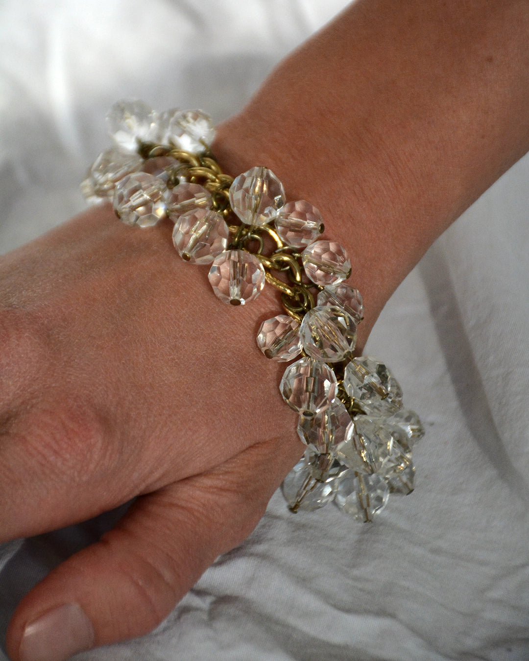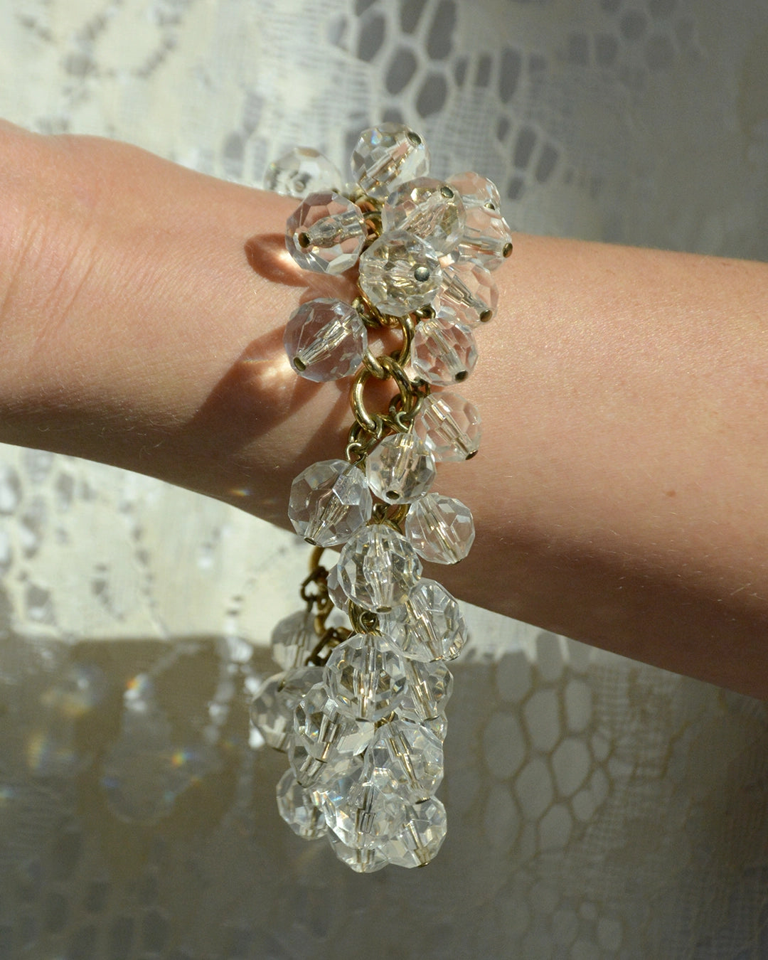Circa 1960s, this vintage faceted bead charm bracelet is such a fun piece to wear. It is just swimming with colorless faceted beads in different sizes, imitating briolette diamonds. Their dangling nature gives the piece so much movement. It's grounded by a gold-tone chain and fastens with a C-ring clasp. Measures about 8.25"; since the links are on the large size, it could also be fastened on a different part of the chain to be worn shorter, or it could easily just be shortened altogether.
