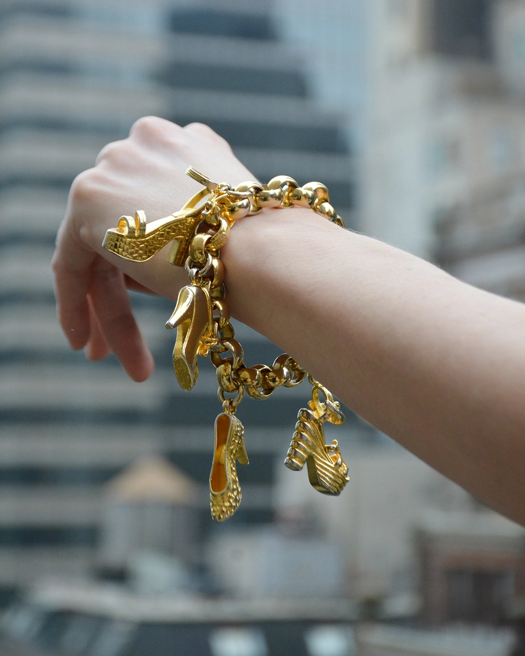 This vintage Salvatore Ferragamo shoe charm bracelet feels borrowed from Carrie Bradshaw's closet. It features oversized shoe charms, each one depicting an iconic design by Salvatore Ferragamo, including the signature patented Ferragamo "F" heel from 1947. The weight of the bracelet is really substantial! It is signed in multiple places: on the clasp, and also on each individual charm.