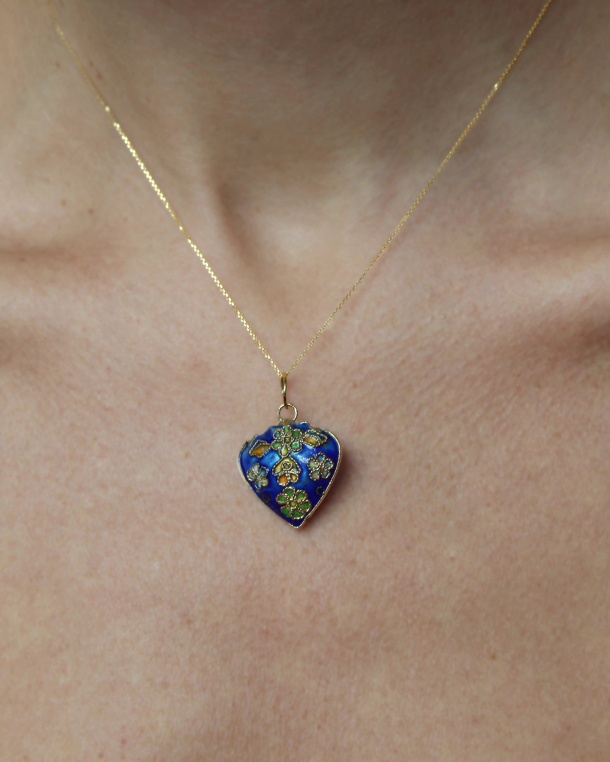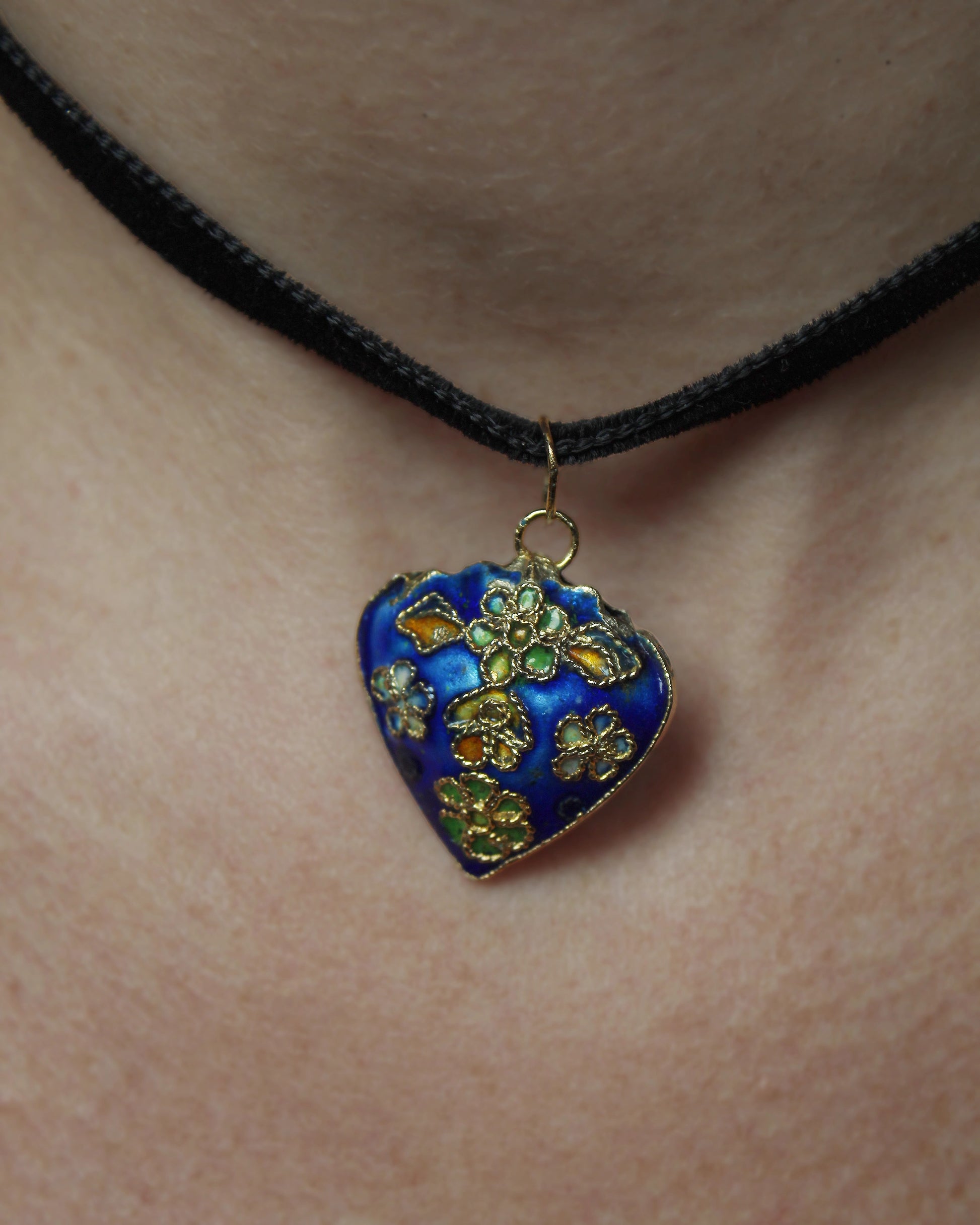 This Chinese cloisonné heart necklace is so beautiful and makes for a lovely one-of-a-kind vintage gift (or gift to yourself!). To appreciate the craftsmanship, one needs to understand the process of making cloisonné. Derived from the French word cloison (meaning "to separate") in this process fine metals are soldered to create an outline of the desired pattern. These compartments are filled with different colors of opaque enamel, and the metallic outline emphasizes the intricacy of the design. This pendant is a three-dimensional heart shape, with the same design on each side. The chain is not included, but you have the option of including either a velvet ribbon or a 14k gold chain; the bale is large enough that it would accomodate most chains you might already have.