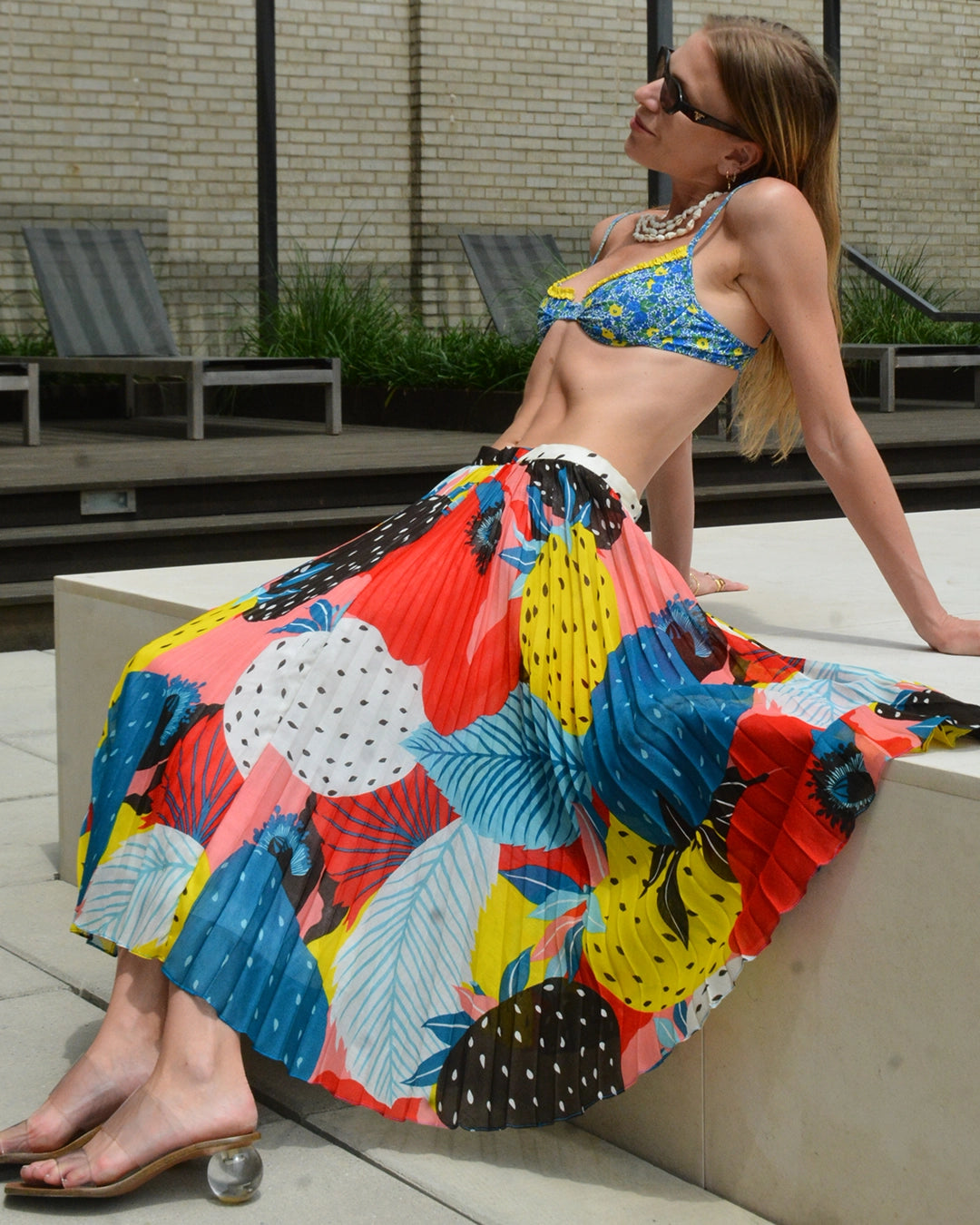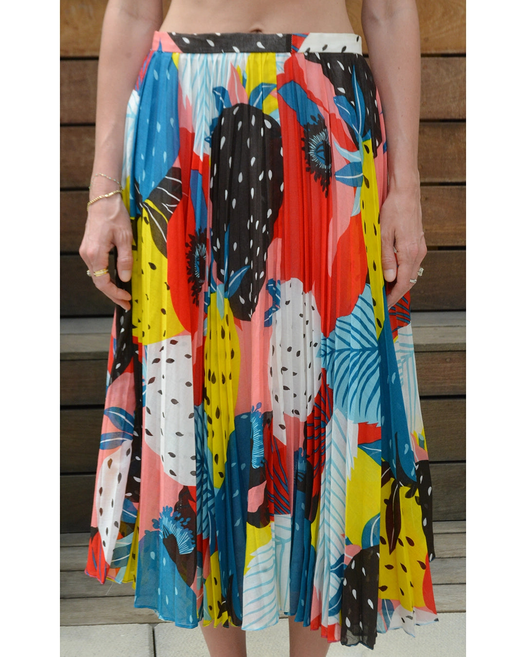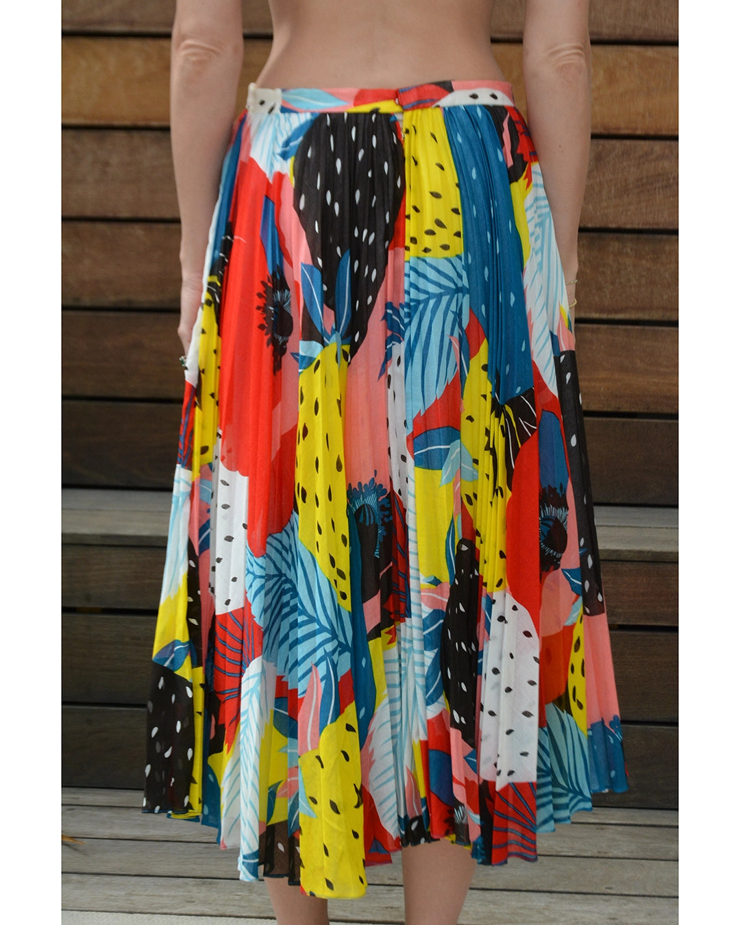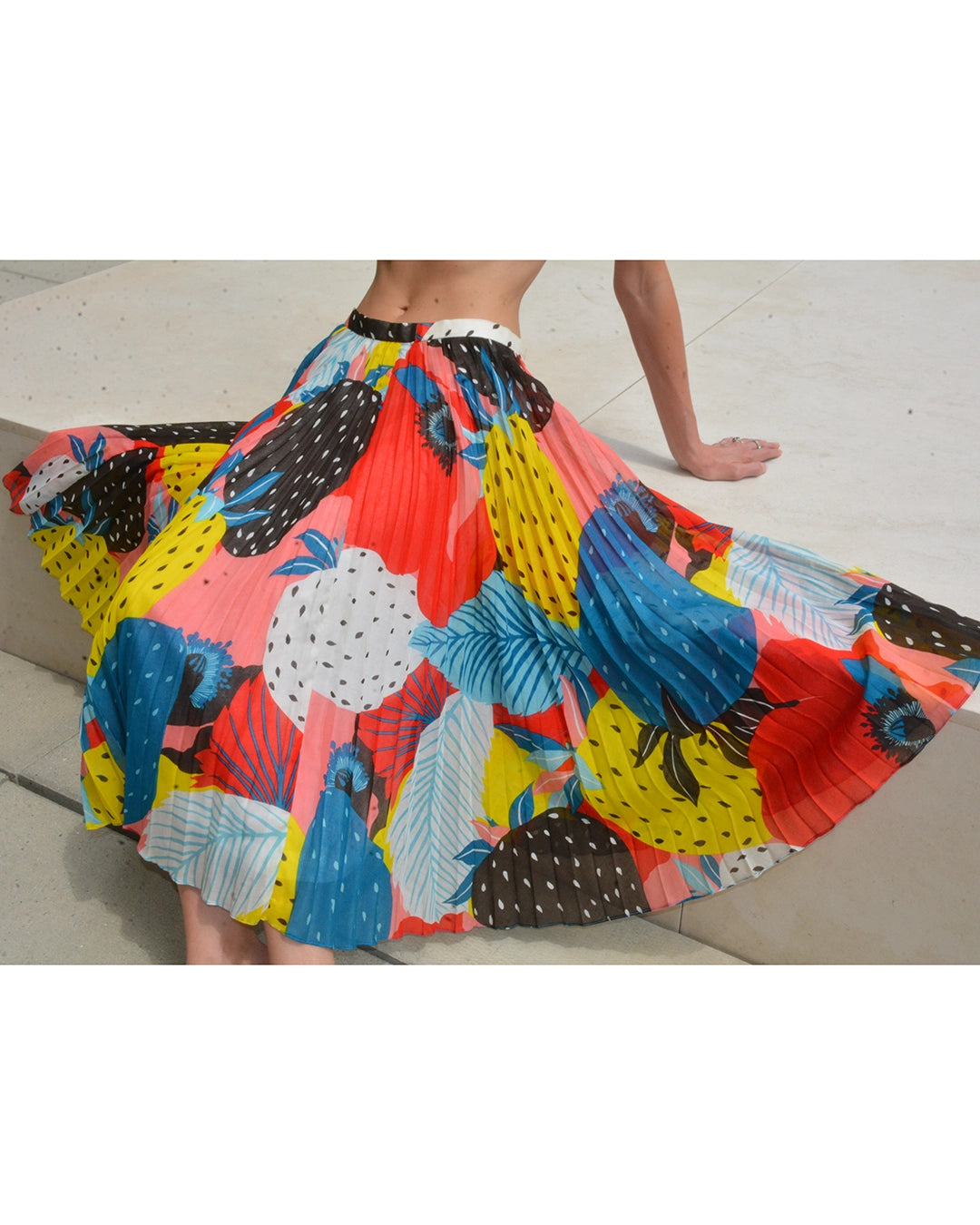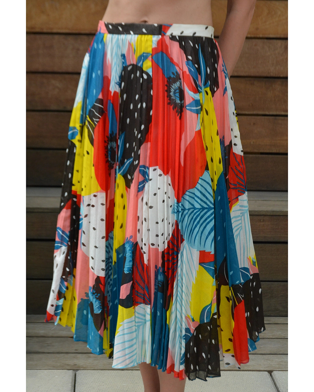 This vintage pleated midiskirt is crafted of the softest cotton voile, with sunray pleats. I love the colorful abstract fruit print— it's the type of print that really draws the eye in. It was made in France in the 1970s, and I believe it was made by French brand Cacheral, but the designed label is missing. The sheer 100% cotton voile is lined. Closes with a hook at the waistband and hidden snaps down the back, carefully designed so as not to interrupt the beauty and fluidity of pleats - so well made! It can be worn at the natural waist, or lower down towards the hips.