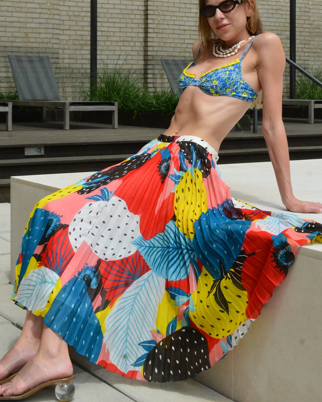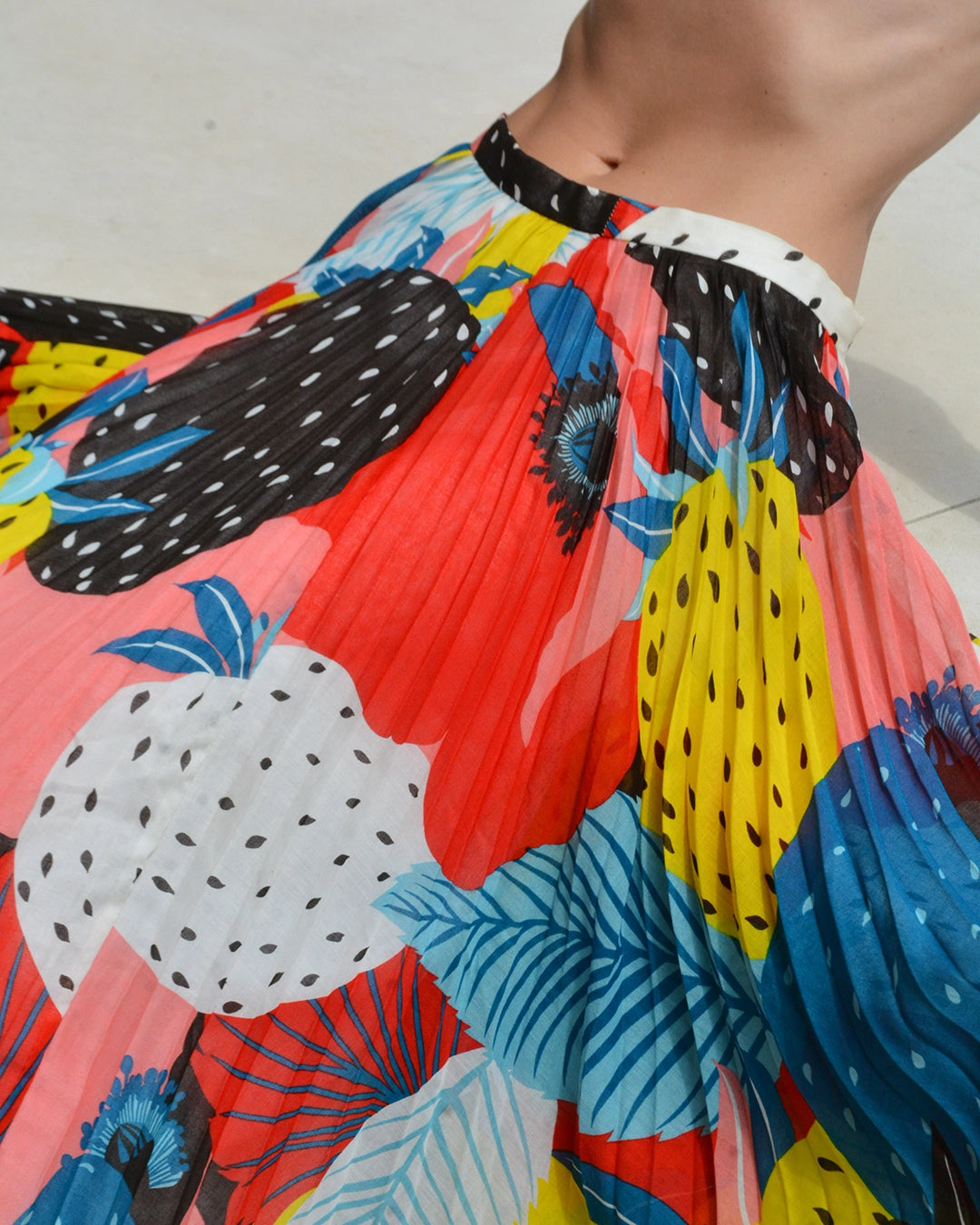 Vintage French Abstract Fruit Print Sunray Pleated Cotton Skirt