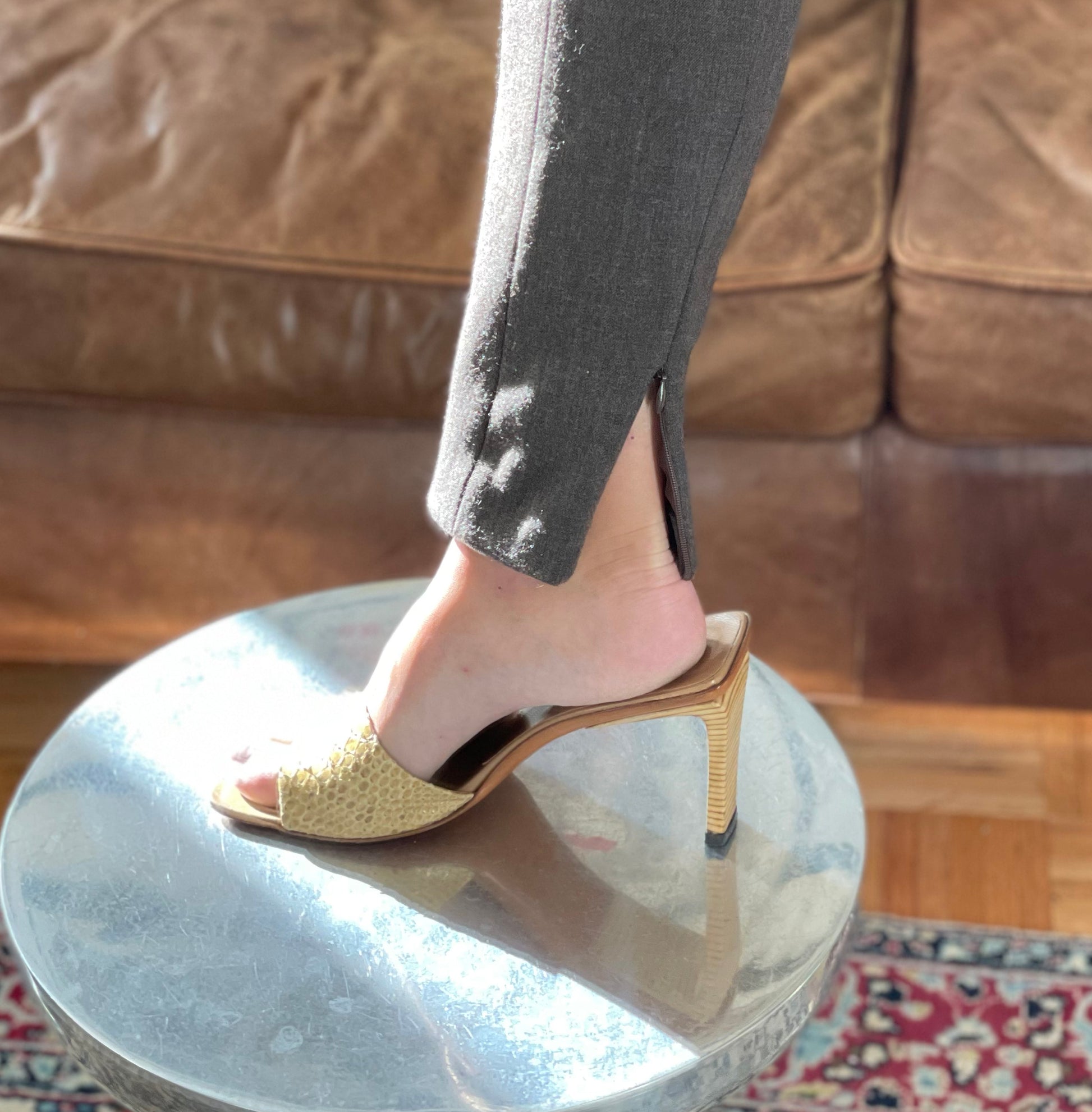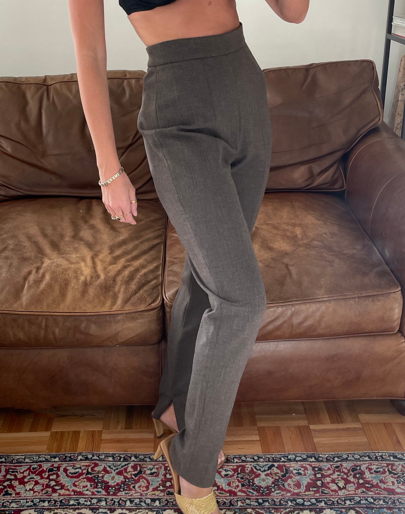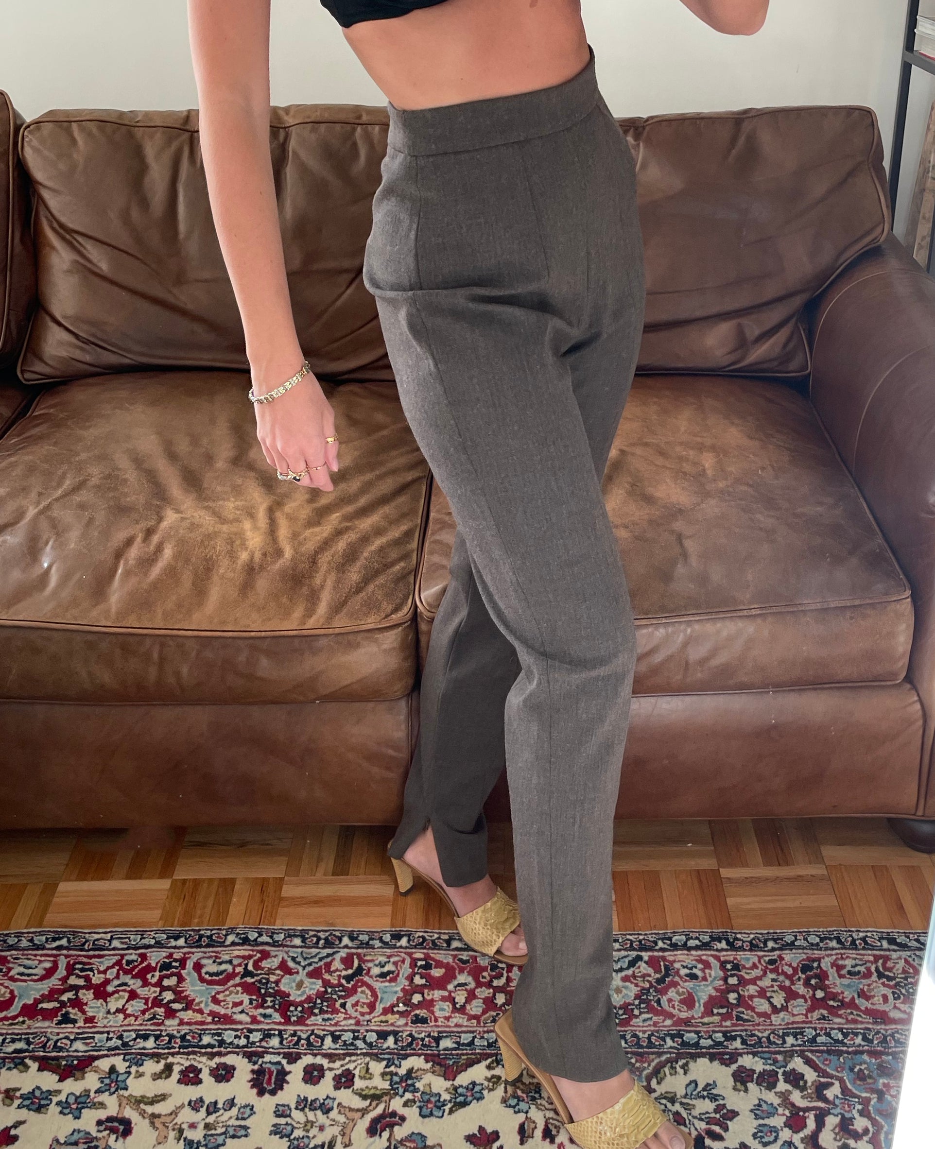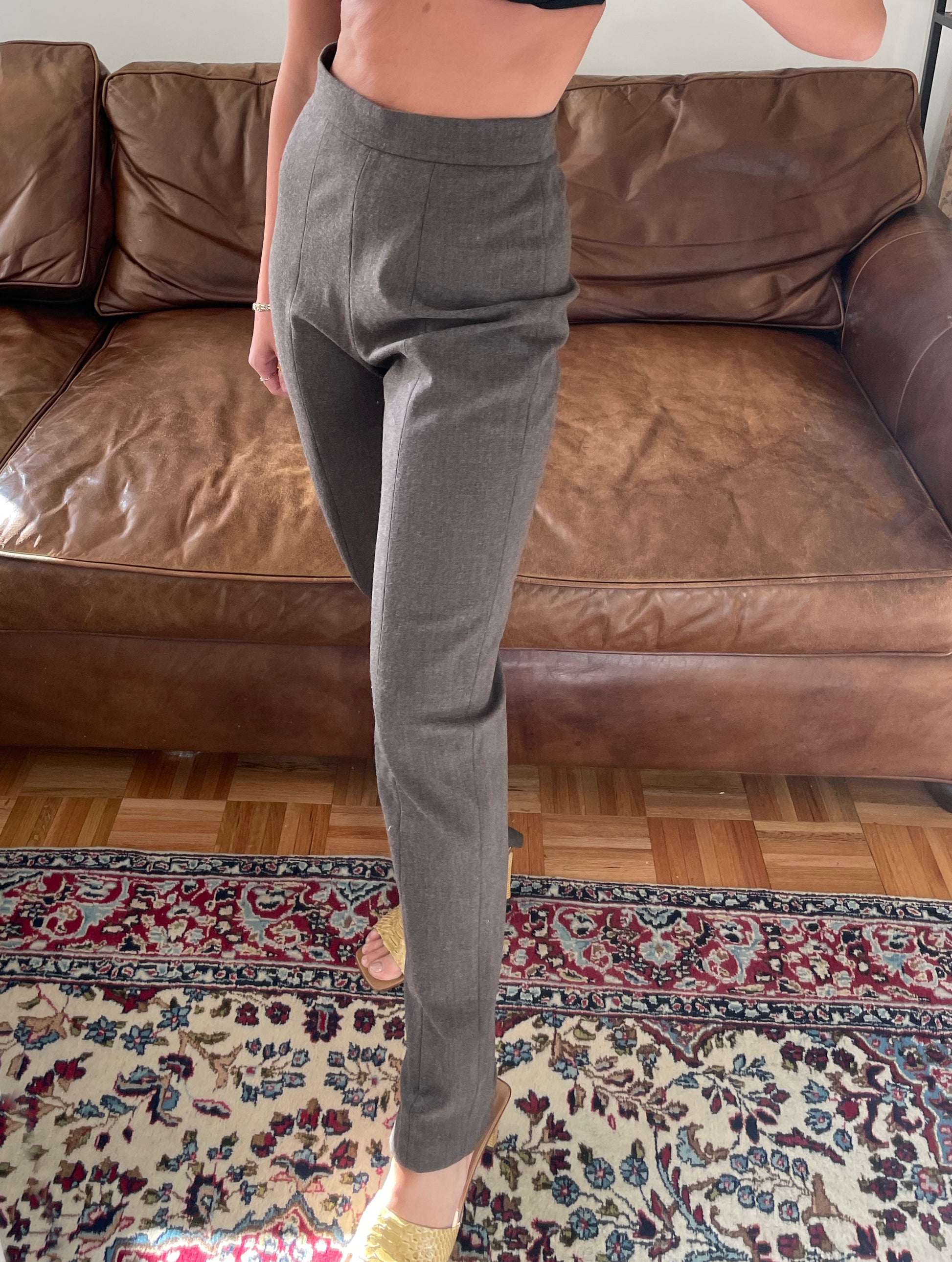 These vintage Giorgio Armani trousers are a classic wardrobe staple. The versatile taupe-colored fabric stretches, creating a great fit with a tapered hem. The vertical seams throughout contribute to that expert fit, and are also visually lengthening. The waist is super high, and the ankle features a zip for a close tapered fit (while still making it easy to get on). Made in Italy, fabric is not listed but assuming it's a wool blend with stretch.