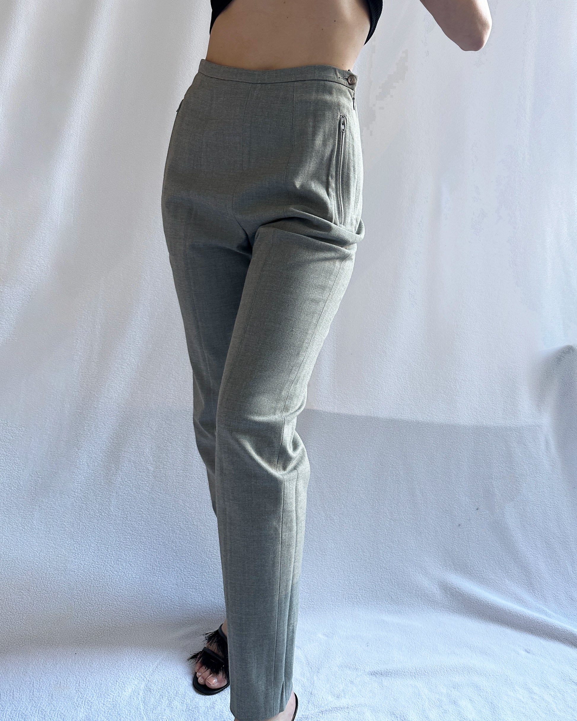 These vintage Giorgio Armani trousers are an absolute classic. They feature a high waist with a straight (slightly tapered) leg, zip pockets at hips, and zippers at the hem that can be worn open. The material has a lot of stretch; fiber contents are not listed but it is some sort of wool blend with stretch.