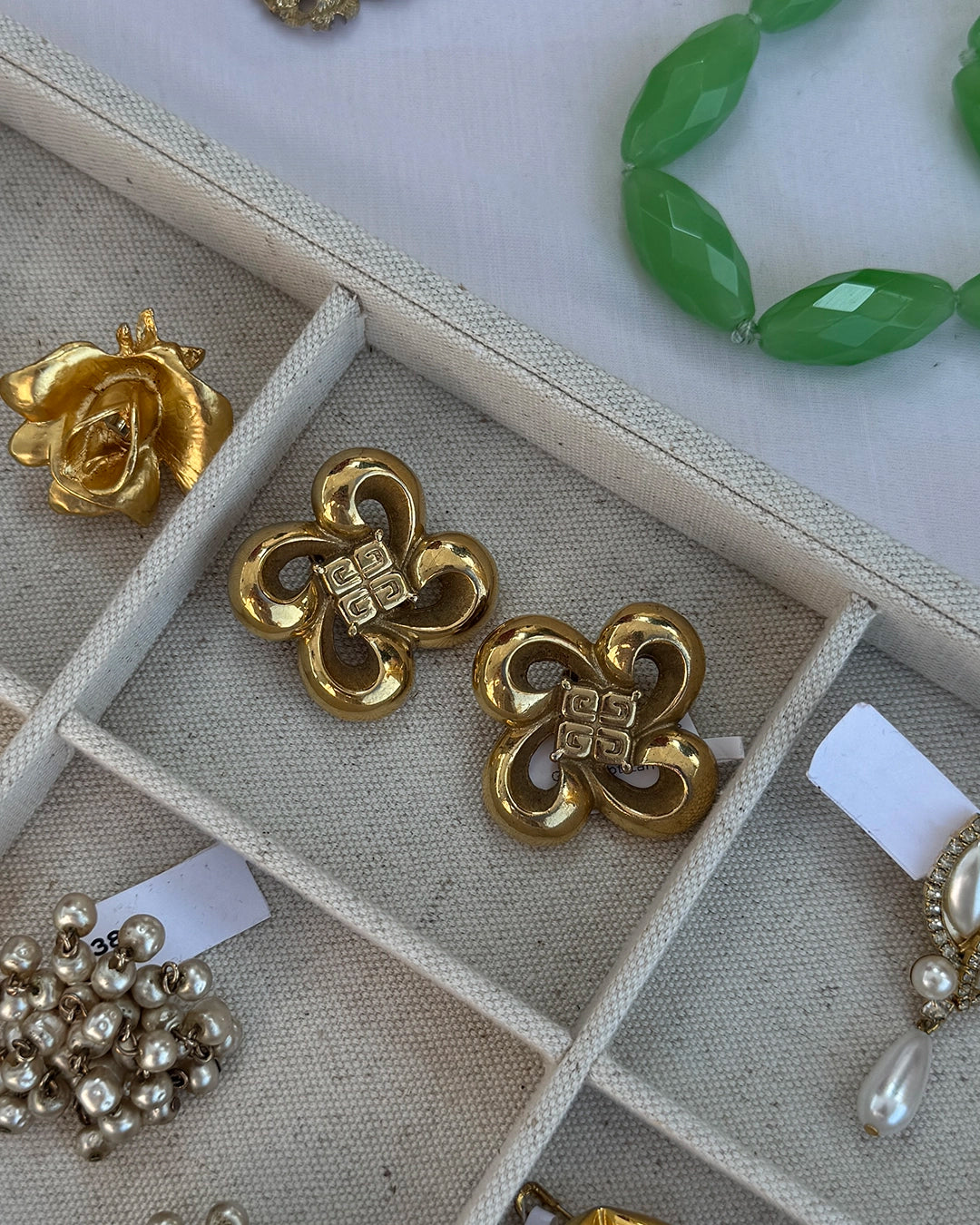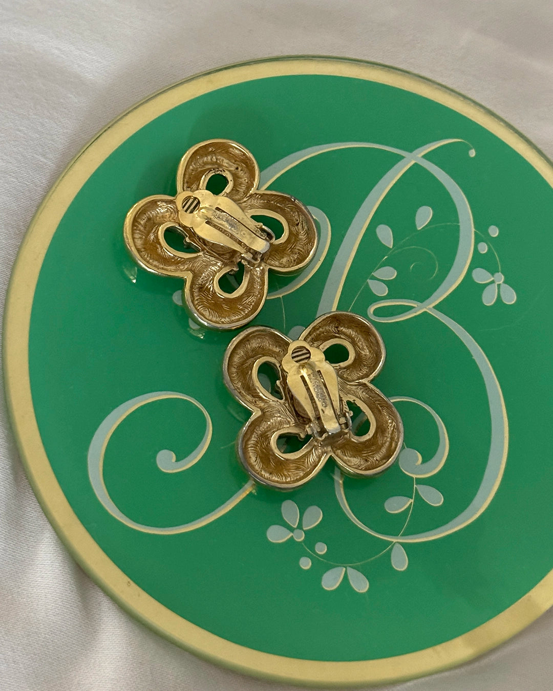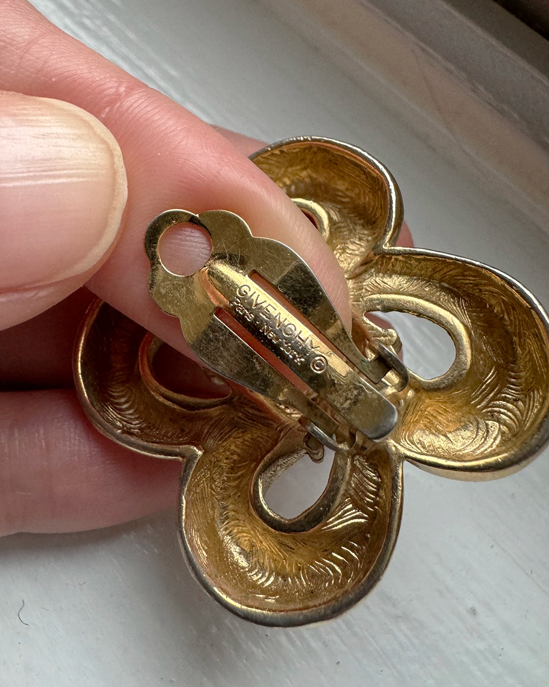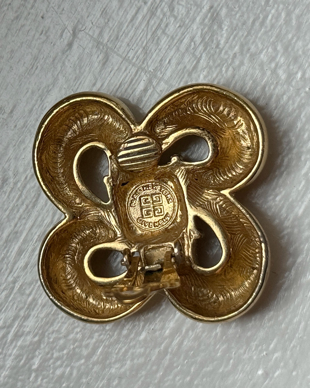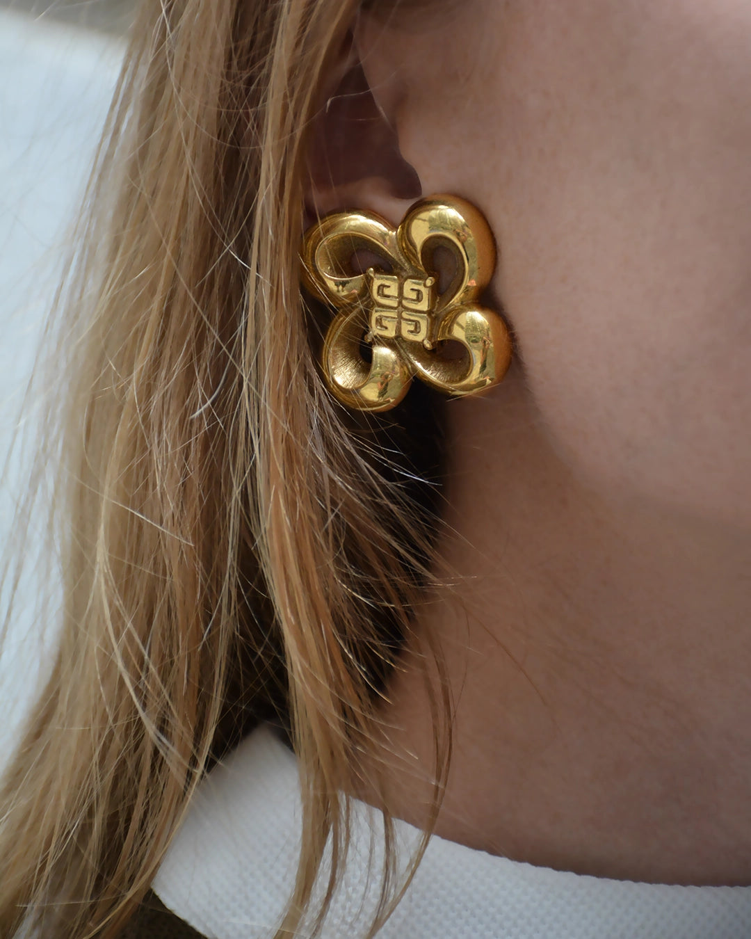 These iconic vintage Givenchy bow logo earrings appear to be a sculptural ribbon, forming a looping bow— or, perhaps an abstract flower. Either way, they are beautifully crafted and seem to be imbued with a kinetic energy. Circa 1980s, I love that the logo is a subtle part of the design and doesn't feel overt. They are signed in two places, on the lever and interior, and are finished with a clip-on lever back. They are very light on the ear, due to their intentional construction; Vintage clip-on earrings are so much more comfortable and secure to wear compared to their modern counterparts, largely due to the top quality and strategic design that went into their hand-made construction. Measures 35 mm long x 35 mm wide.
