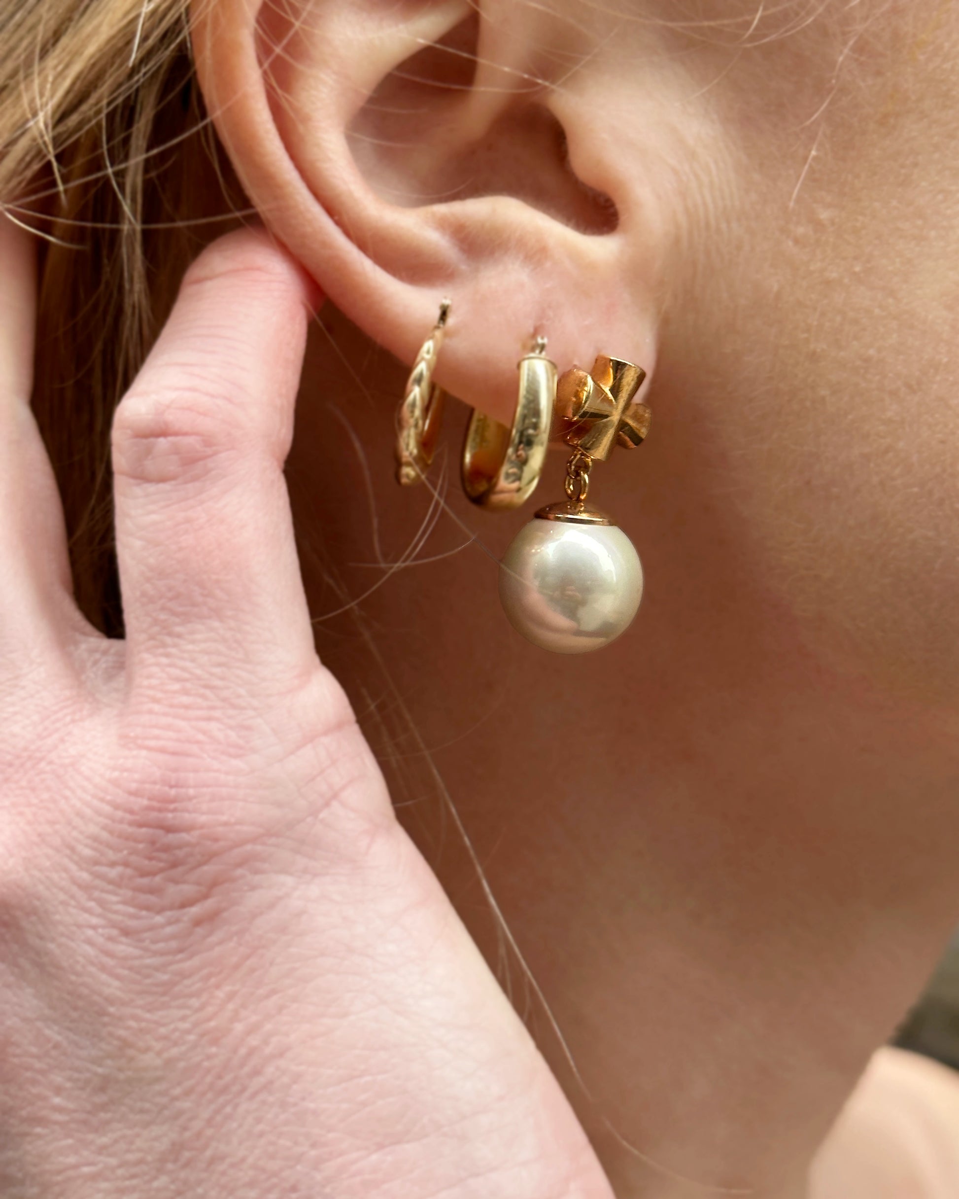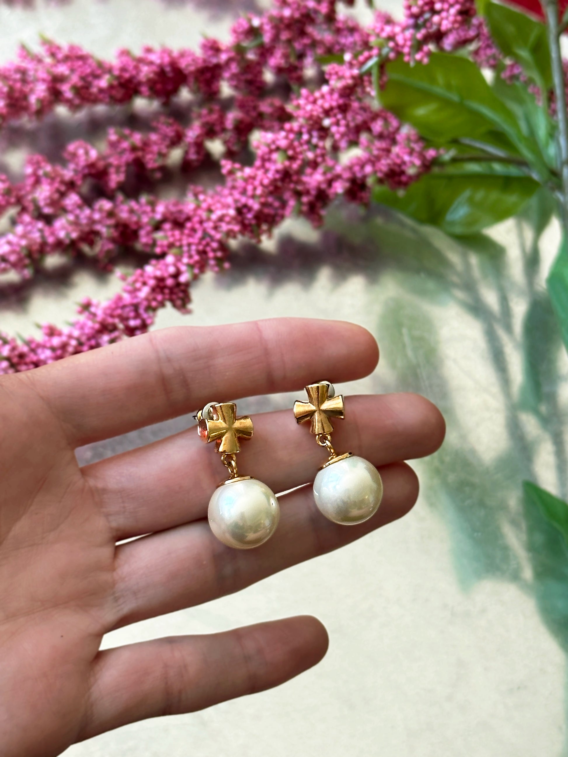 Maltese crosses are one of my favorite jewelry motifs, and have been favored throughout jewelry history by storied firms from Verdura to Chanel. The shape's place in European jewelry can be attributed in great measure to Lady Emma Hamilton, an English model, dancer and actress, and mistress of Lord Horatio Nelson. Lady Hamilton received a Maltese cross in 1800 from the Russian Emperor Paul I. As a figure in society, she was spotted wearing the cross at social events, and soon Maltese crosses, worn as pendants and brooches, became very fashionable, with the trend peaking in the 1830s. These elegant drop earrings were made in Germany and sourced in Europe, and feature a golden Maltese cross with a pearlescent drop. Finished with a post back for pierced ears. Measures 1" long.