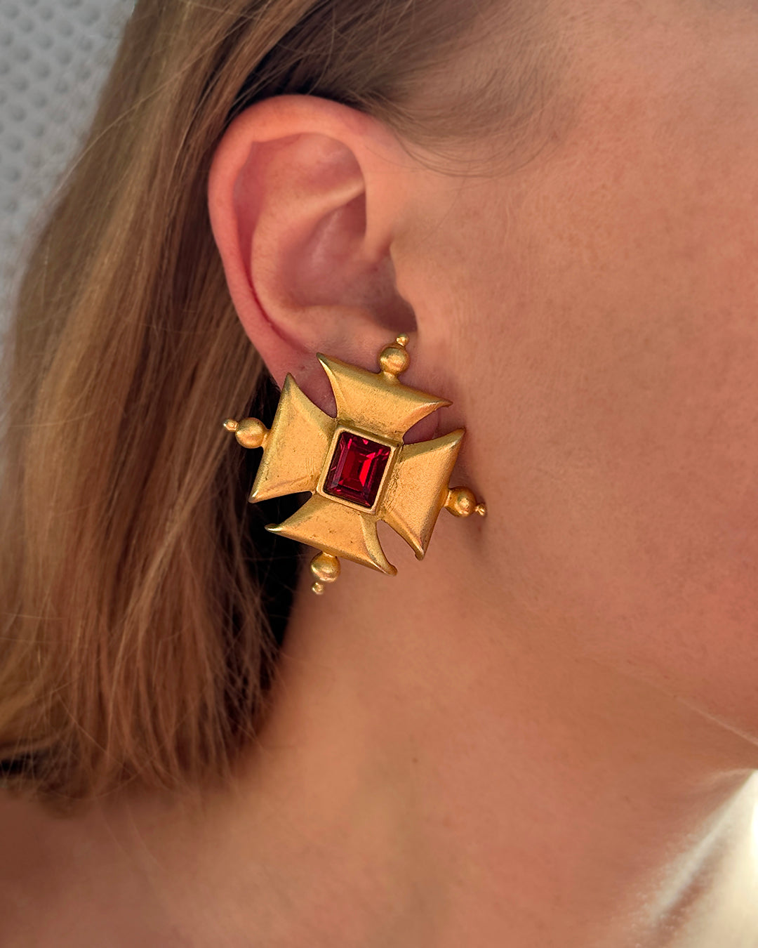 Maltese crosses are one of my favorite jewelry motifs, and have been favored throughout jewelry history by storied firms from Verdura to Chanel. The shape's place in European jewelry can be attributed in great measure to Lady Emma Hamilton, an English model, dancer and actress, and mistress of Lord Horatio Nelson. Lady Hamilton received a Maltese cross in 1800 from the Russian Emperor Paul I. As a figure in society, she was spotted wearing the cross at social events, and soon Maltese crosses, worn as pendants and brooches, became very fashionable, with the trend peaking in the 1830s. These stately crosses have a matte gold finish, set with an emerald-cut paste ruby. They measure 1.75" long and wide, and are finished with a clip-on lever back.