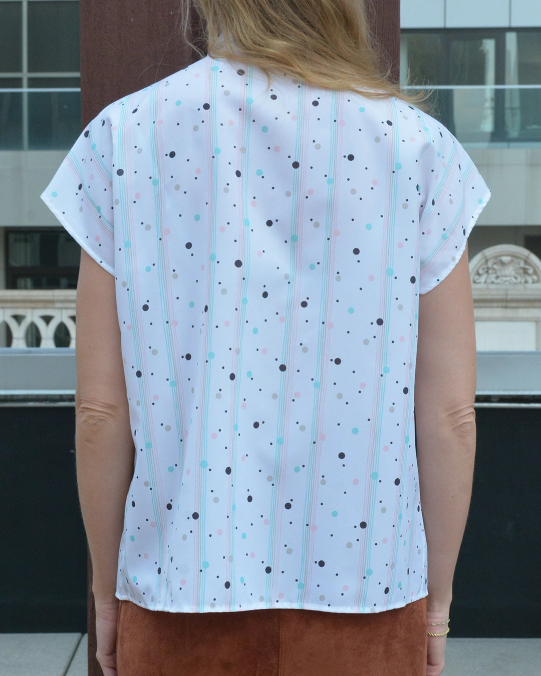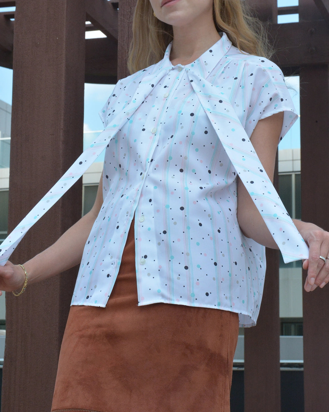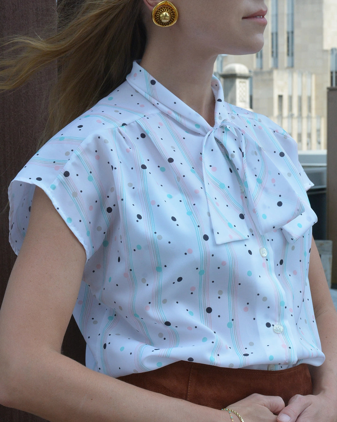 This vintage graphic print pussybow blouse is such a fun piece with a retro feeling. Made in the USA in the late 1970s/early 1980s, the fabric is really great because it maintains a crispness and doesn't wrinkle easily, but it is also lightweight and feels more breathable (not overly synthetic). It features grown-on dolman cap sleeves. The scarf at the neck is attached, and can be worn a number of ways, including tied in a bow. The skirt can also be styled tucked in, or not, or even tied at the waist.