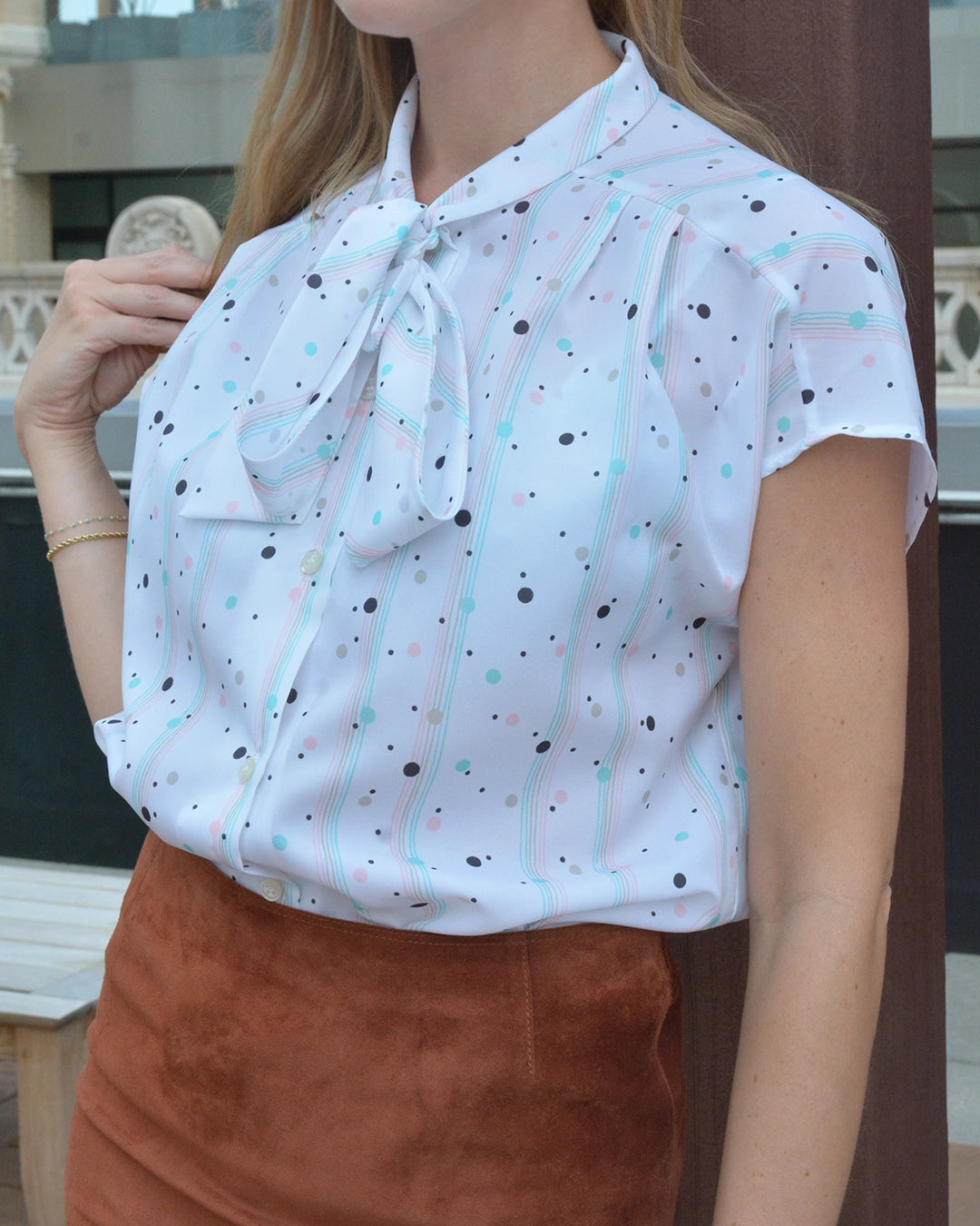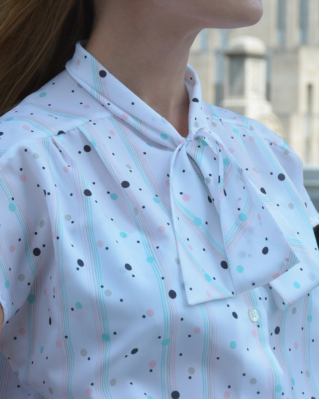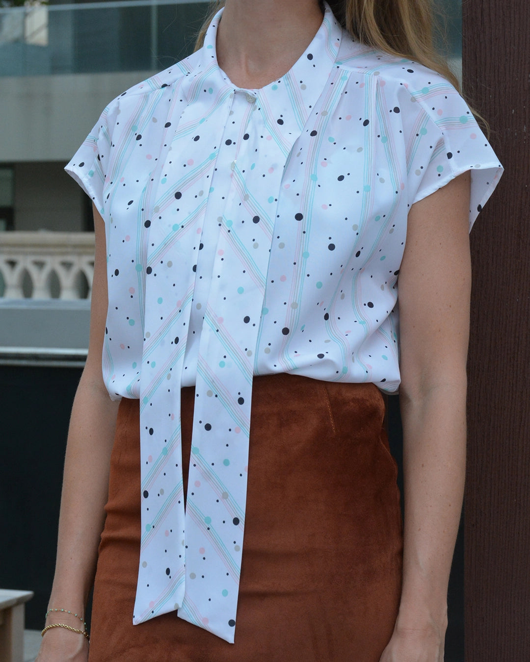 This vintage graphic print pussybow blouse is such a fun piece with a retro feeling. Made in the USA in the late 1970s/early 1980s, the fabric is really great because it maintains a crispness and doesn't wrinkle easily, but it is also lightweight and feels more breathable (not overly synthetic). It features grown-on dolman cap sleeves. The scarf at the neck is attached, and can be worn a number of ways, including tied in a bow. The skirt can also be styled tucked in, or not, or even tied at the waist.