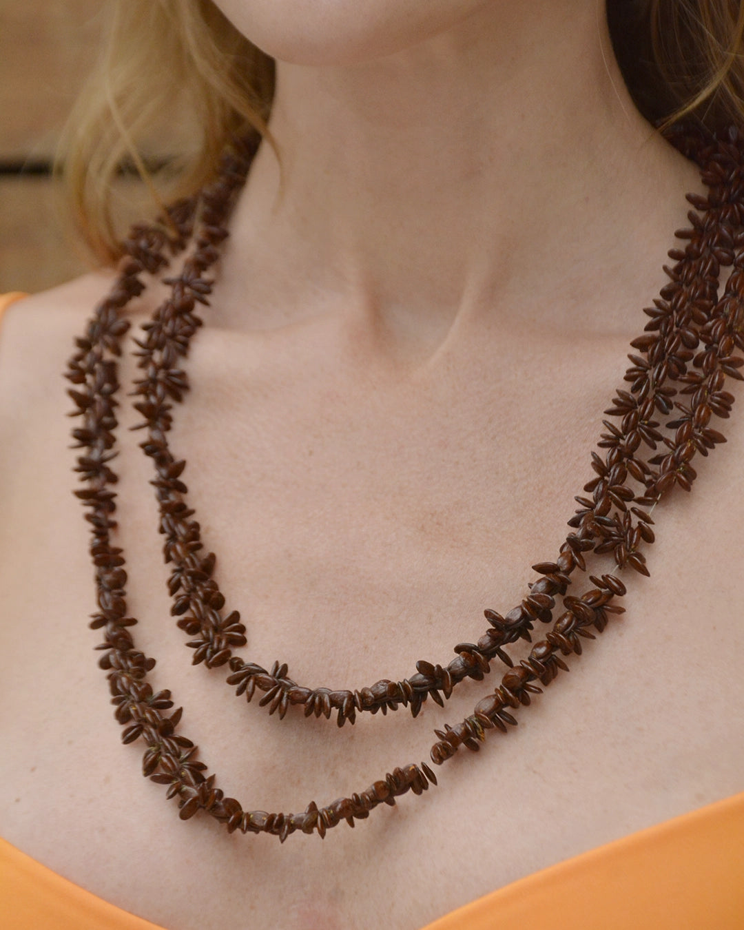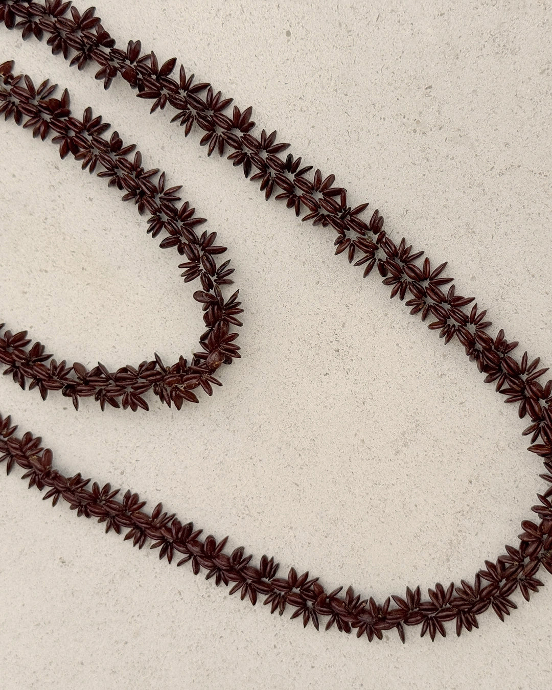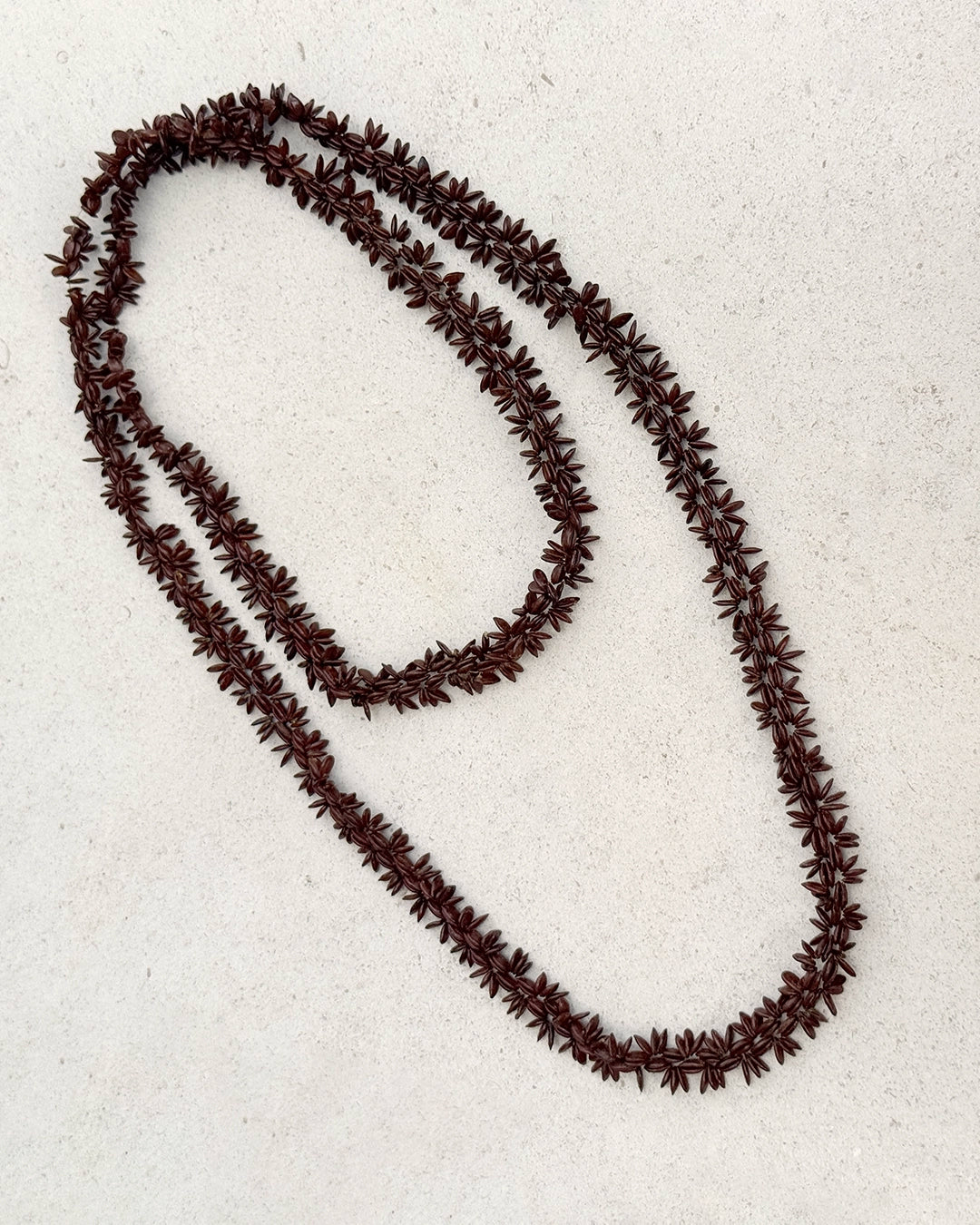With a laidback, beachy spirit, this one-of-a-kind vintage Koa seed necklace is extra long, making it possible to wear a number of ways: doubled, tripled, or even styled as a belt, wrapped around the wrist as a bracelet... it's even a work of a art that one might display around the home! It is made by hand with genuine Hawaiian Koa seeds, woven together in a star formation. Koa wood has been highly valued by natives to Hawaiʻi for centuries; Koa means "warrior" in Hawaiian. Laid flat, the total drop measures abut 25.75" (so doubled, the total length would be 51.5"). Note there is no clasp.