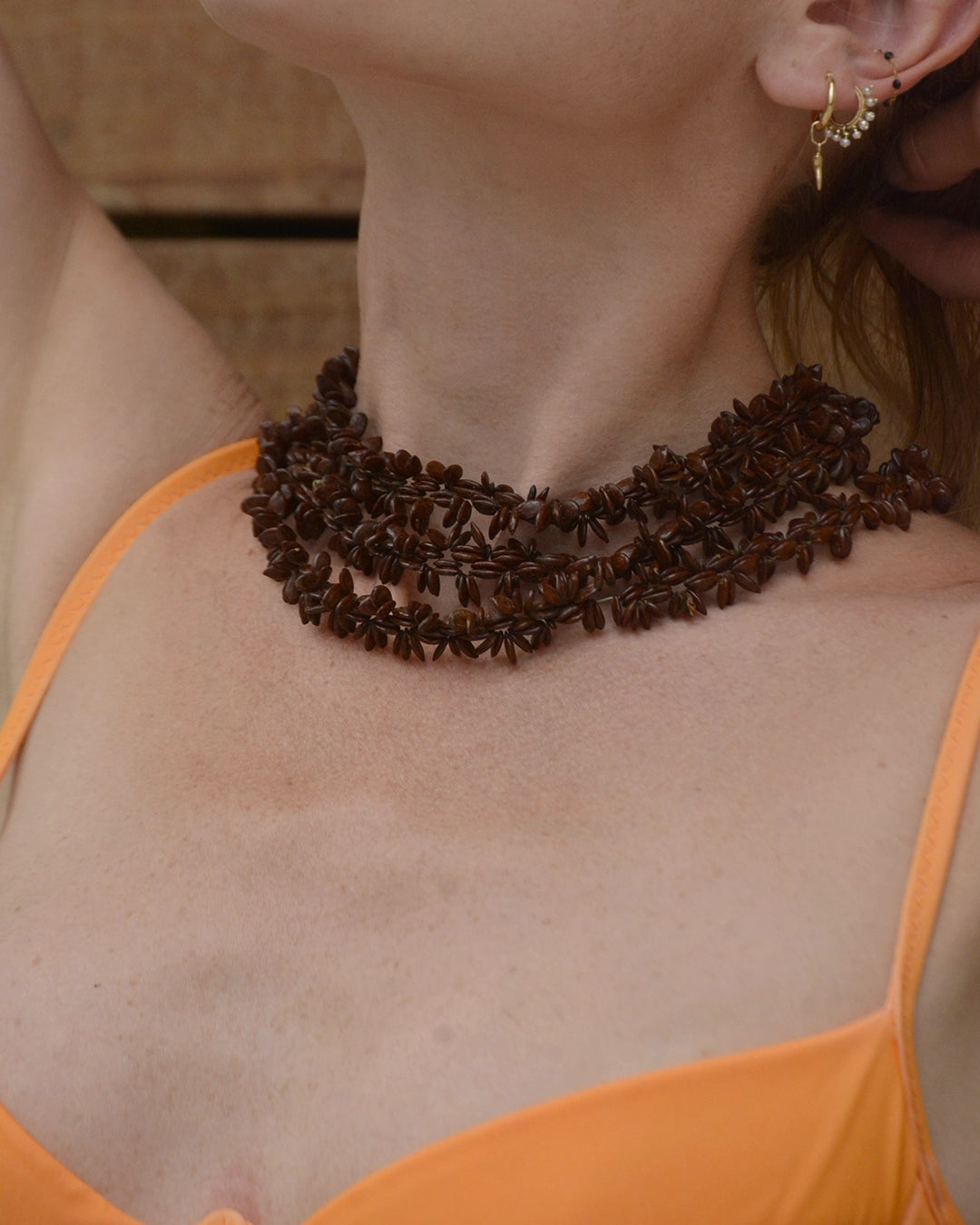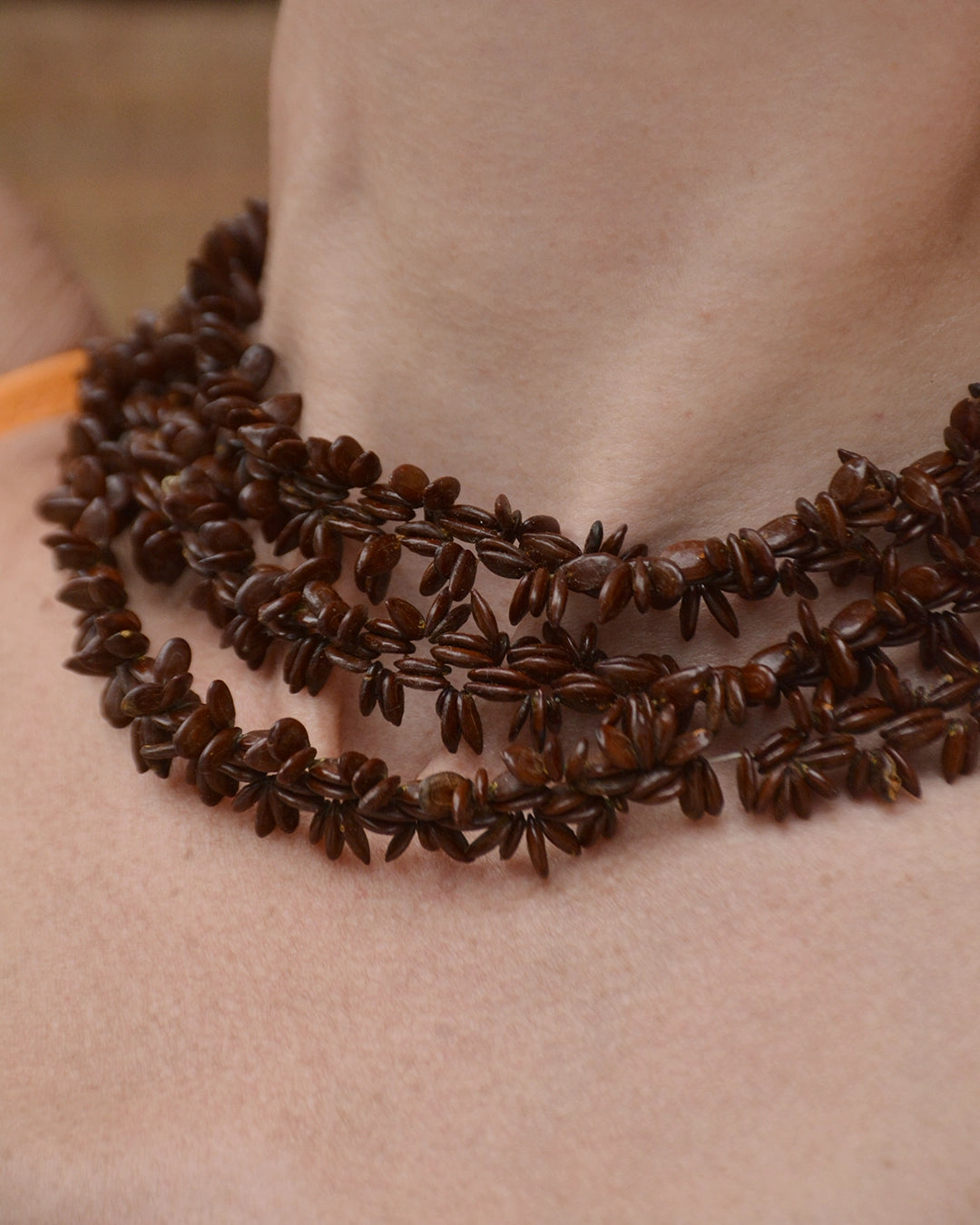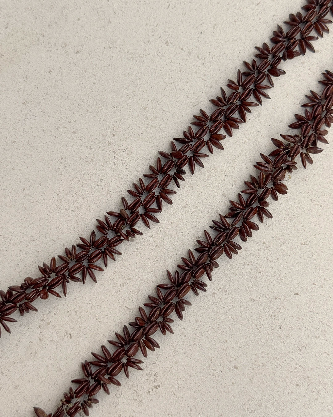 With a laidback, beachy spirit, this one-of-a-kind vintage Koa seed necklace is extra long, making it possible to wear a number of ways: doubled, tripled, or even styled as a belt, wrapped around the wrist as a bracelet... it's even a work of a art that one might display around the home! It is made by hand with genuine Hawaiian Koa seeds, woven together in a star formation. Koa wood has been highly valued by natives to Hawaiʻi for centuries; Koa means "warrior" in Hawaiian. Laid flat, the total drop measures abut 25.75" (so doubled, the total length would be 51.5"). Note there is no clasp.
