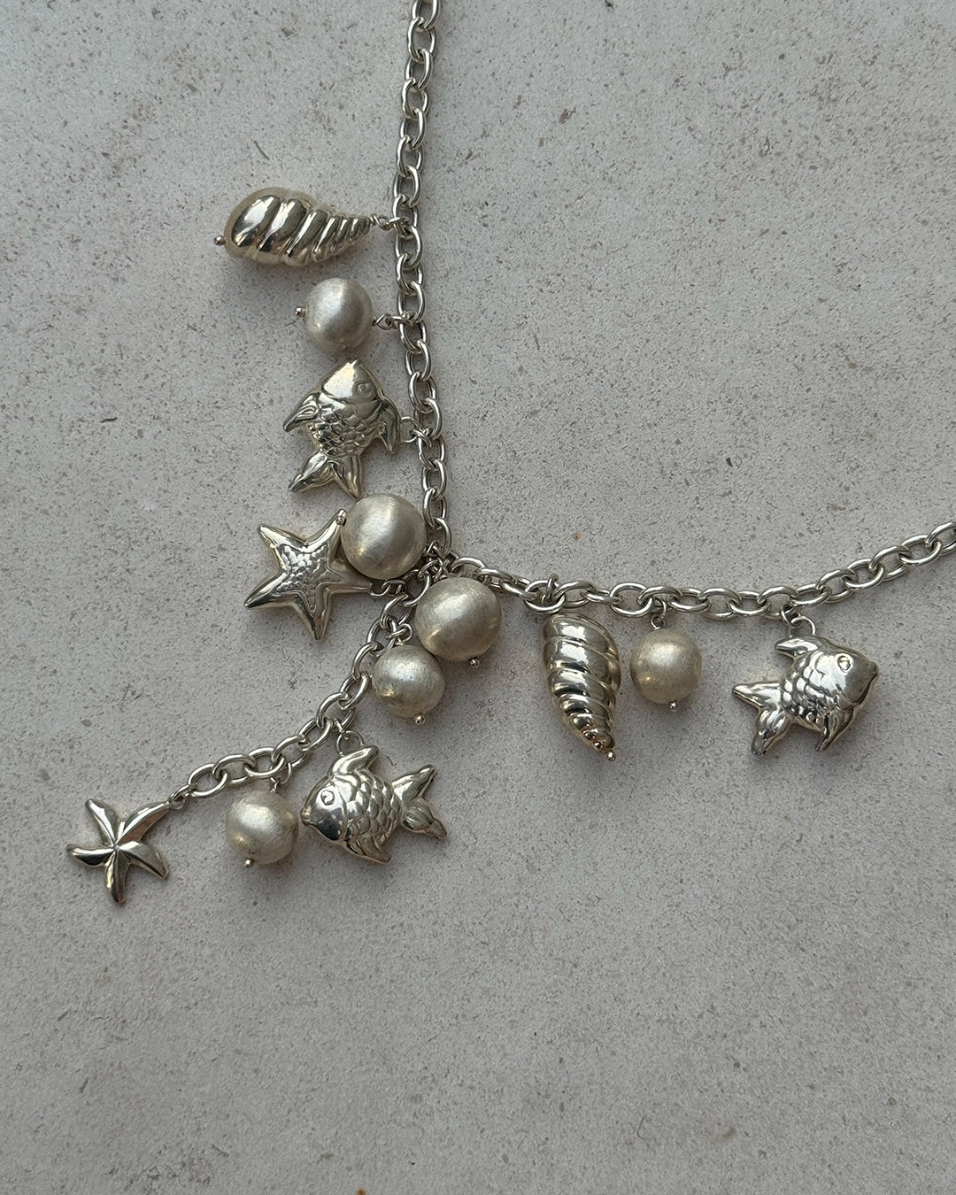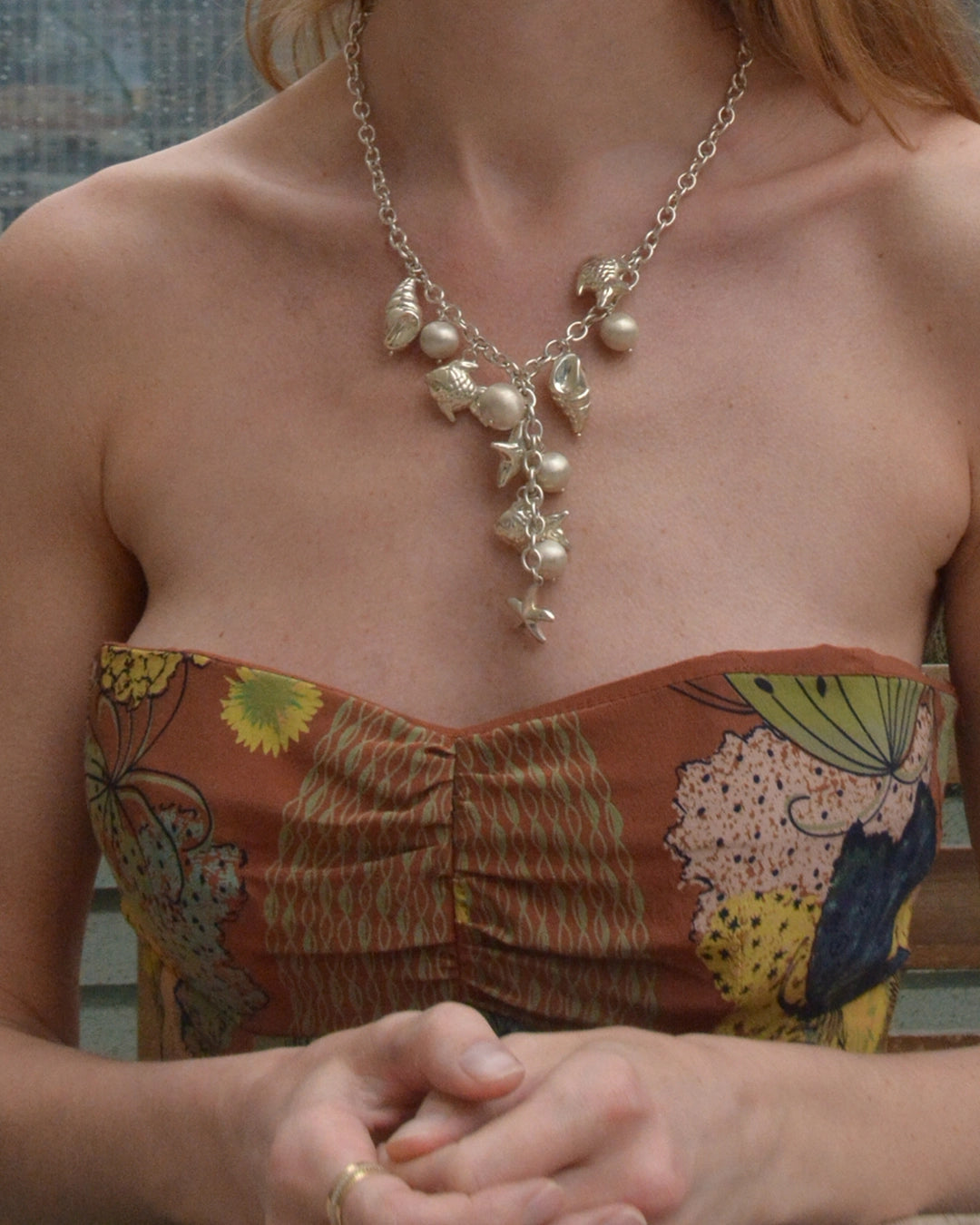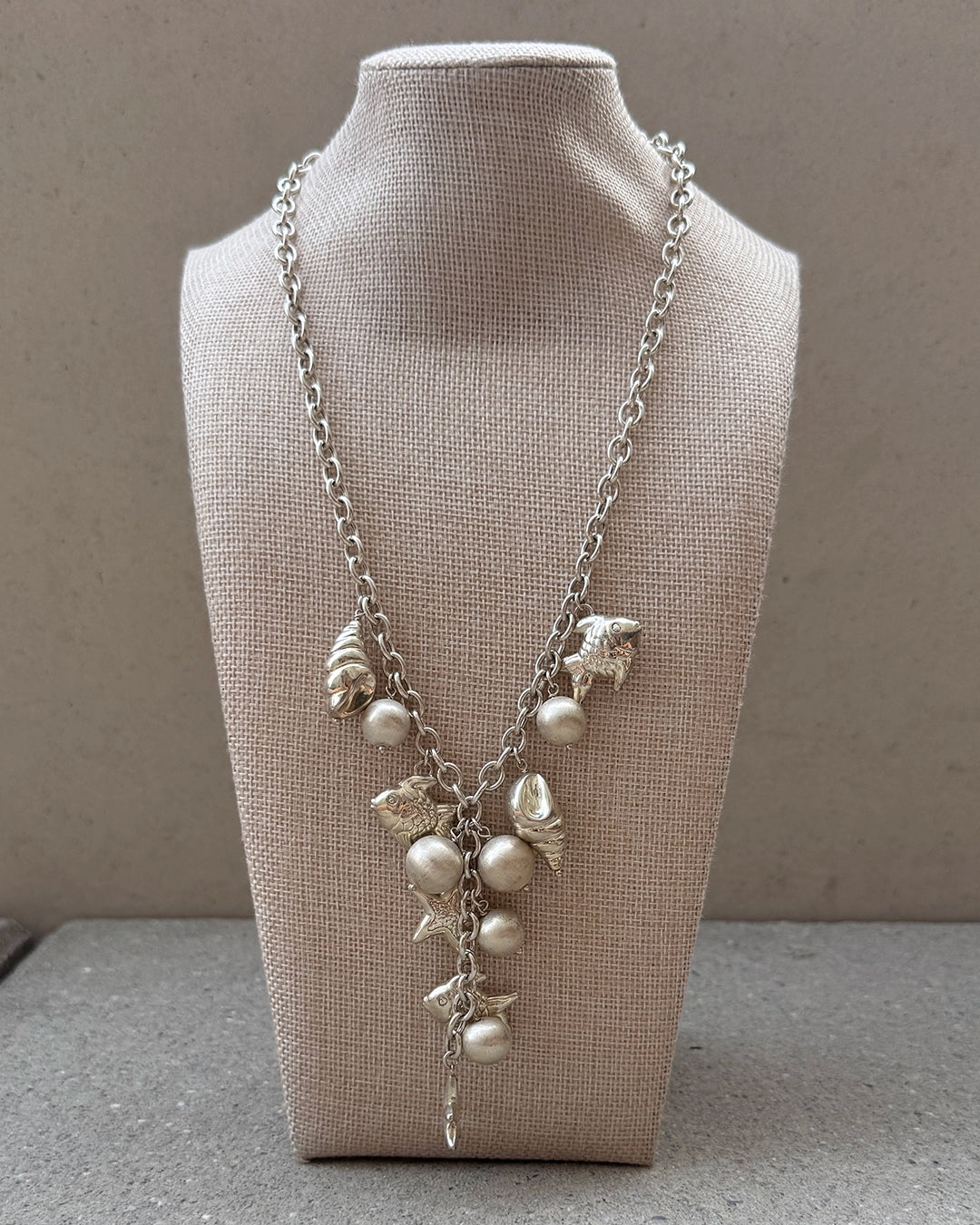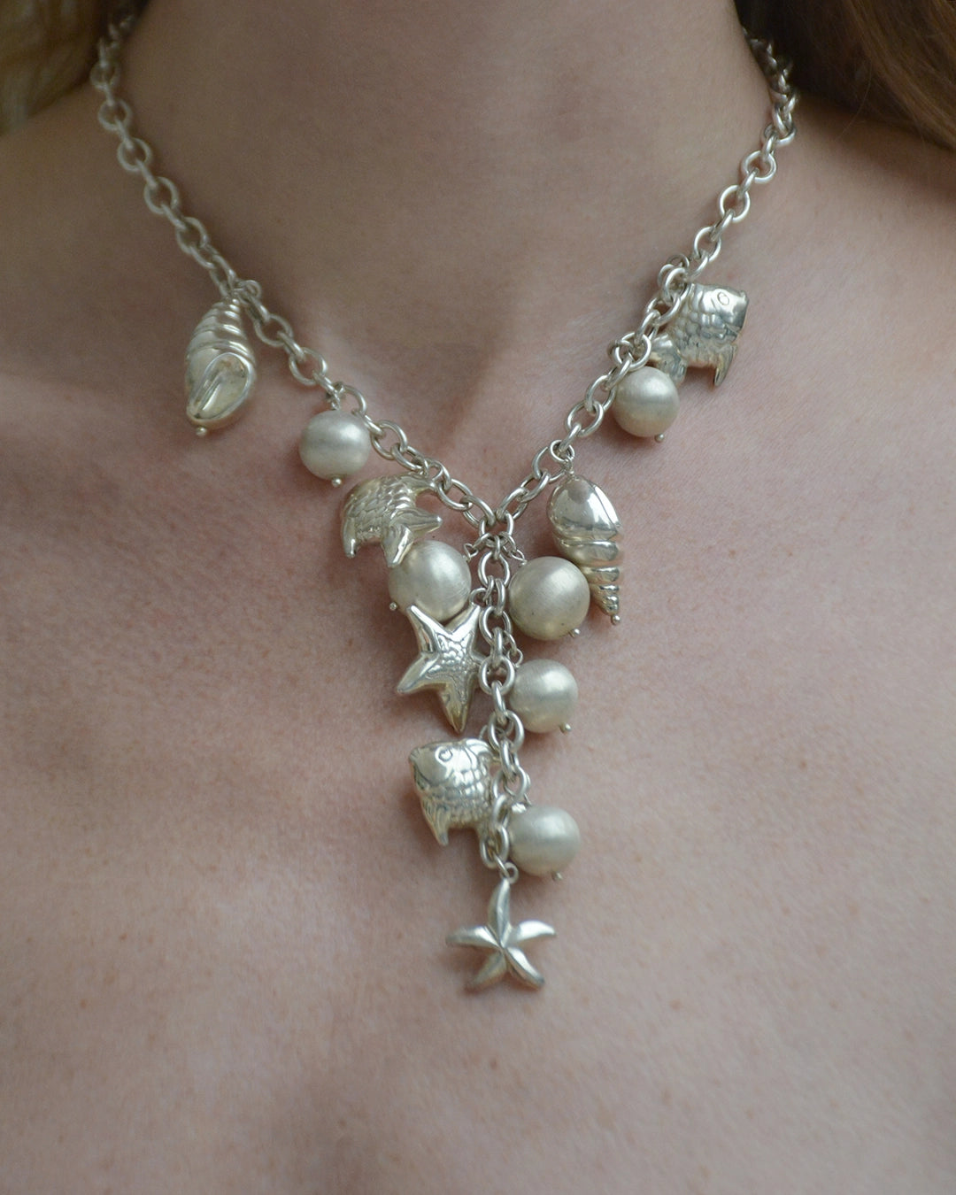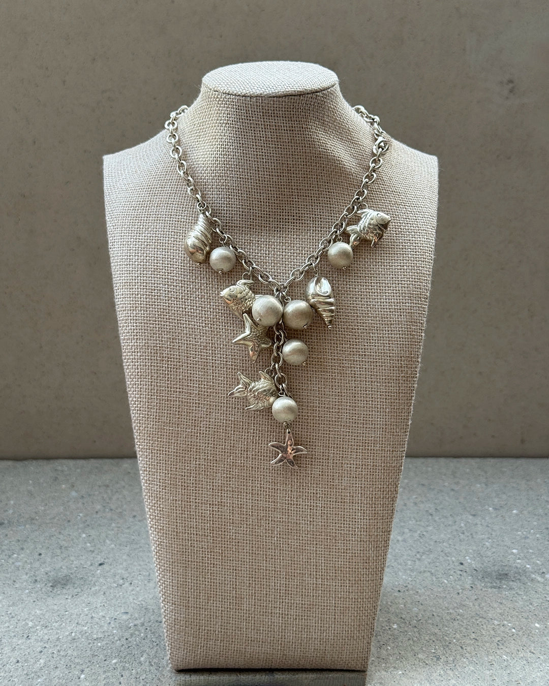 Made in Italy, this vintage sterling silver lariat charm necklace features charms of seashells, starfish, fish, and silver orbs. I love the soft brushed look of the silver. Made of sterling silver, the charms are hollow, so it doesn't feel too heavy when worn. The lobster clasp can attach to any link on the chain, making the length adjustable. The maximum length is 20.25", but it can be worn much shorter, at more of a choker length. The lariat drop length is about 3.5". Hallmarked "Italy" and 925 for sterling silver.