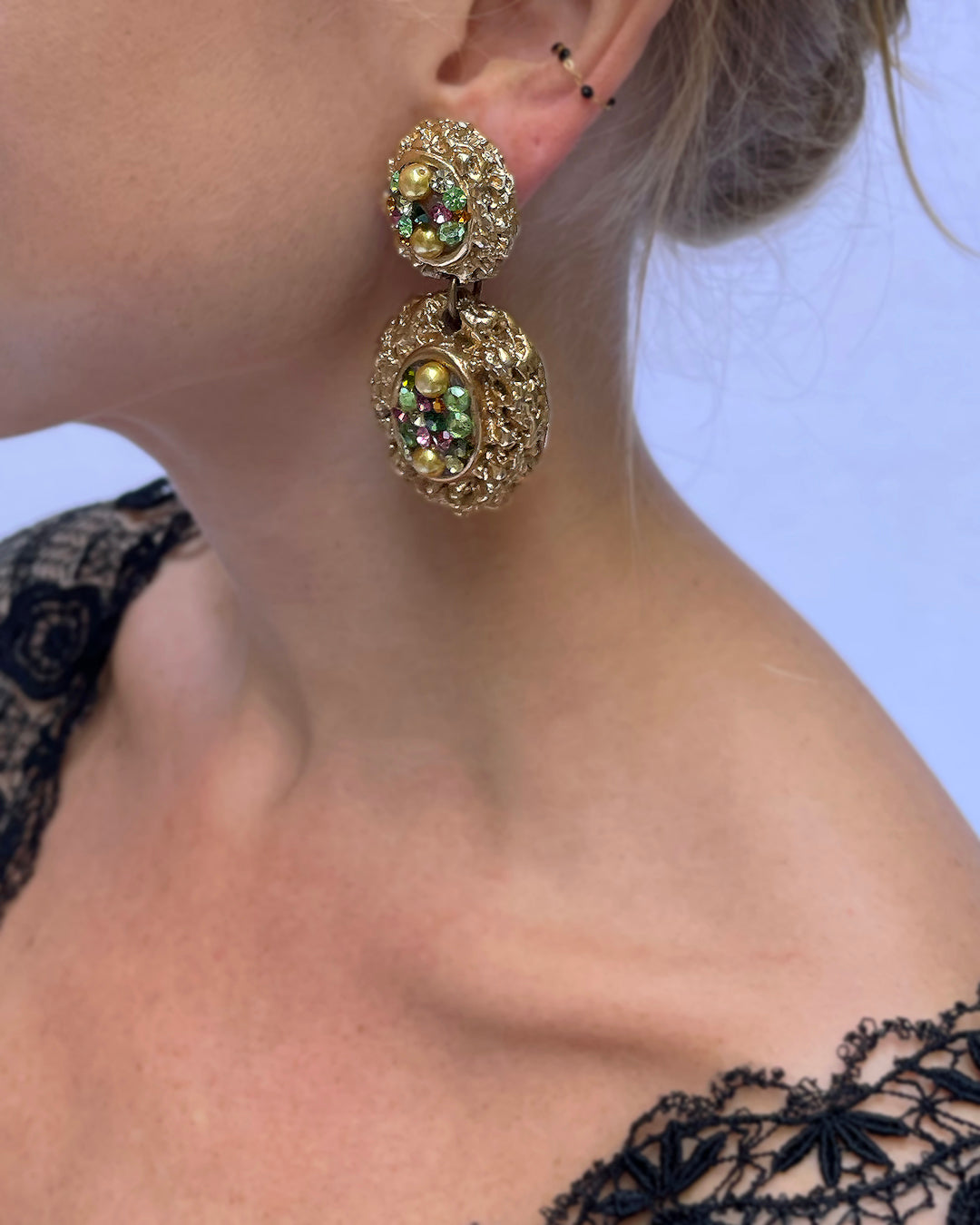 The only thing cooler than this earring is the fact that there is only one of them! HOW chic?! Wear them with just a tiny little stud or gold huggie in the other ear. These earrings feature a brushed gold surface, textured with swirling, and set with multicolor stones. The drop provides movement, and added drama. Made by famed Parisian jeweler Jacky de G in the 1980s, they feature a brushed gold metal in a Celtic-knot formation, with bezel-set faceted stones reminiscent of moonstone, reflecting brilliant sparkle with every movement. Statement earrings and jewelry defined the style of the 1980s; French jewelry of this period was influenced by the runways of the big couturiers in a way we no longer see. The best jewelers worked for the big houses like Jean-Paul Gaultier, Guy Laroche, Givenchy, Dior, Chanel, Christian Lacroix and among them was the jeweler known as Jacky de G. She produced jewelry for her own label (which is signed as such) as well as for these houses, so her designs and sensibility having an immeasurable influence. Her jewelry was only produced for a short period in the 1980s, which makes it highly sought-after and collectable. These earrings are signed Jacky de G / Made in France. Measures about 6.5 cm total length x about 3 cm at widest point, and finished with a clip-on back.