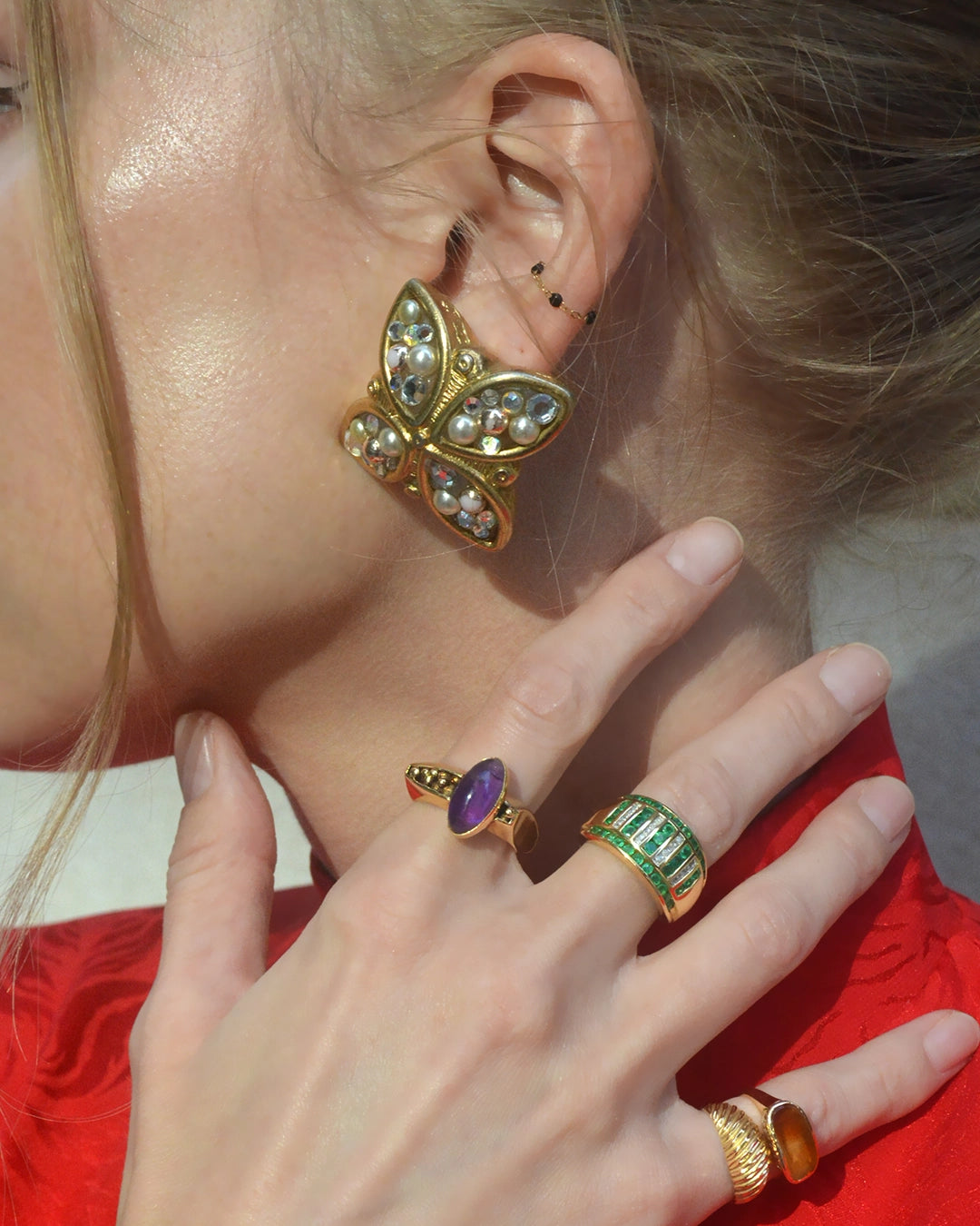 The Vintage Red Silk Wiggle Dress, Vintage Gold Organza Princess-Cut Gown, Vintage Amethyst Cabochon 14k Gold Ring, and Vintage Emerald and Diamond Gold Bombe Ring pictured are also available.
