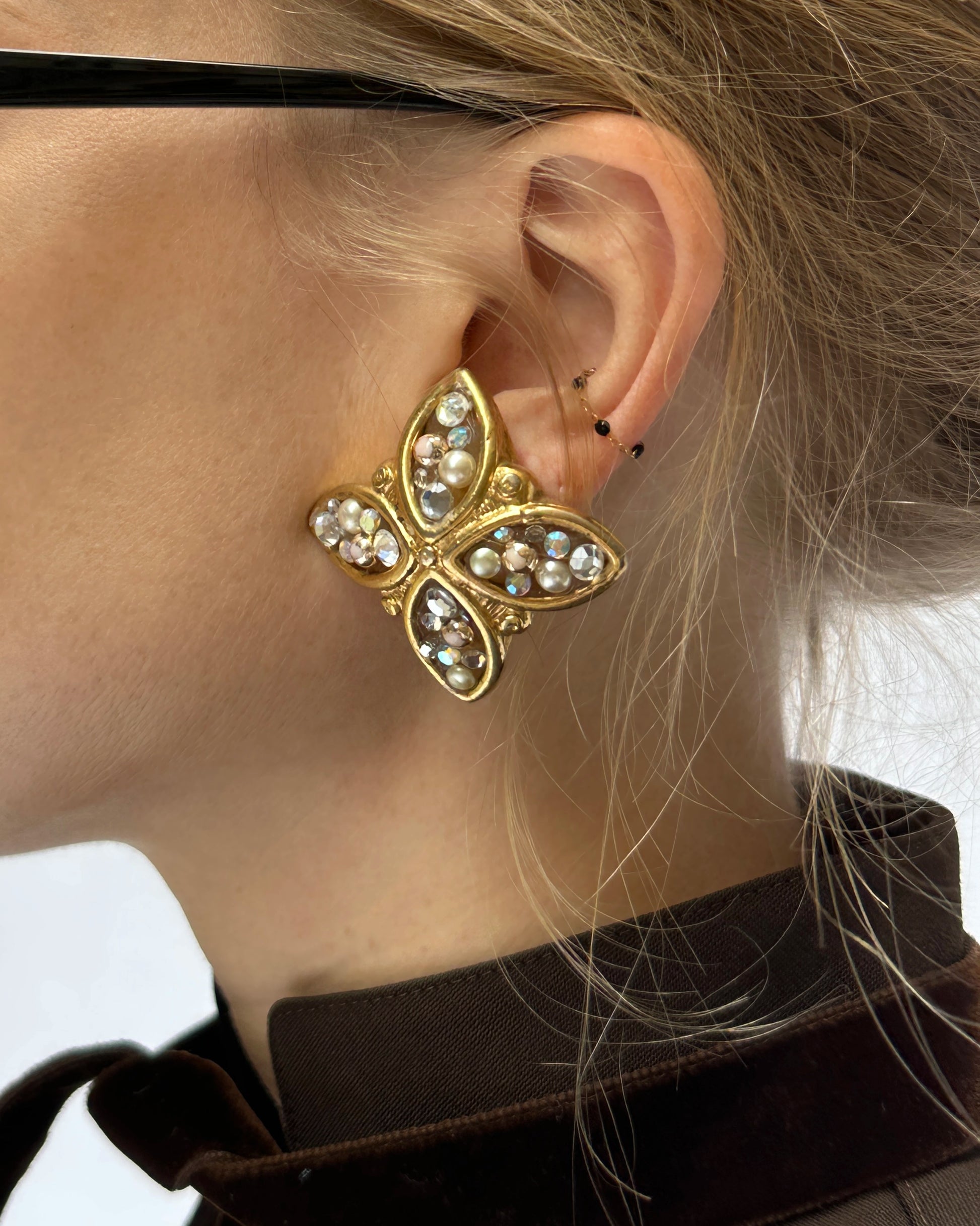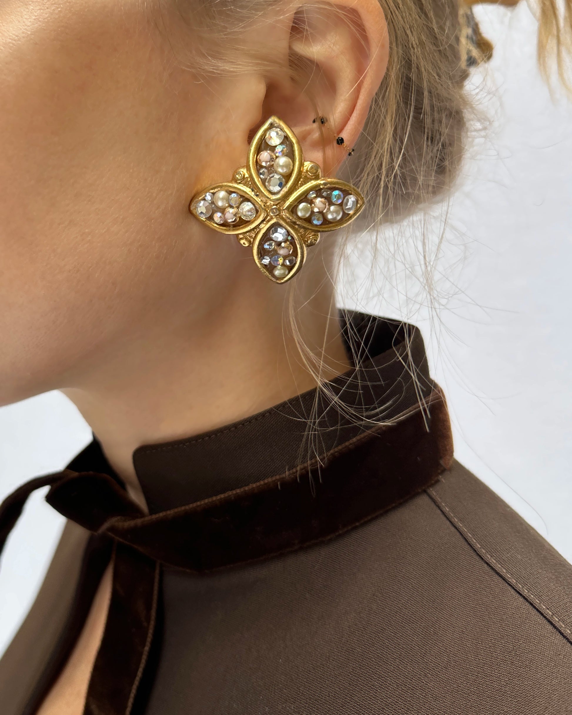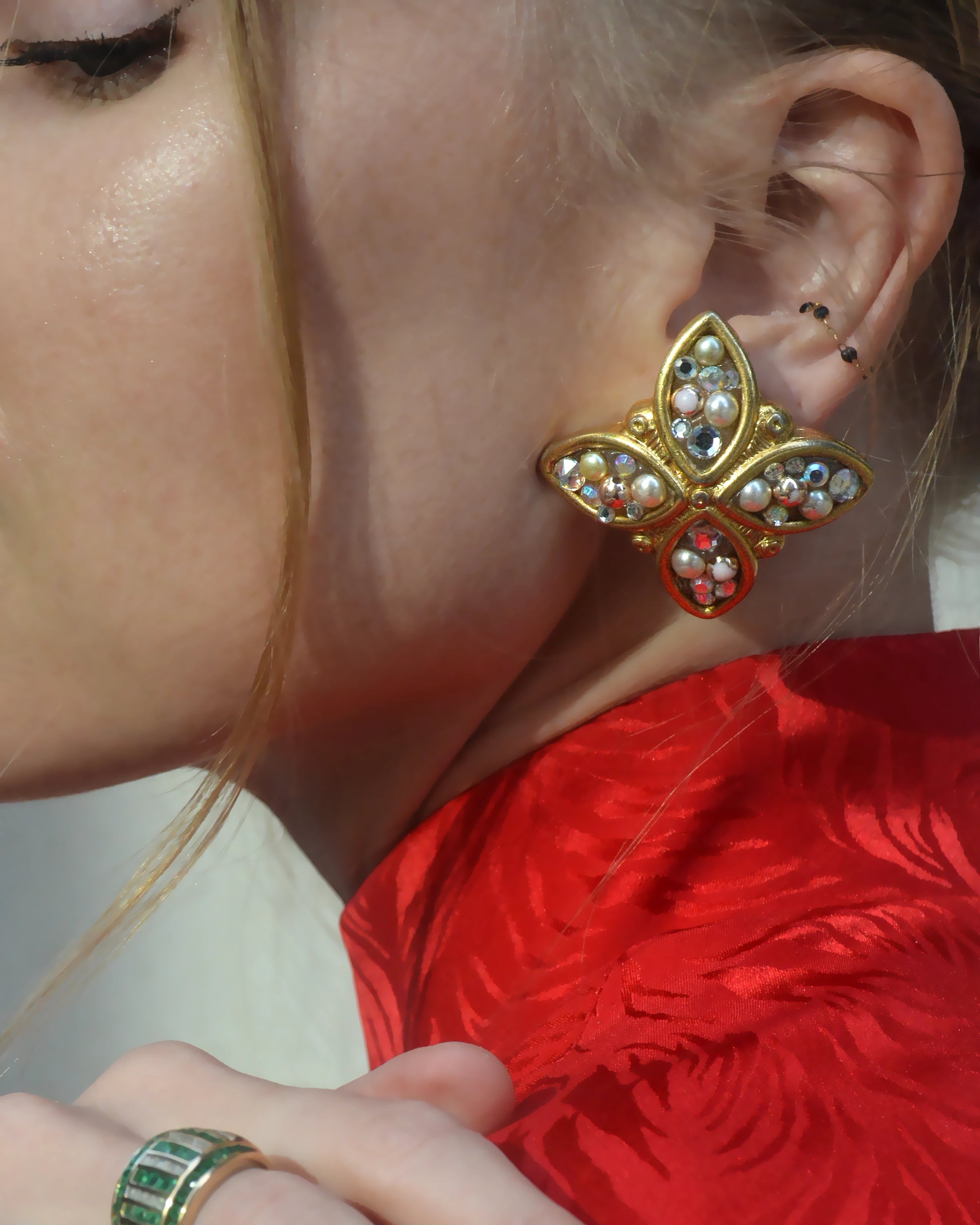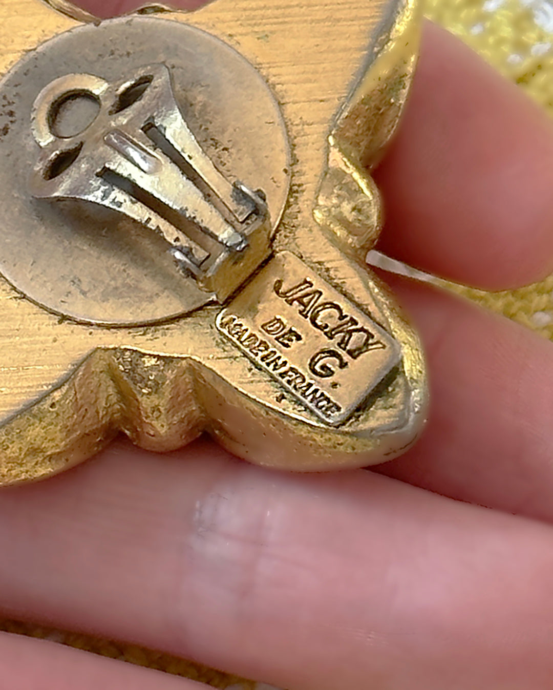 This earrings are so wildly versatile and make any look ready for a party. Made by famed Parisian jeweler Jacky de G in the 1980s, they feature a brushed gold metal in a starburst formation, with petals extending outward, filled with resin and set with pearls and stones, reflecting brilliant sparkle with every movement. Statement earrings and jewelry defined the style of the 1980s; French jewelry of this period was influenced by the runways of the big couturiers in a way we no longer see. The best jewelers worked for the big houses like Jean-Paul Gaultier, Guy Laroche, Givenchy, Dior, Chanel, Christian Lacroix and among them was the jeweler known as Jacky de G. She produced jewelry for her own label (which is signed as such) as well as for these houses, so her designs and sensibility having an immeasurable influence. Her jewelry was only produced for a short period in the 1980s, which makes it highly sought-after and collectable. These earrings are signed Jacky de G / Made in France. Measures about 4.5 cm long x 4.5 cm wide, and finished with a clip-on back.