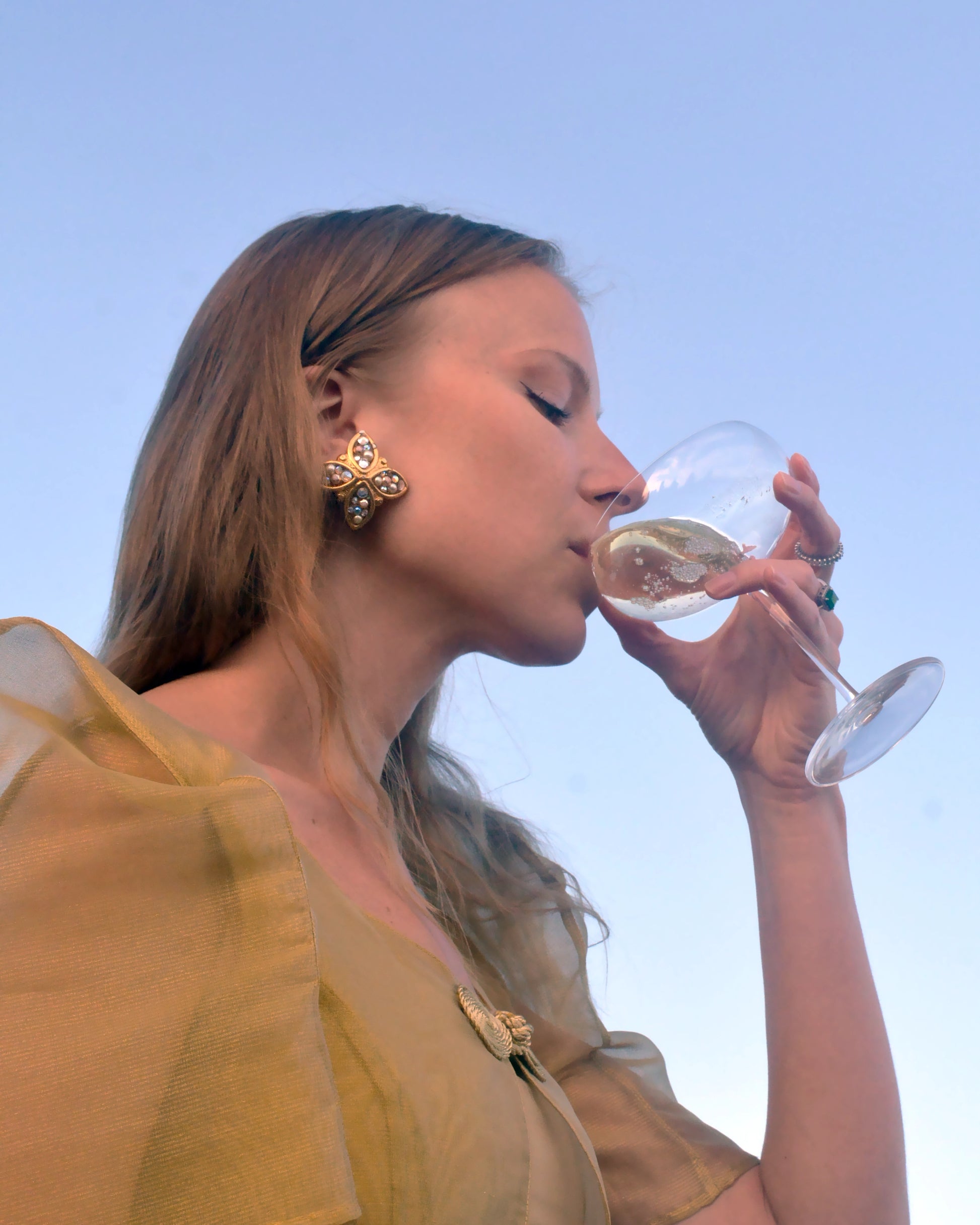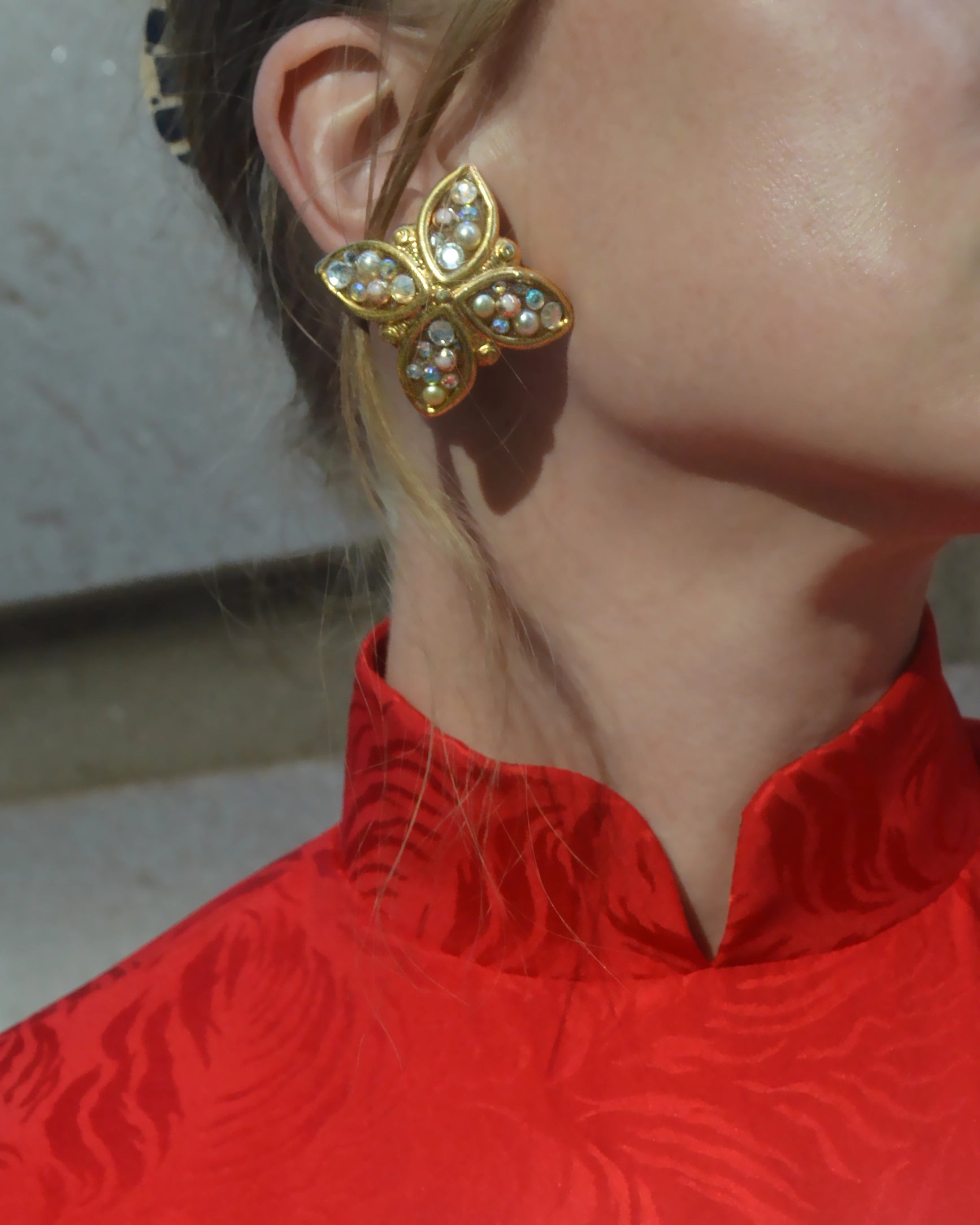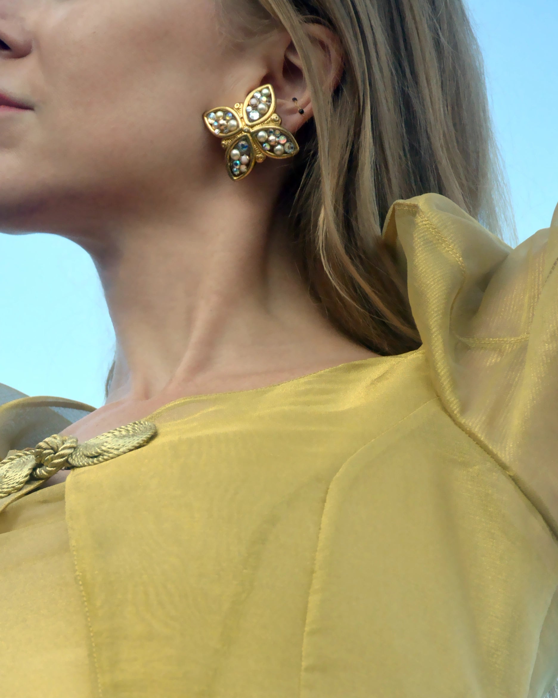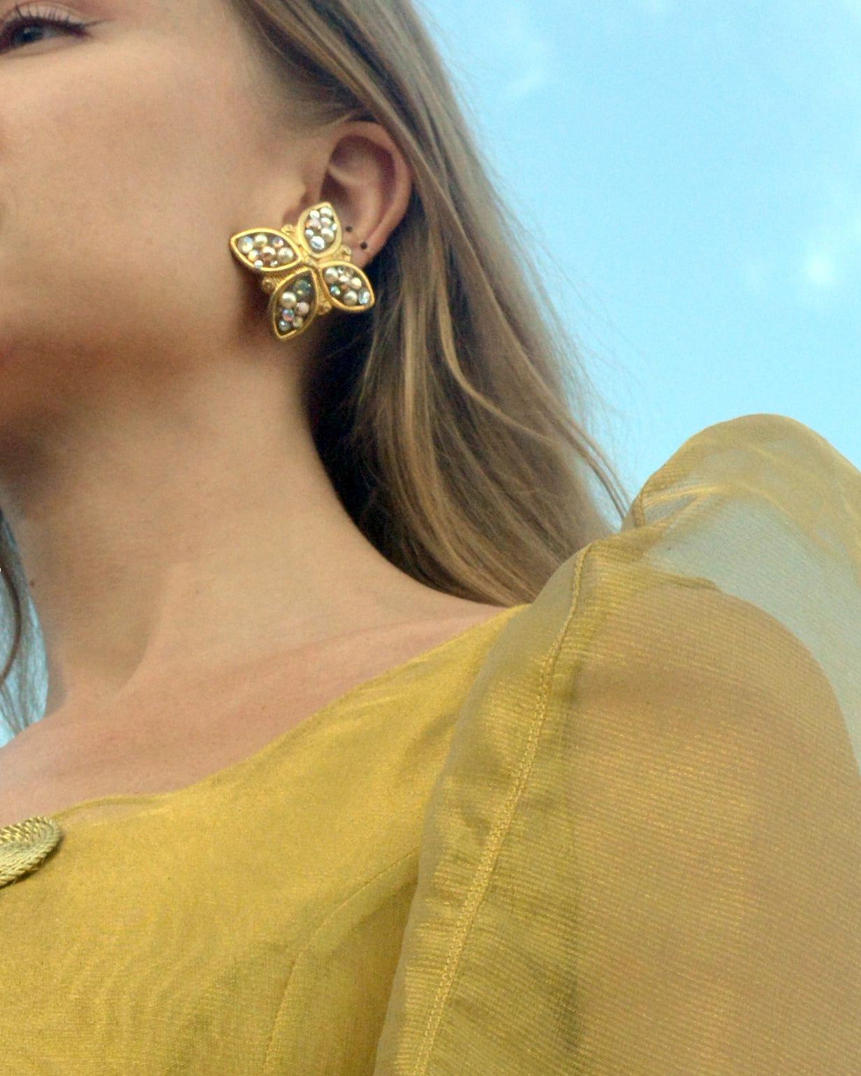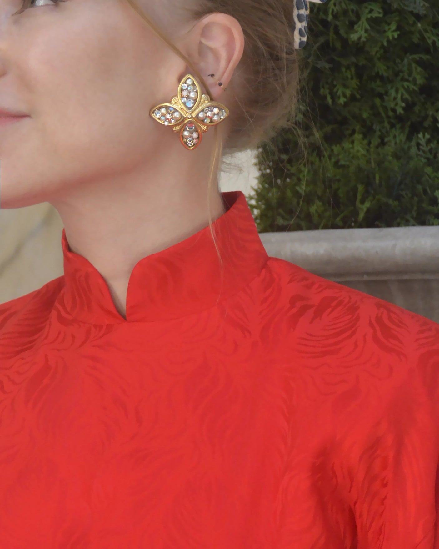 This earrings are so wildly versatile and make any look ready for a party. Made by famed Parisian jeweler Jacky de G in the 1980s, they feature a brushed gold metal in a starburst formation, with petals extending outward, filled with resin and set with pearls and stones, reflecting brilliant sparkle with every movement. Statement earrings and jewelry defined the style of the 1980s; French jewelry of this period was influenced by the runways of the big couturiers in a way we no longer see. The best jewelers worked for the big houses like Jean-Paul Gaultier, Guy Laroche, Givenchy, Dior, Chanel, Christian Lacroix and among them was the jeweler known as Jacky de G. She produced jewelry for her own label (which is signed as such) as well as for these houses, so her designs and sensibility having an immeasurable influence. Her jewelry was only produced for a short period in the 1980s, which makes it highly sought-after and collectable. These earrings are signed Jacky de G / Made in France. Measures about 4.5 cm long x 4.5 cm wide, and finished with a clip-on back.
