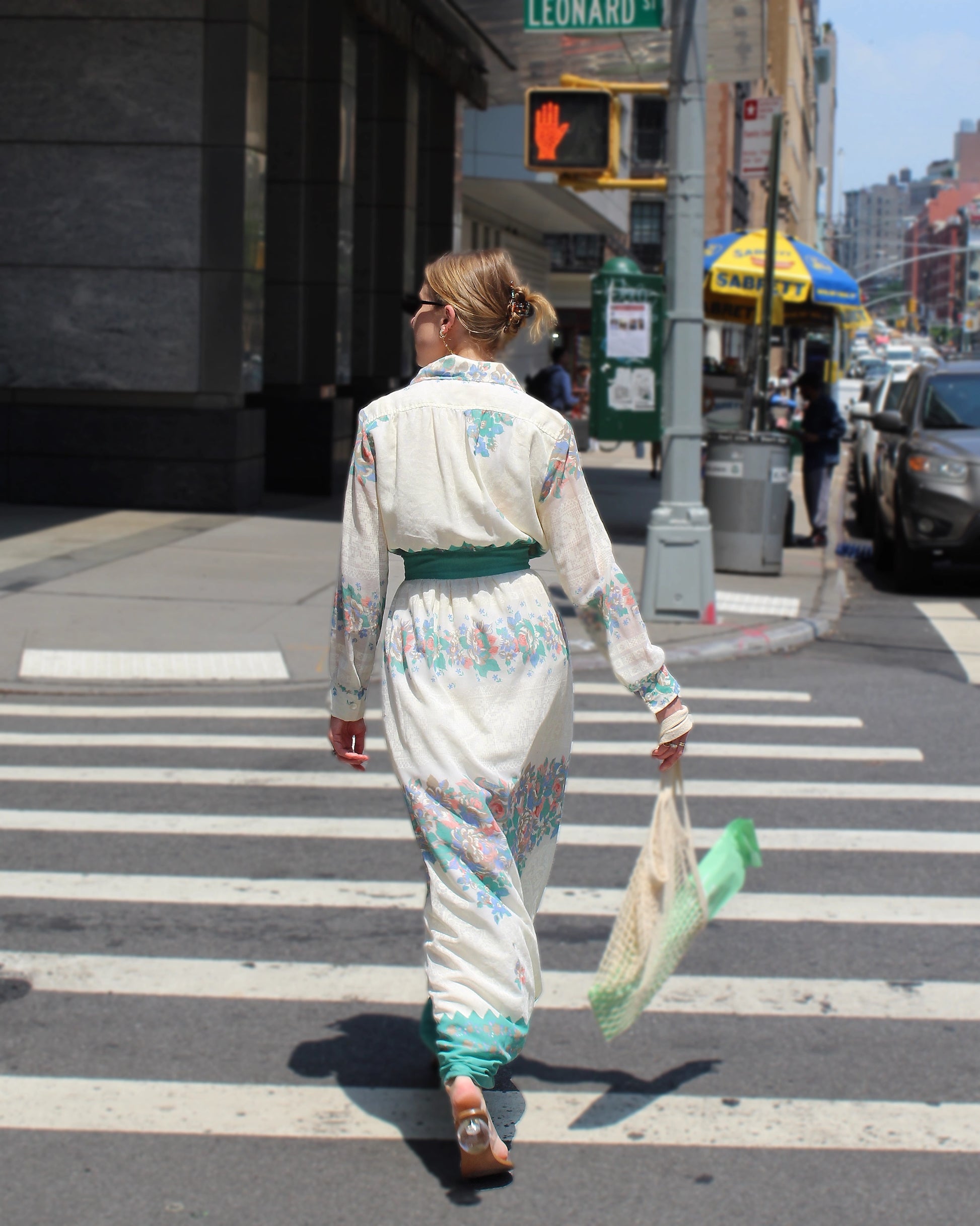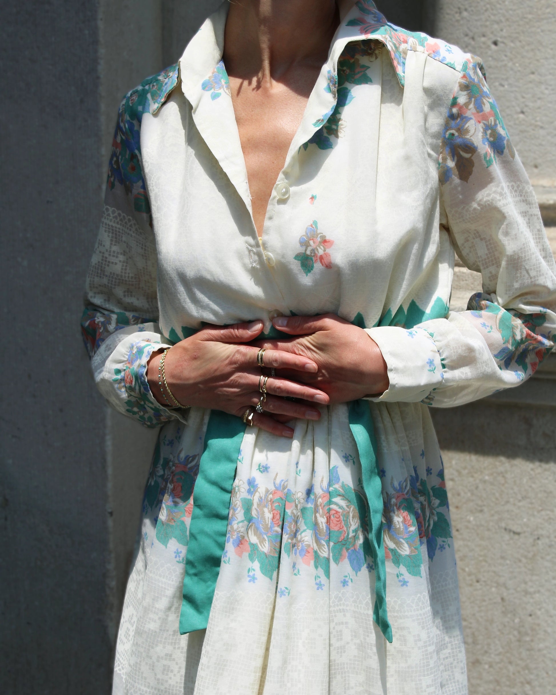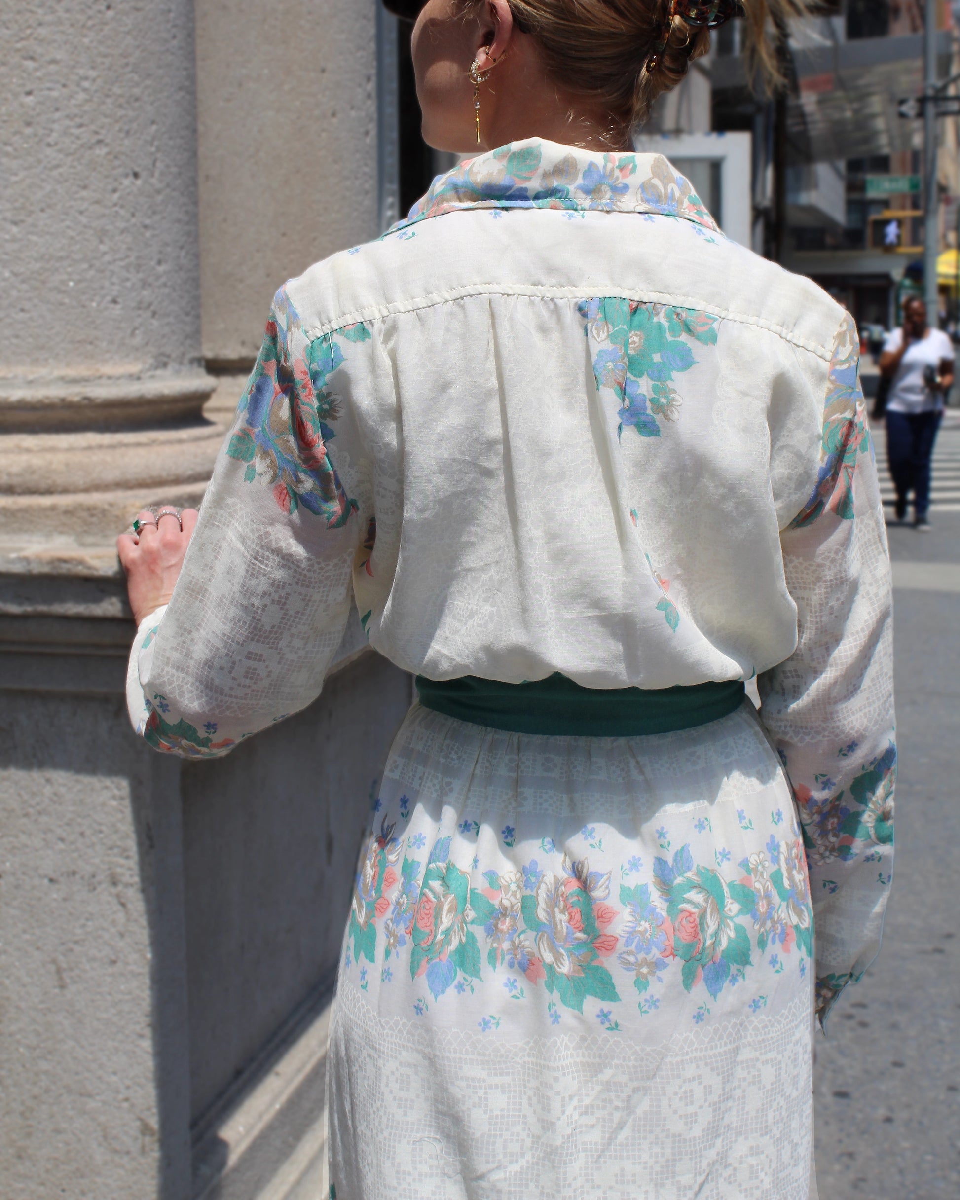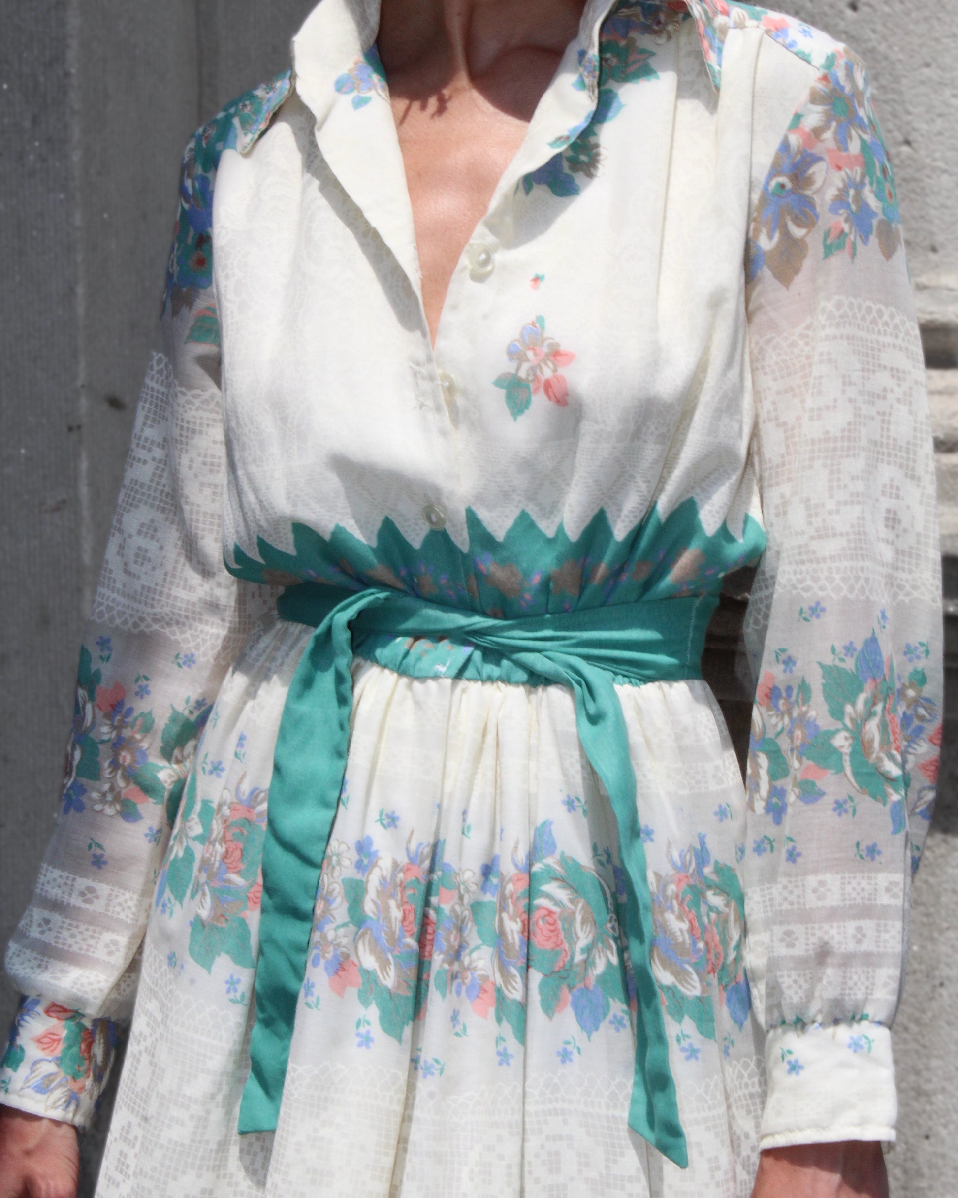 This classic vintage shirtwaist dress was made in the late 1970s. It has long sleeves and a full length skirt, but the lightweight voile fabric makes it wearable in warmer weather as well. It's fully lined to avoid sheerness, except in the sleeves, which allows the beauty of the print to shine: it has a subtle tonal lace motif, with floral details. The waist has hidden elastic (comfortable, flexible fit) and it's covered by a tie at the waist. It closes with buttons down the front. The Vintage Cross Drop Earrings pictured are also available.
