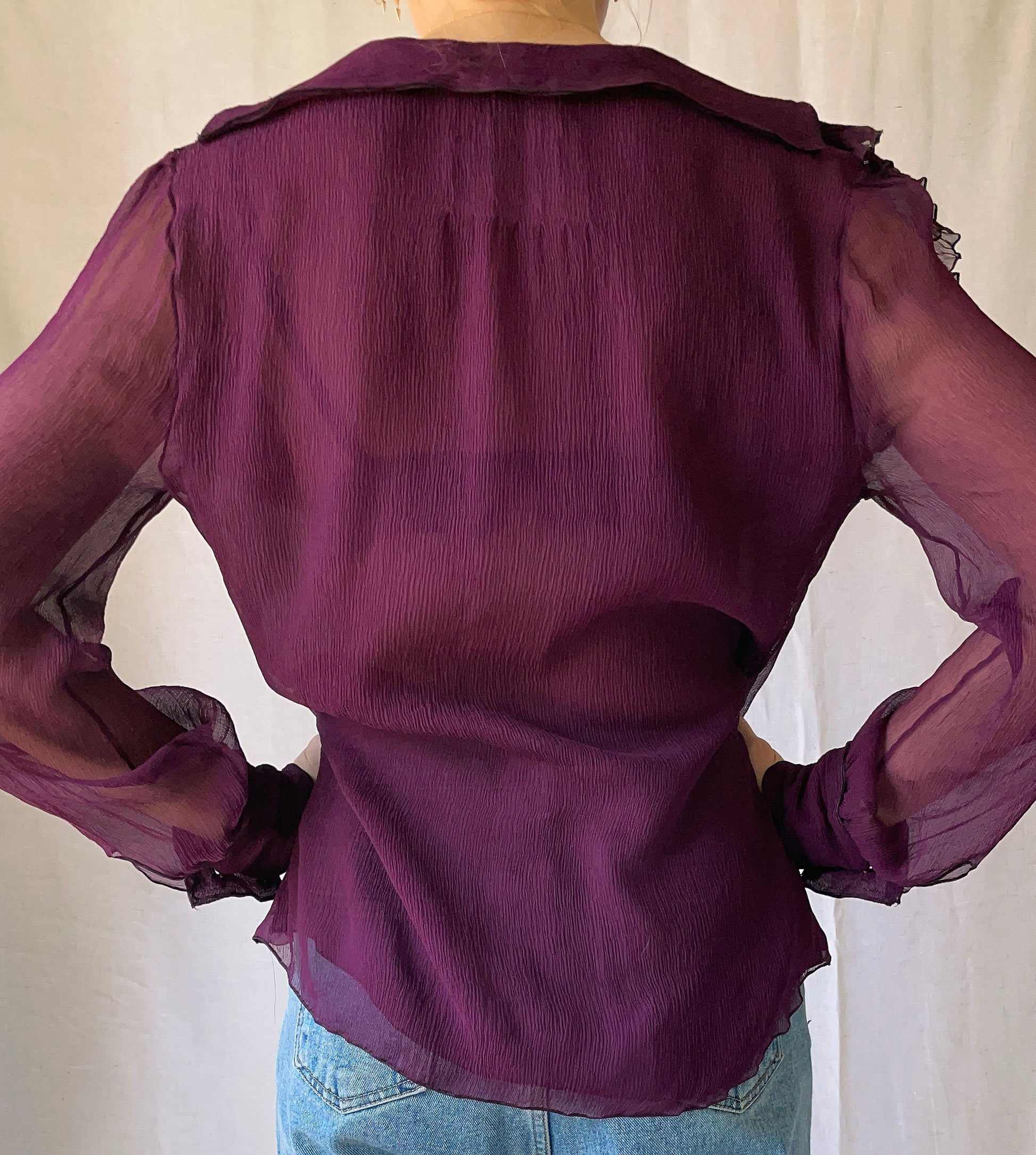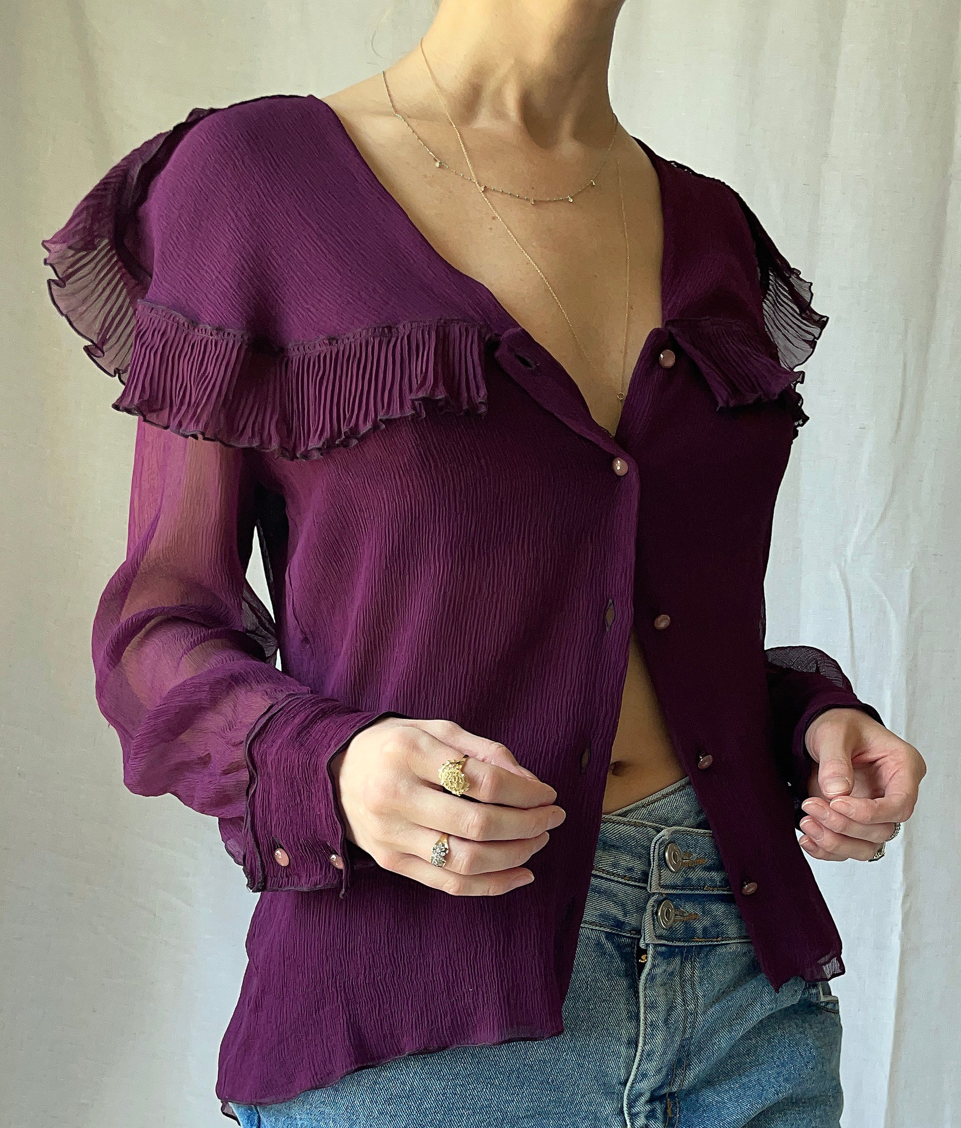 This silk fabric of this Missoni shirt is just absolutely divine: it's a 100% silk chiffon with a crinkled texture. It's seriously so light, airy, diaphanous— I never want to take it off, and it's such a versatile layering piece. Made in Italy by Missoni circa 1980s, it has an oversized sailor collar with a delicately pleated flounce, calling subtle attention to the décolletage. The breezy silk makes it a great layering piece: it could be worn tied in the front, open like a jacket, tucked into something high-waisted, untucked, layered over a thin knit... the possibilities are literally endless! I can't emphasize enough how amazing the craftsmanship is on this classic piece: even the little pintucks at the shoulder are done with such skill that they honestly stopped me in my tracks. There are two layers of fabric so that it's not overly sheer, and the fabric does have stretch to it.