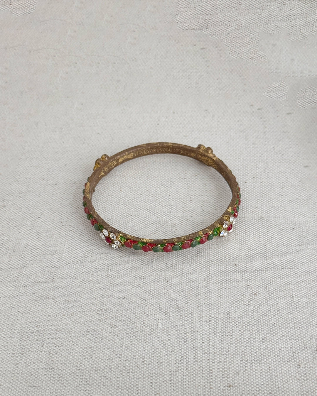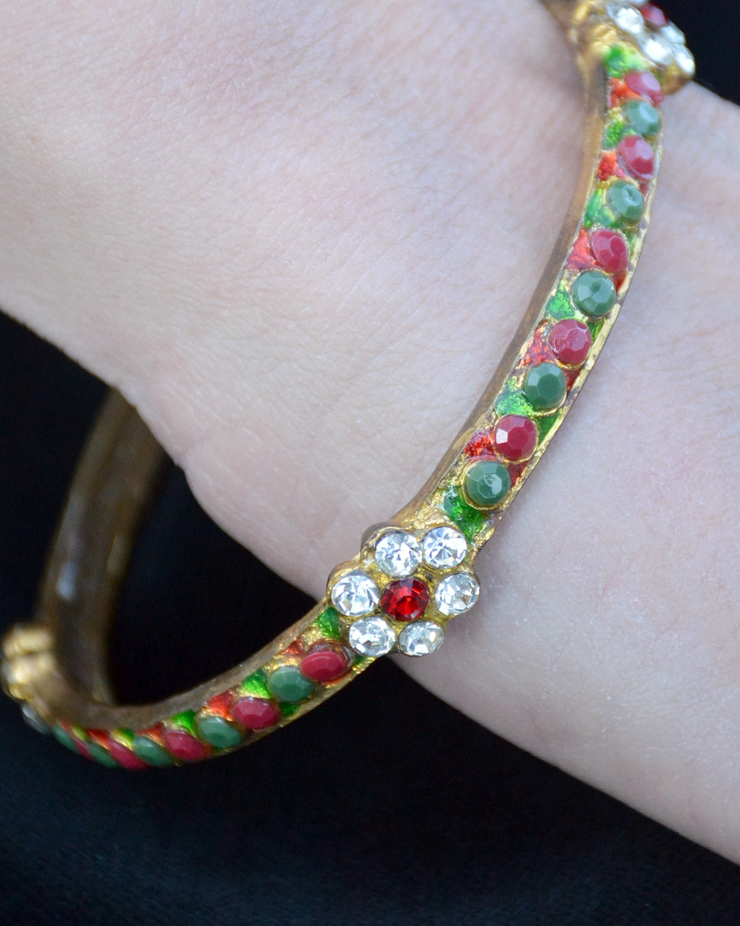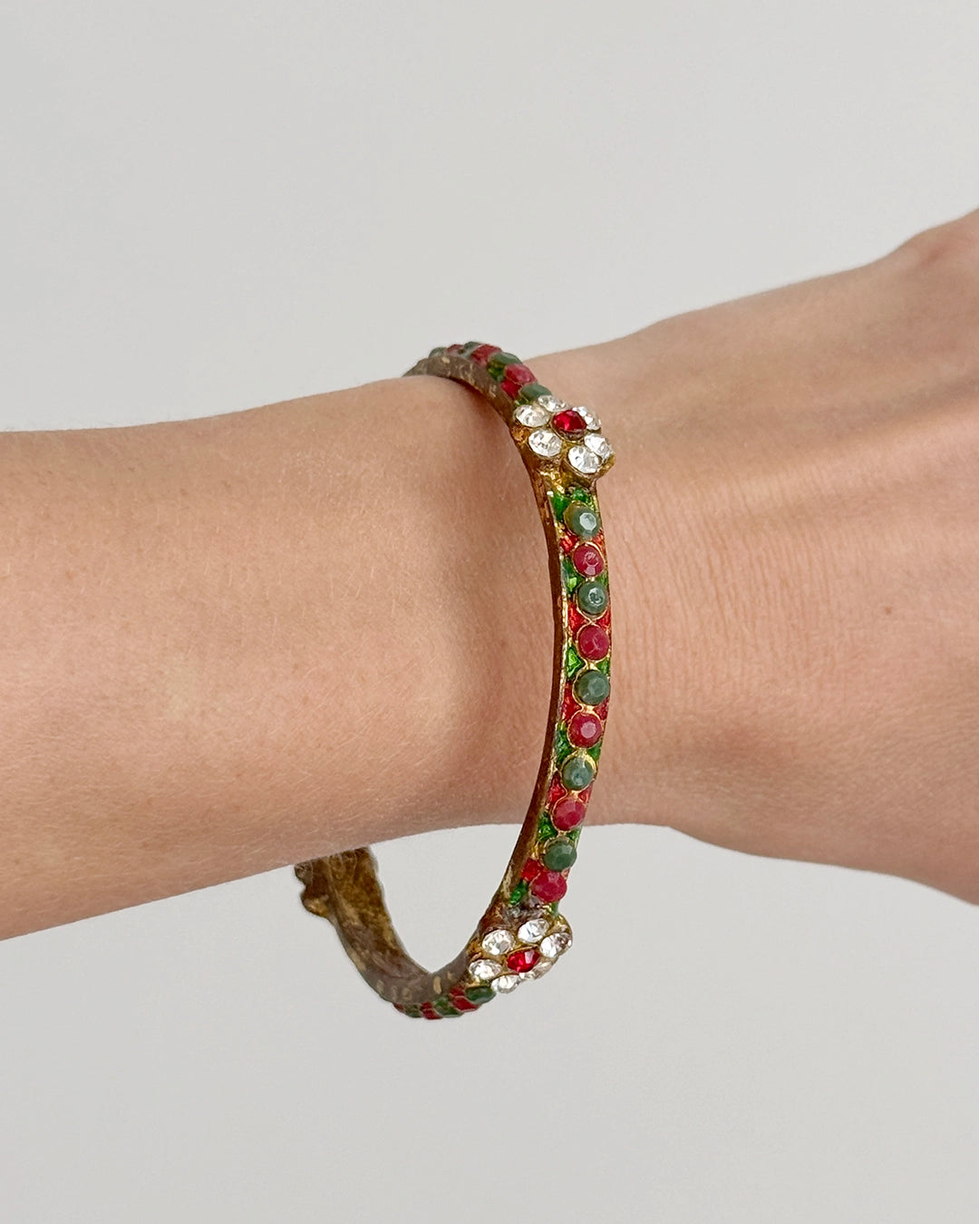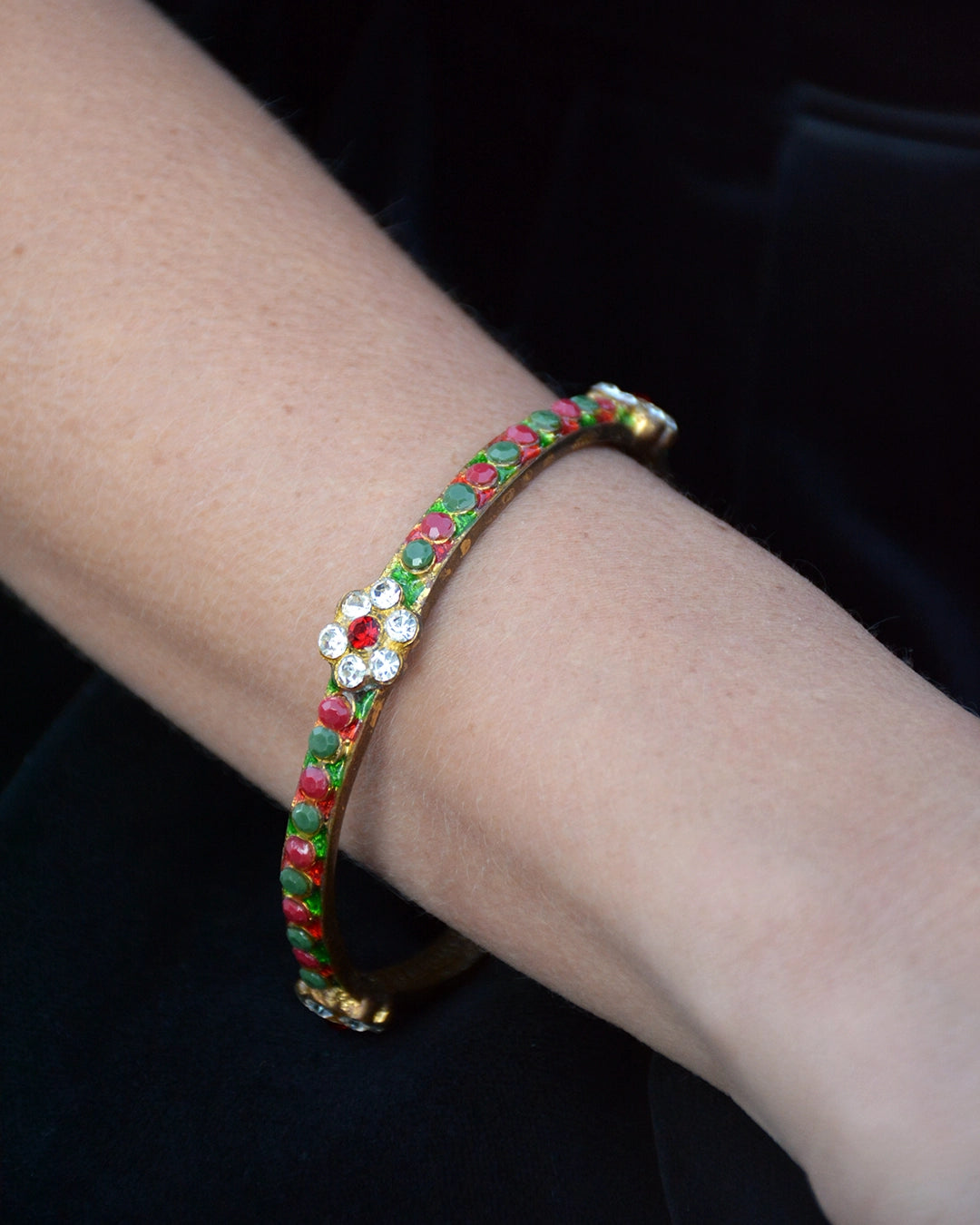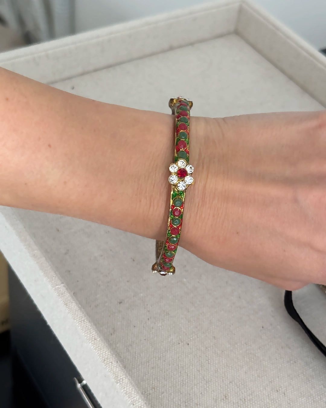 This vintage Mughal style enamel bangle features the red-and-green color palette so prevalent in Mughal jewelry— I absolutely love this distinct, statement-making color scheme. It features red and green stones surrounded in enamel work, punctuated by four crystal flower details. This is a great piece to stack and wear with existing pieces in your jewelry wardrobe. The interior diameter measures 68 mm.