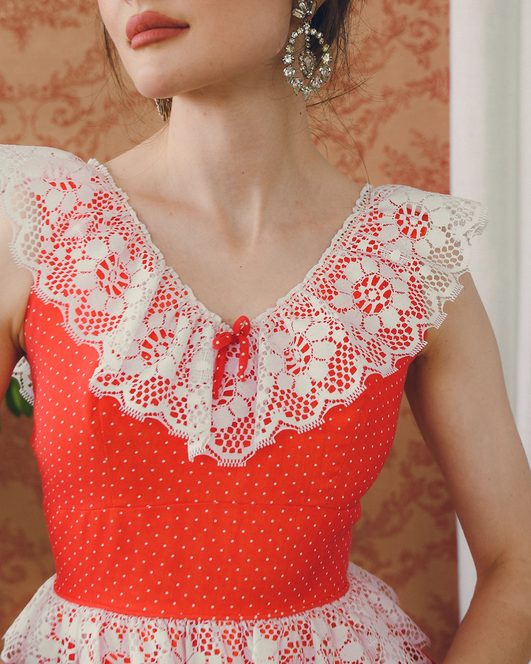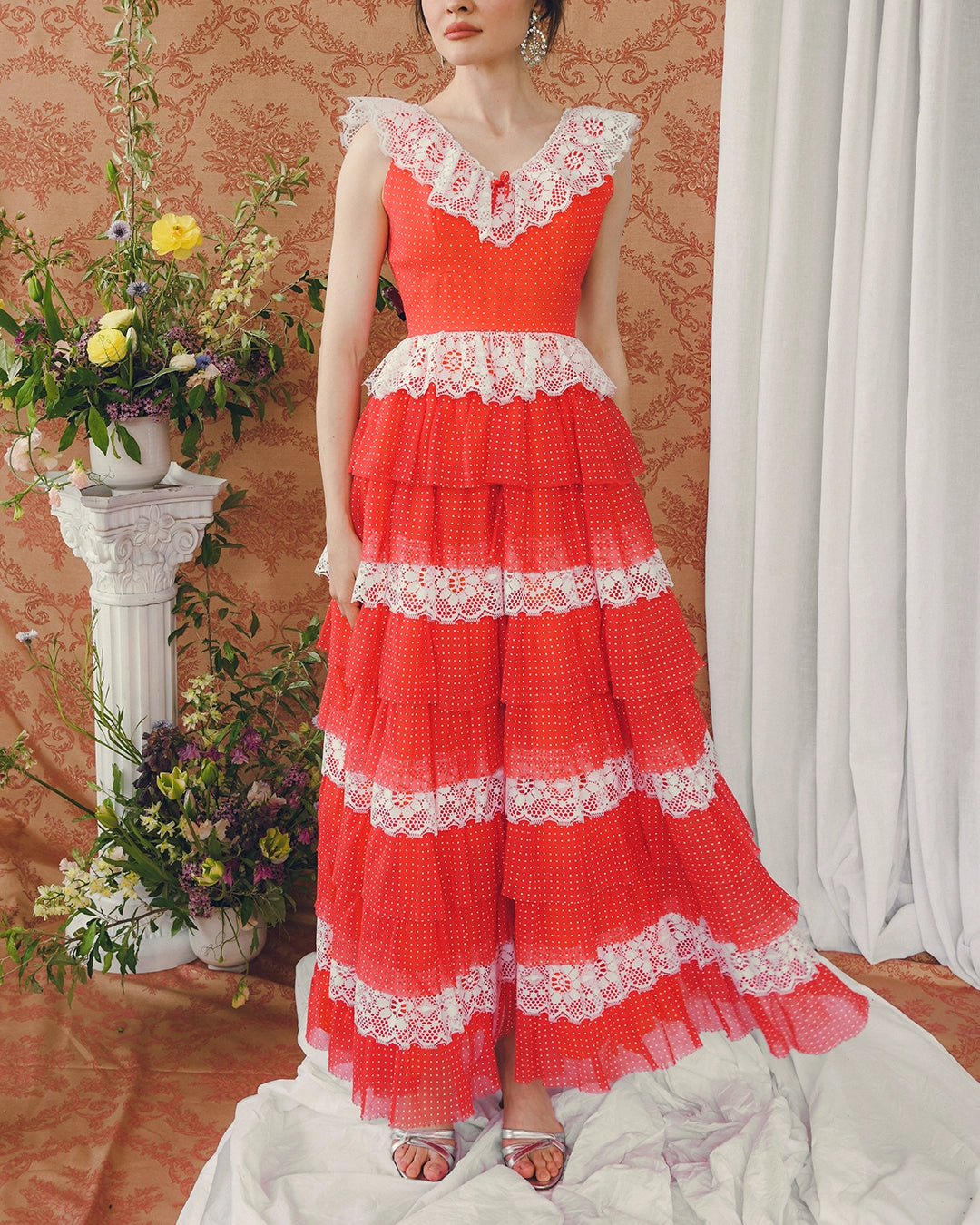 This vintage dress Swiss dot and lace gown is complete with a tiered petticoat skirt— and such a distinct whimsy, reminding me of the dresses Judy Garland wore in Meet Me in St. Louis. It also draws inspiration from vintage square dancing outfits. Crafted in a red organza flocked with Swiss dots, it's very fitted in the bodice, with a defined yoke waist, offset by a full skirt with layers of tiered flounce, and white lace flounce interspersed. The tiers are backed by a layer of mesh that adds structure and fullness to the skirt, creating a magical sweep with every movement. Note that the hems are unfinished on each layer of tiers throughout, which is an intentional design detail that creates a beautiful seamless look. There is a sweet bow detail at the V-neckline. It comes with a bolero that matches the white lace details— I love the ribbon details interwoven with the lace. The dress was made in the USA, and is fully lined, with a hidden zip closure in the back.