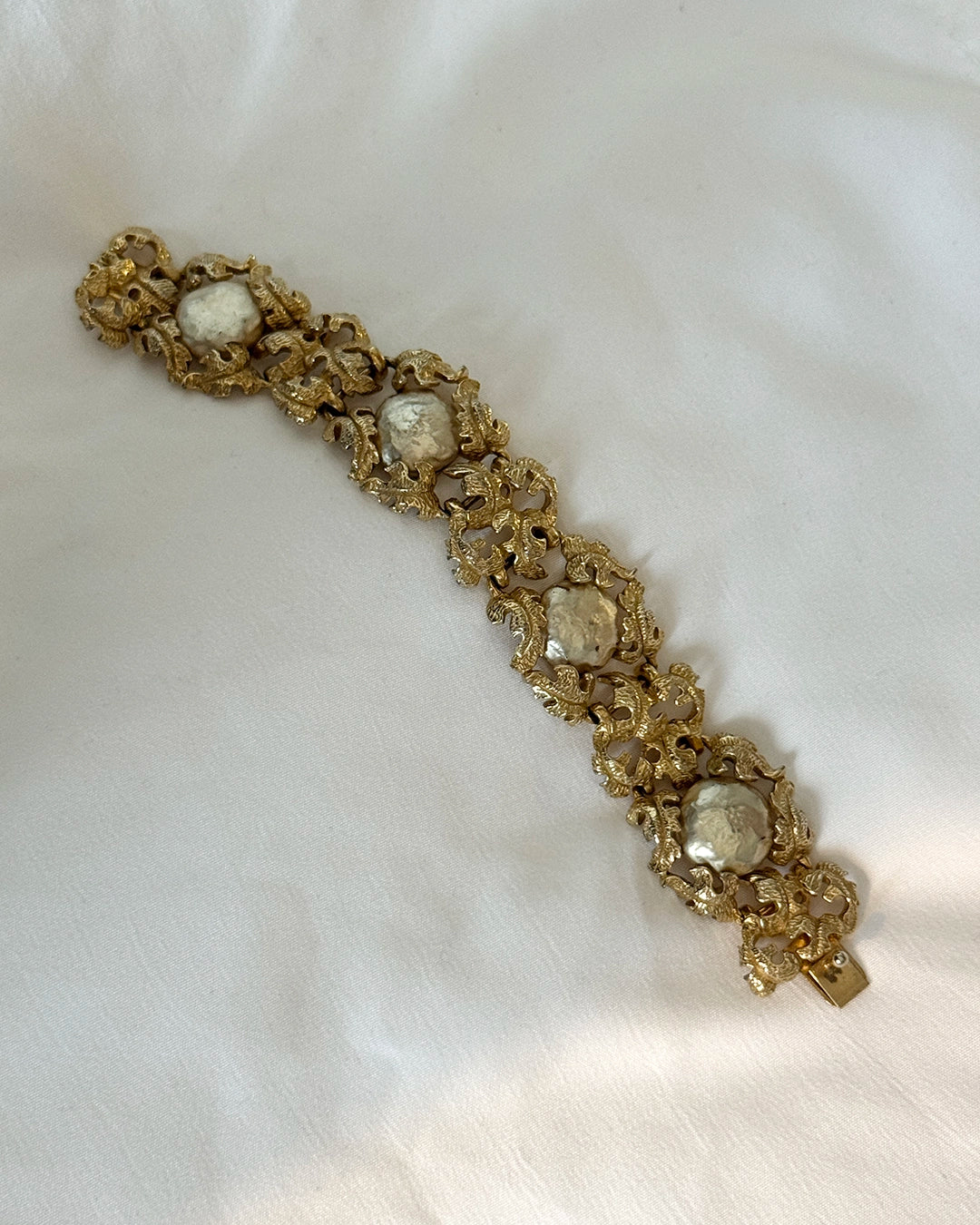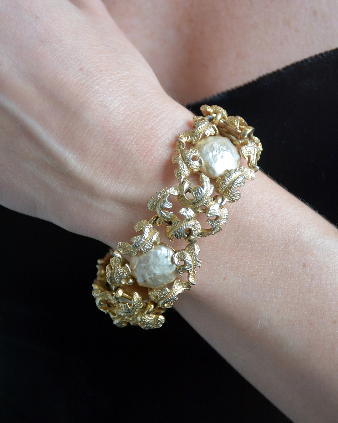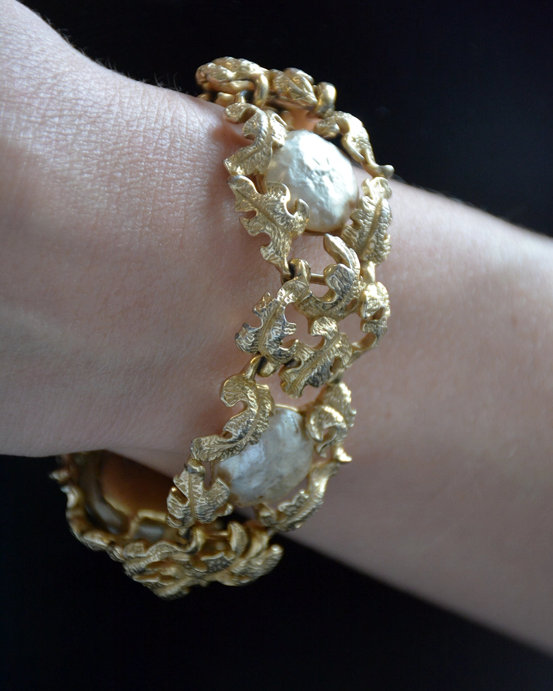 Vintage Ornate Gold Floral Bracelet with Baroque Pearls, in the style of Buccellati