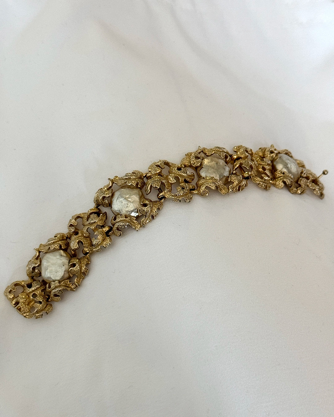 This stunning vintage gold bracelet is inspired by Buccellati's iconic midcentury gold bracelets with baroque floral details. It is set with oversized Baroque-style pearl details. It also has hallmarks of the iconic "retro" jewelry movement of the 1950s. This is a timeless piece that will remain on constant rotation in your collection forever. Made in the USA, closes with a box clasp, 1420measures 7.25"