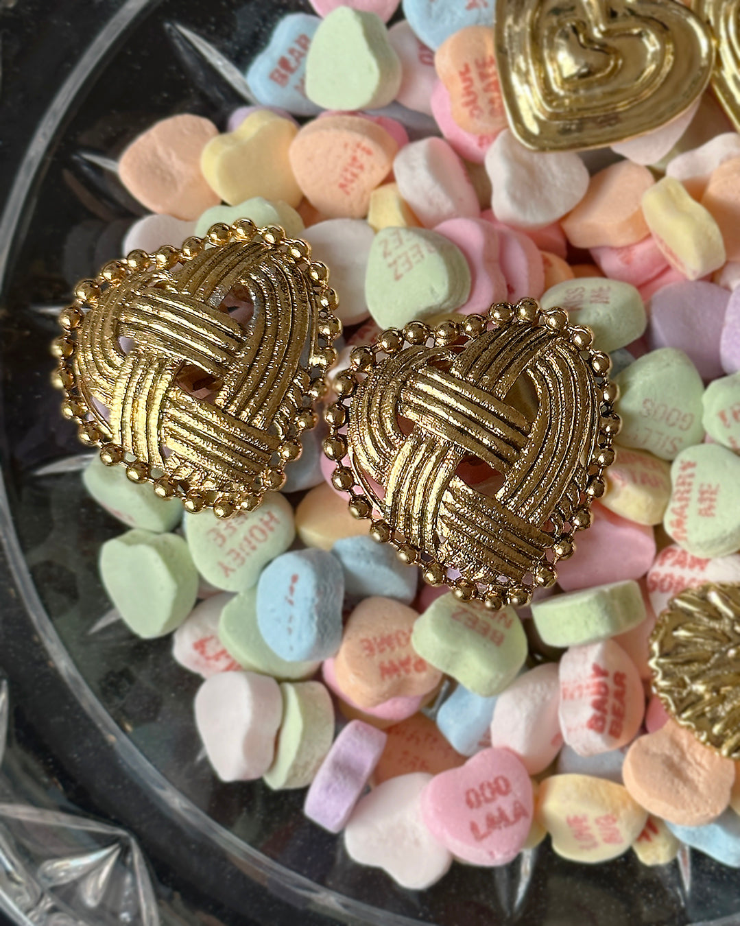 Reminiscent of Yves Saint Laurent's iconic heart earrings, these vintage European-made earrings feature a distinct heart shape, with textural woven and millegrain details— fitting for everyday wear, yet anything but boring, and make for wonderful one-of-a-kind gifts. Finished with a comfortable clip-on lever back, and measures 4 cm long x just shy of 4 cm at widest point.