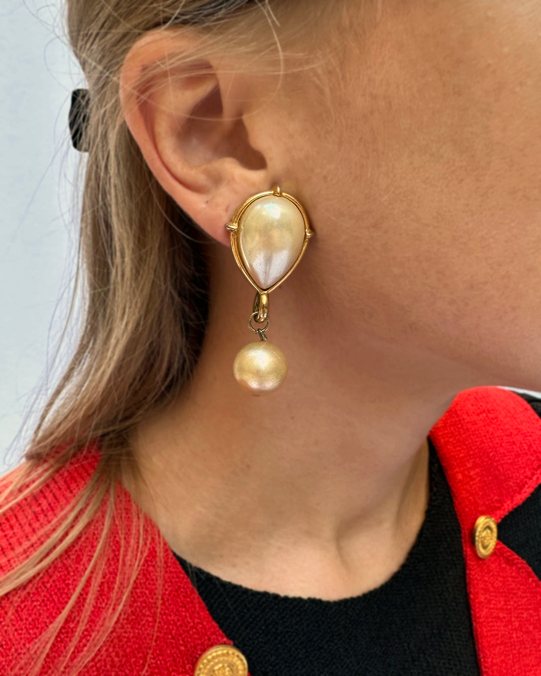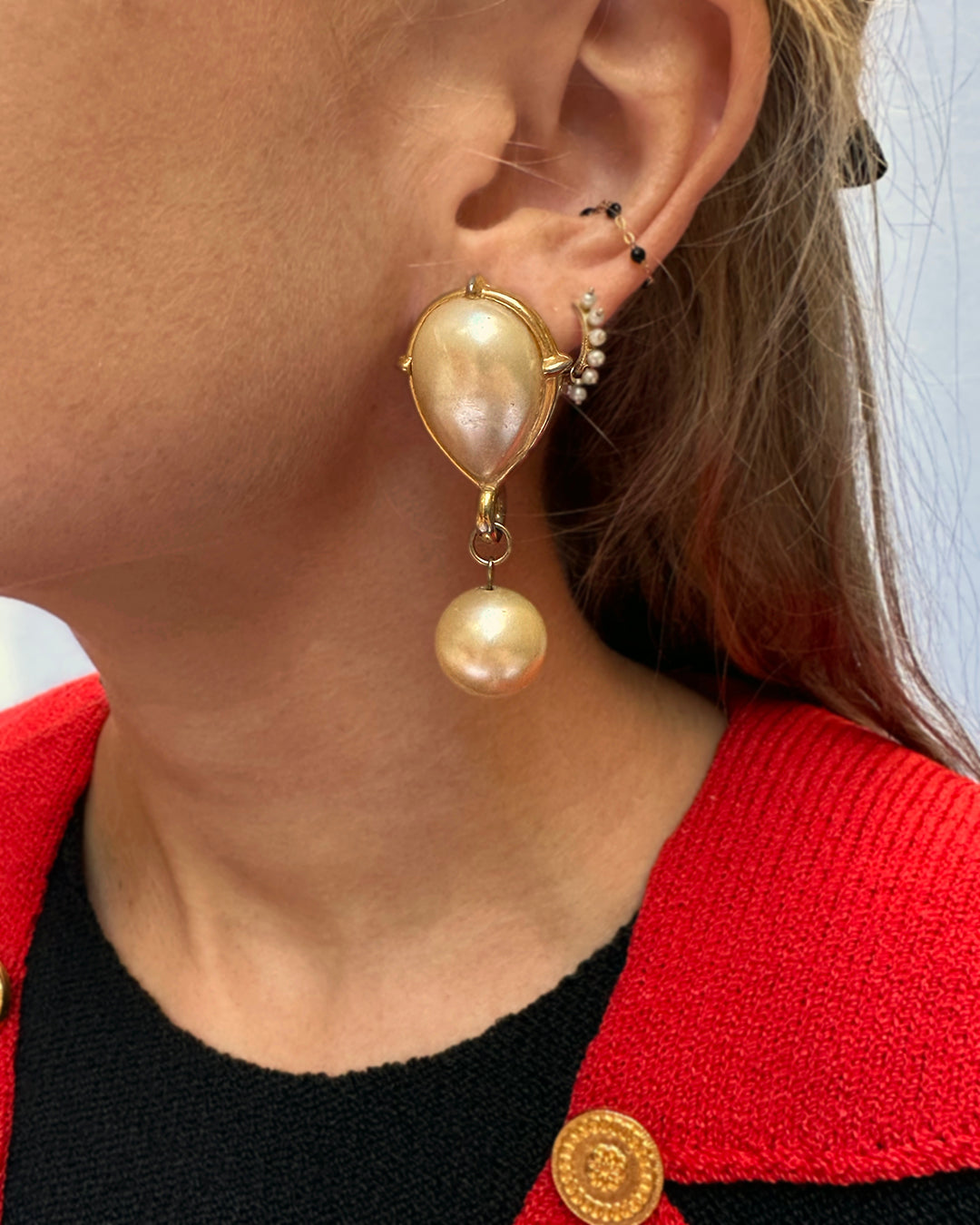 A fun twist on a timeless classic: these vintage pearl drops feature an inverted teardrop pearl, with a pearl dangling drop. The brushed-gold bezel setting adds to the super-luxe vibe. Made in the 1980s, these earrings are not signed, but they are from the collection of an avid jewelry collector whose collection included an extensive array of 1980s Jacky de G earrings and other designer jewelry from the runways. Measures about 5.5 cm in length total, and finished with a clip-on back. The Vintage Adolfo Dress pictured is also available.