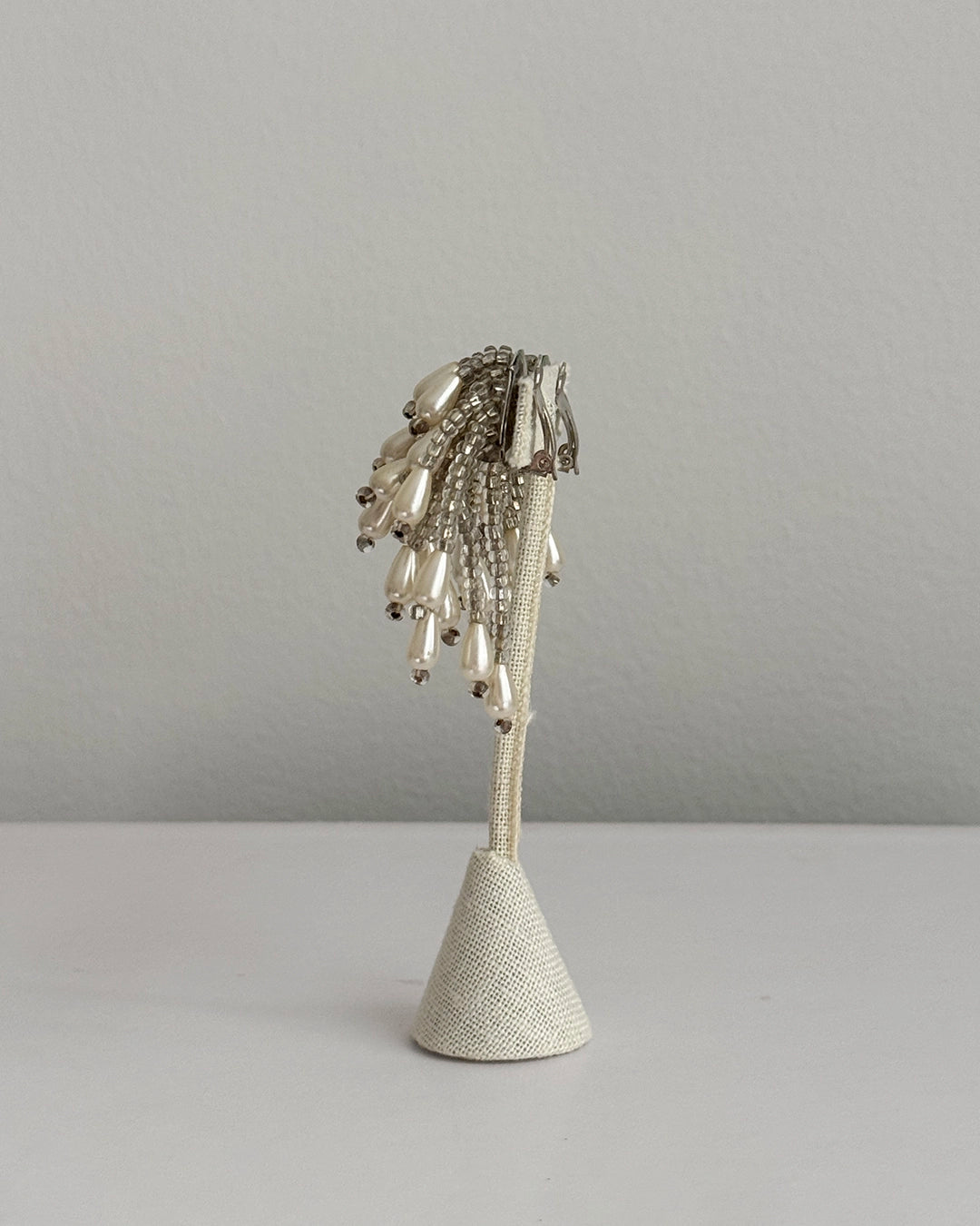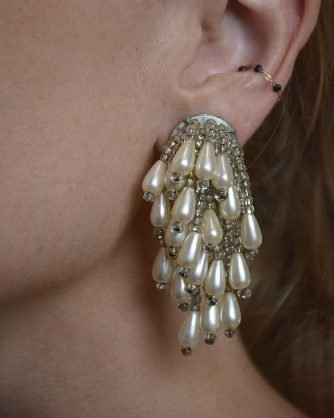 These vintage pearl cascade earrings are so fun— they feature many strands of crystals beads, punctuated on the end by an oblong teardrop pearl. Each strand moves freely, so these earrings have the most beautiful, graceful movement to them. Measures about 6 cm total length, and finished with a clip-on lever back. They are extremely lightweight and comfortable; vintage clip-ons are so much more comfortable and secure to wear compared to their modern counterparts, largely due to the quality and thought that went into their hand-made construction.