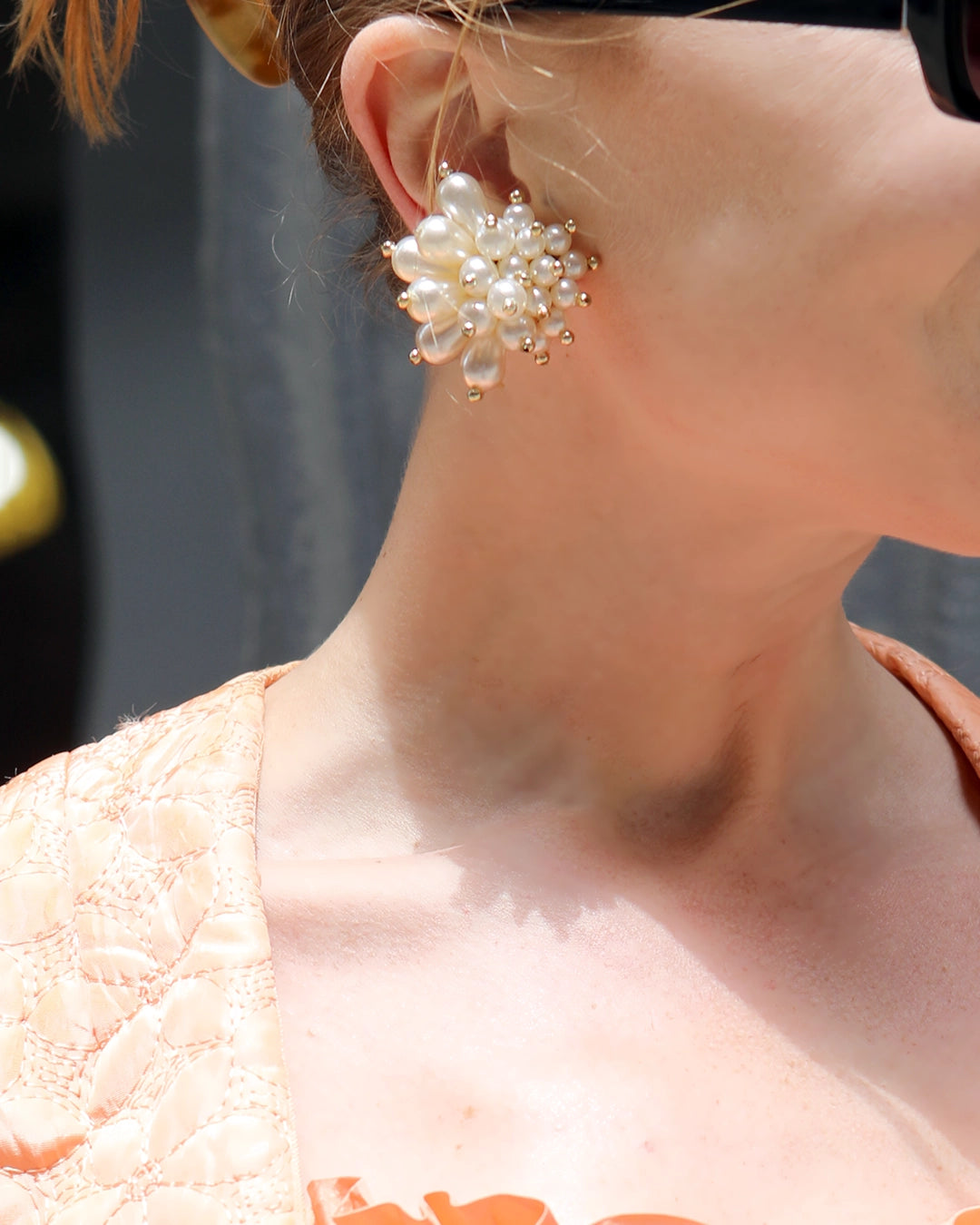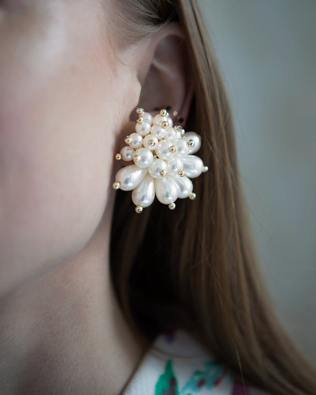 These vintage pearl cluster earrings look like a starburst or fire cracker exploding with pearls— I love the way the design frames the face on either side. Earrings like this are wonderful because they make a statement all while sitting on the lobe. They are finished with a clip-on lever back; vintage clip-ons are so much more comfortable and secure to wear compared to their modern counterparts, largely due to the quality and thought that went into their hand-made construction. Measures 43 mm total length.