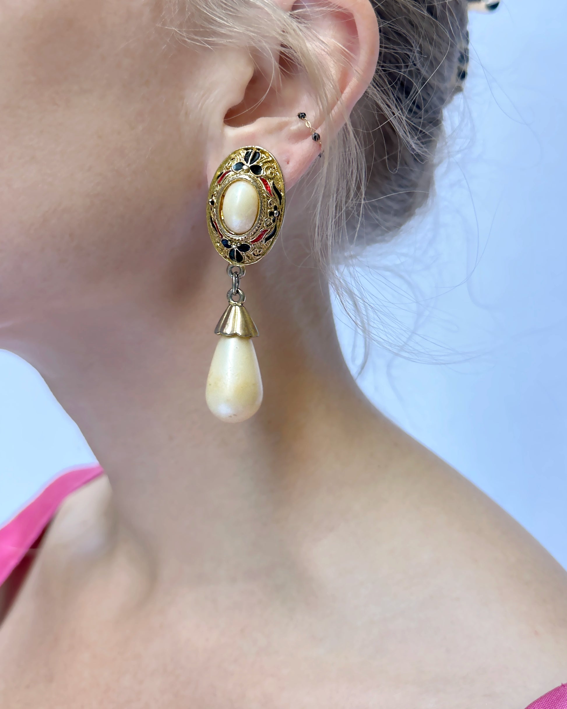 Vintage Enameled Gold Pearl Drop Standard Earrings