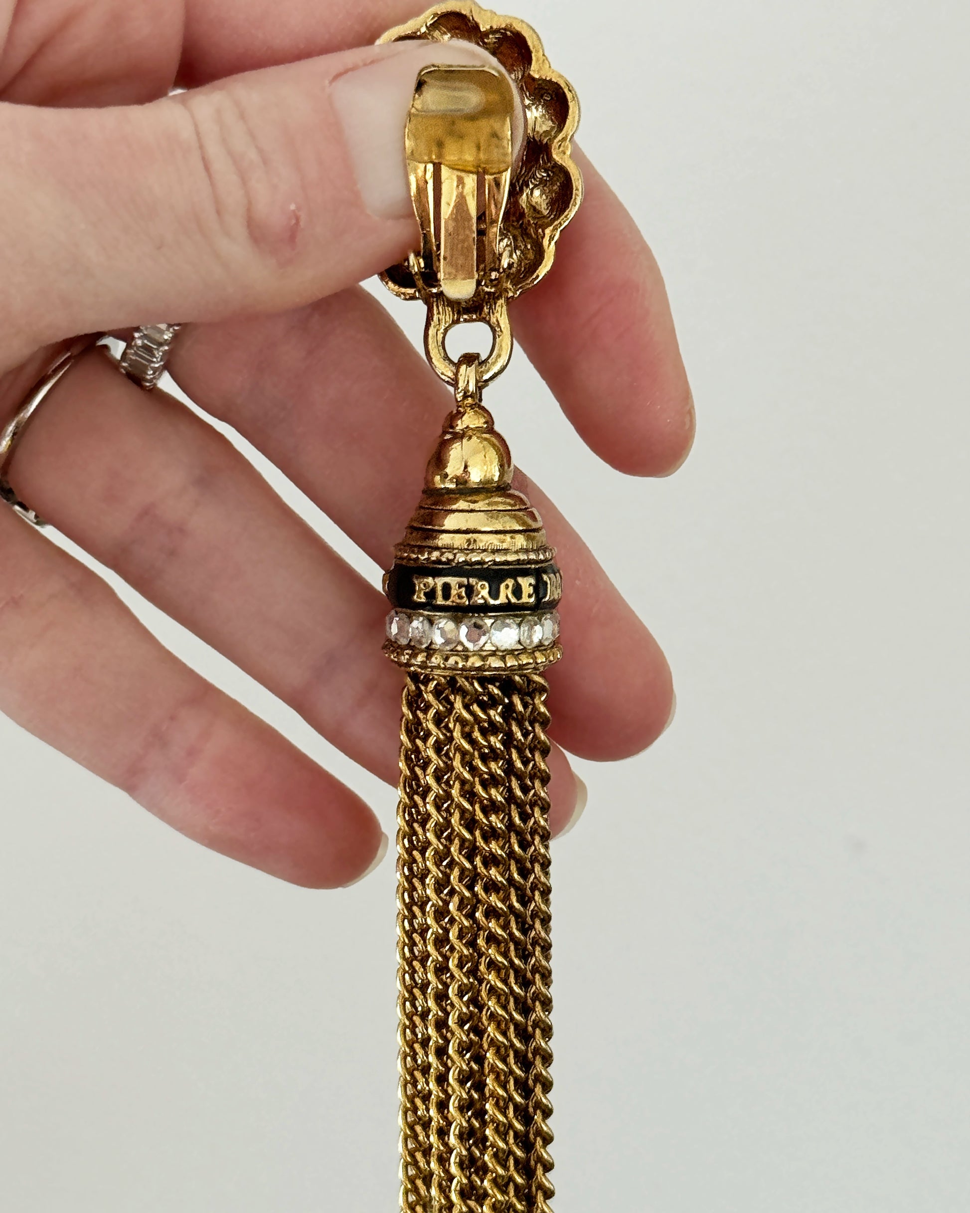 These vintage Pierre Balmain tassel earrings feature a large quilted-surface gold head with a tassel of gold chains, suspended from a finial with a row of crystals, and a black enamel stripe emblazoned with "PIERRE BALMAIN PARIS." They are a rare collector's item. The tassel has such great movement, but despite their statement-making size and all that movement, they are surprisingly lightweight and comfortable to wear— vintage clip-ons are so much more comfortable and secure to wear compared to their modern counterparts, largely due to the quality and thought that went into their hand-made construction. They have a clip-on lever back, and measure 11.2 cm in length.