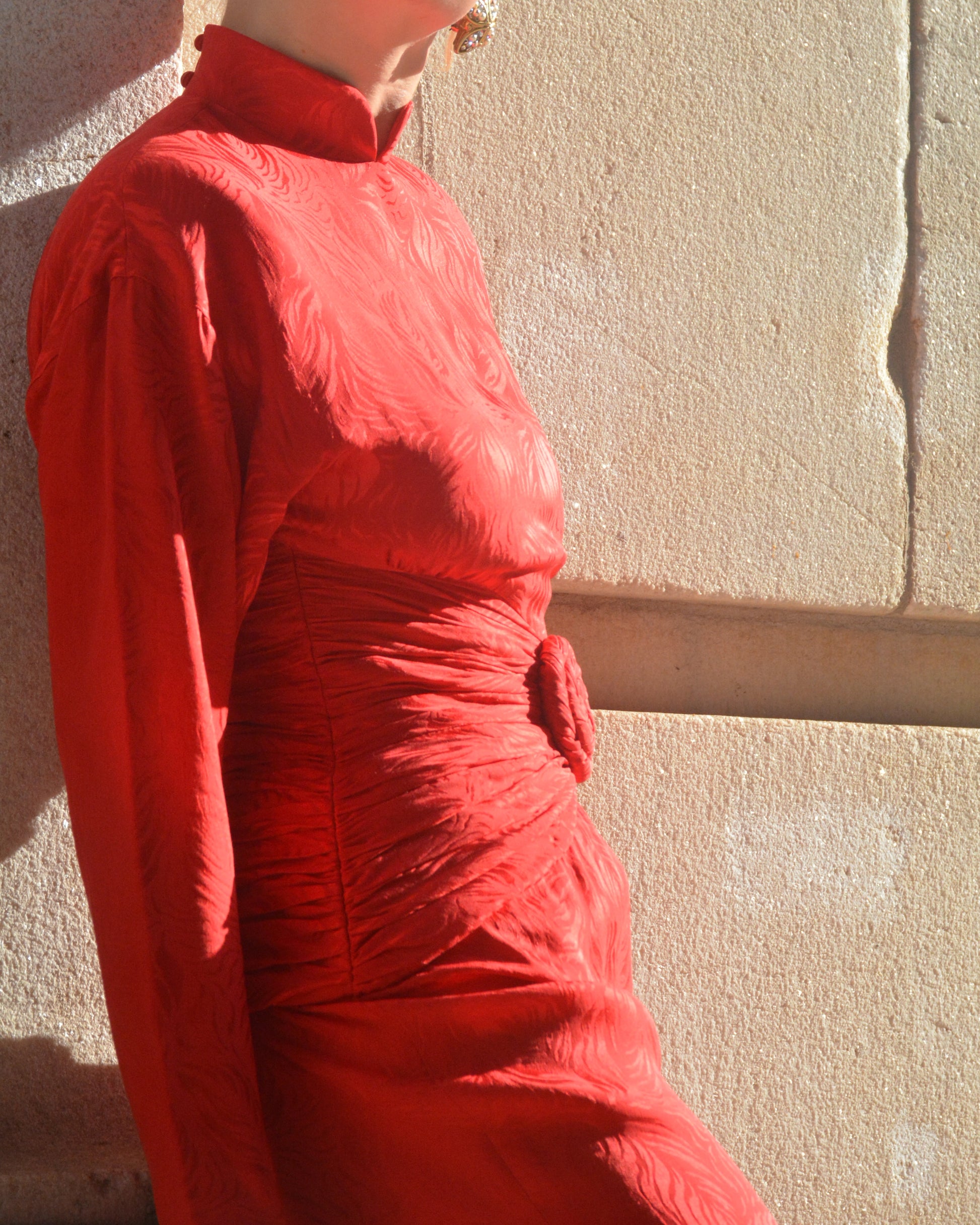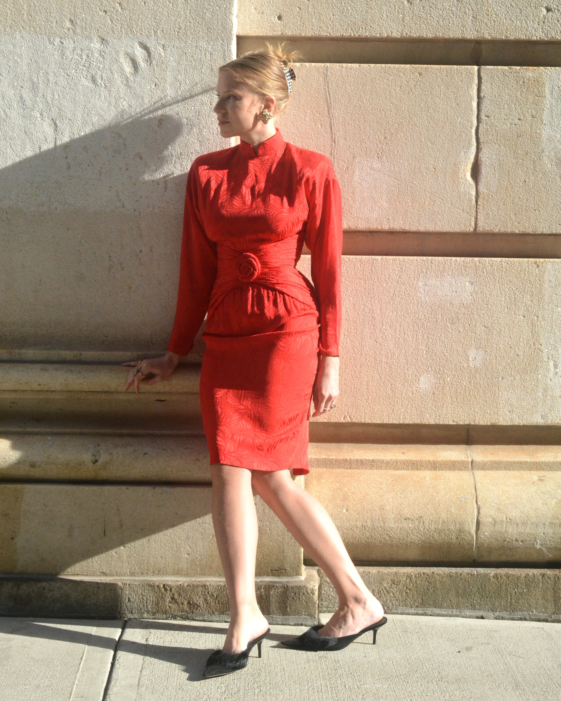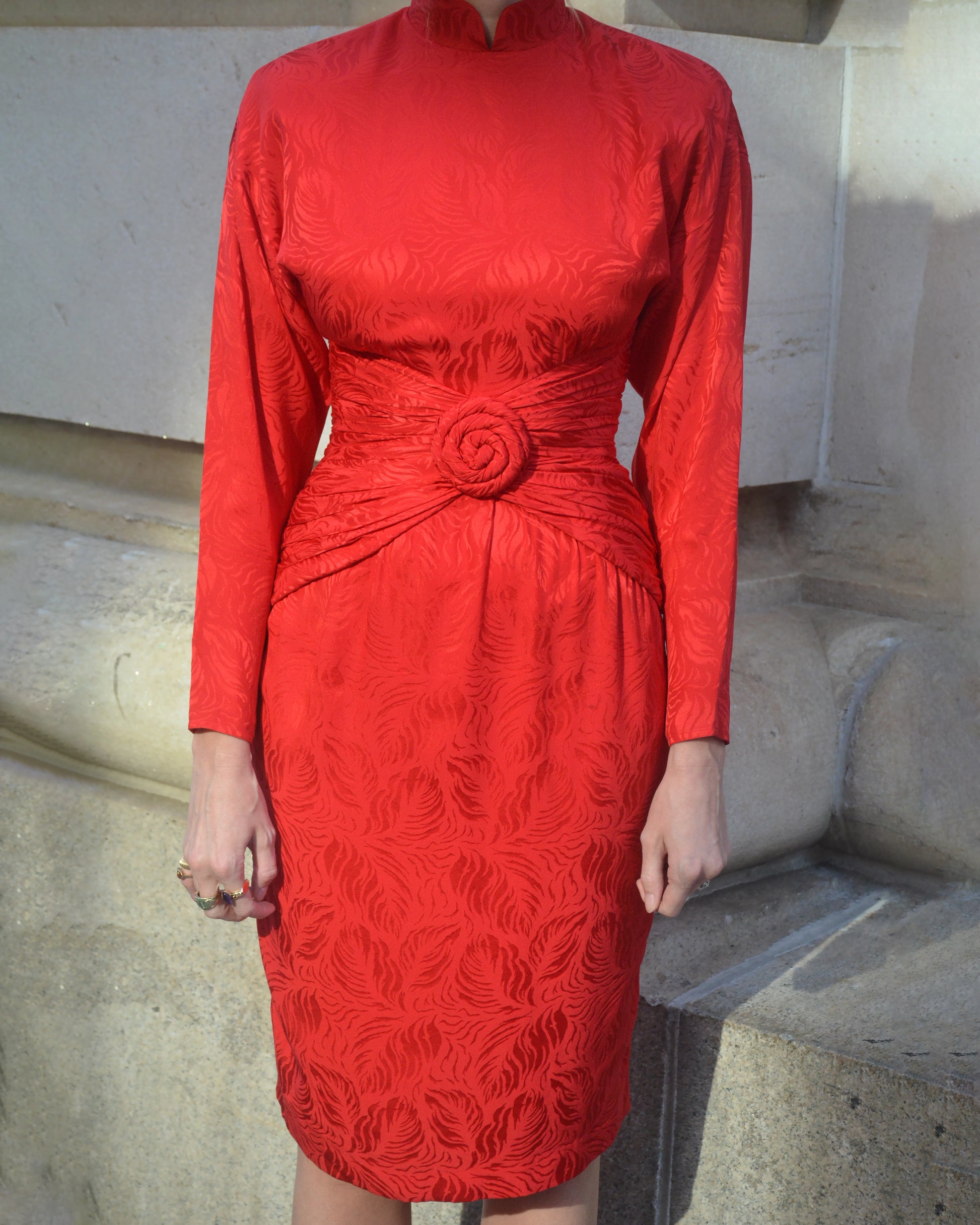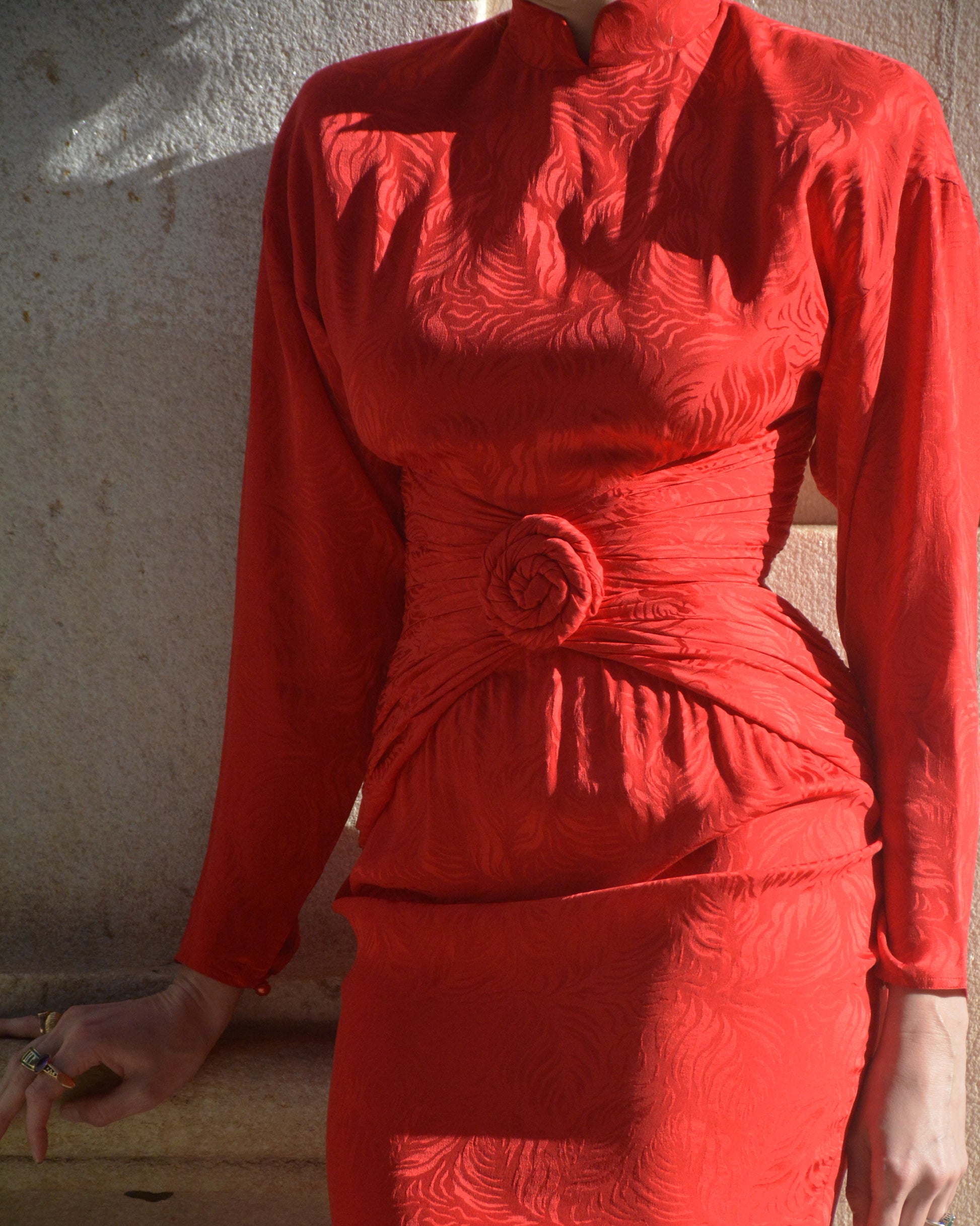 This Cheongsam-inspired silk wiggle dress is such a beautiful statement. Made in the 1980s by a New York-based label, it features a high mandarin-collar mockneck, and such a svelte shape throughout, created by dropped, padded shoulders, offset by gathering at the waist, to create an hourglass illusion. There is boning on either side of the bodice to help this corset-like effect. I love the knotted swirl detail at the waist. The red pure silk fabric is so soft, with a subtle tonal pattern. The back has a bit of a keyhole, closing with a zipper at the gathered waist, buttons at the mockneck, and a hidden hook in between with the option of closing it more or wearing open for a keyhole effect. There is a slit in the back of the skirt for ease of movement. 100% silk