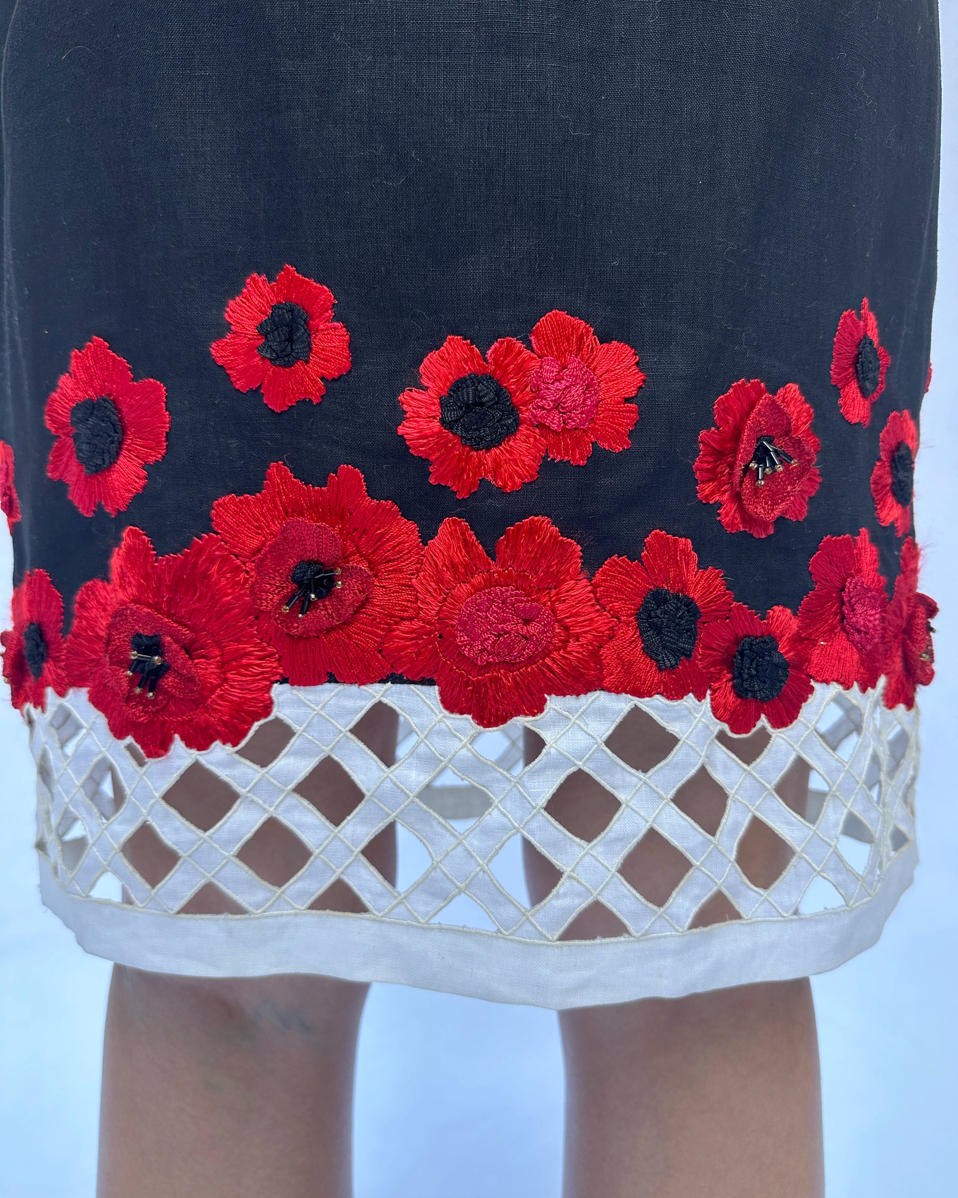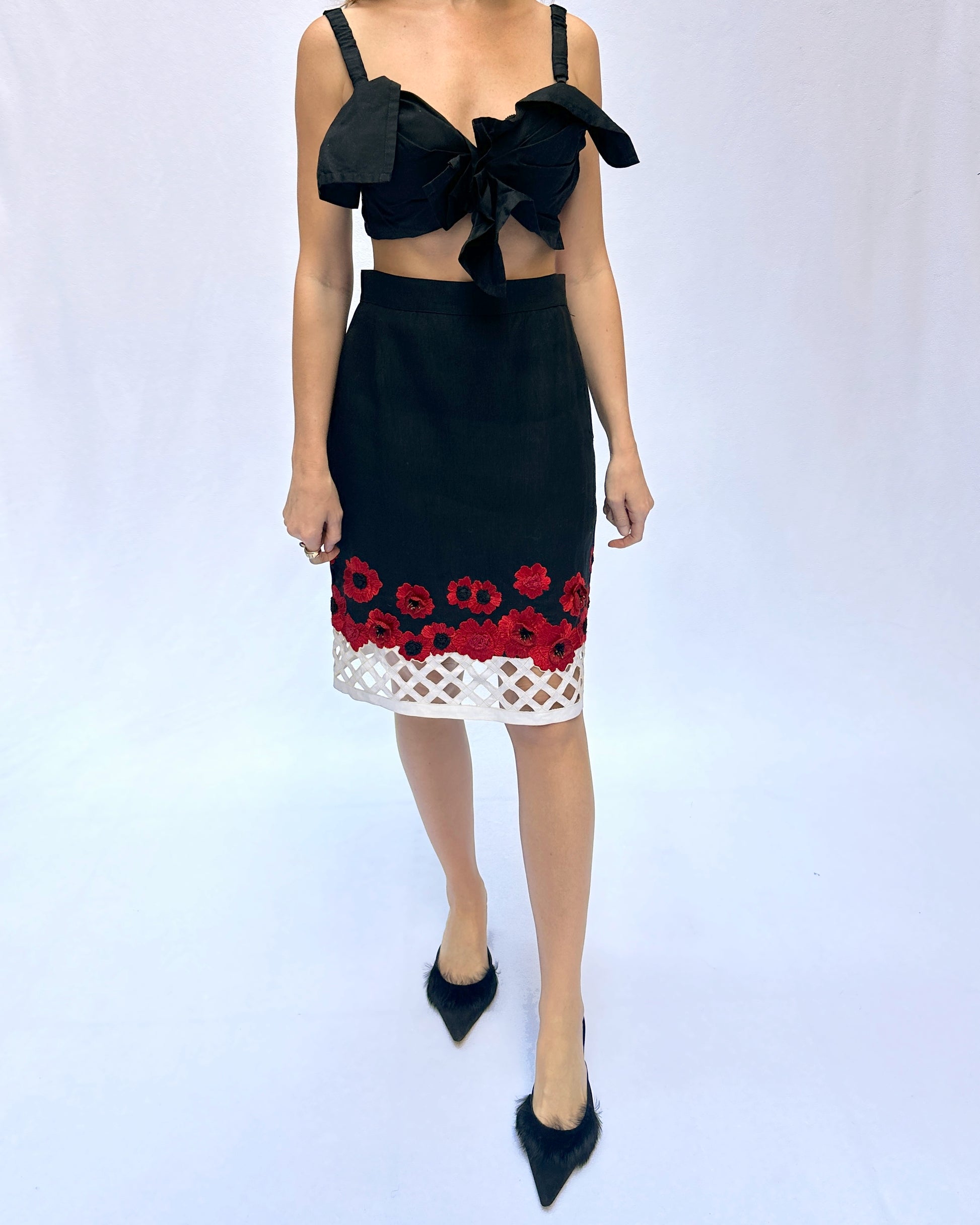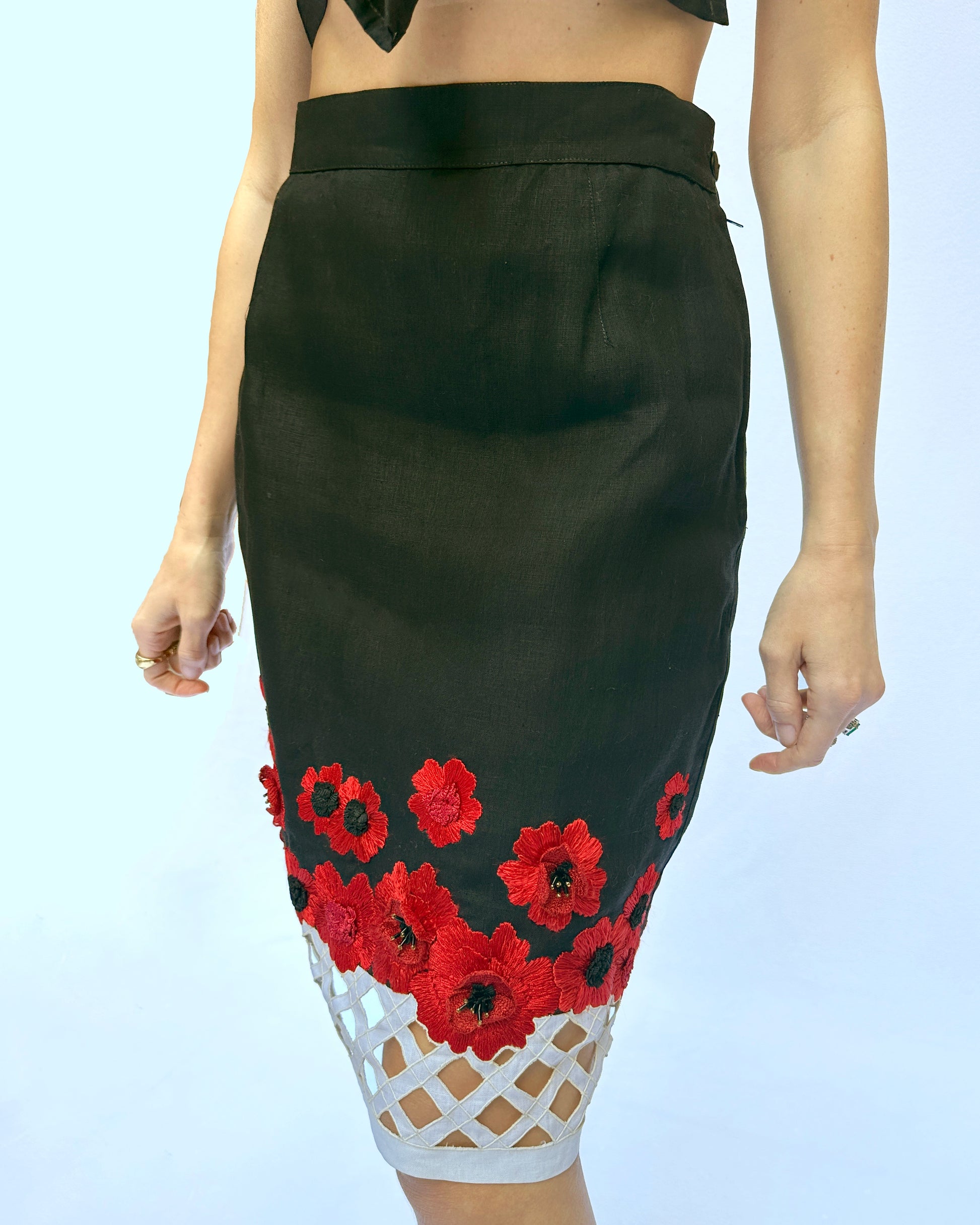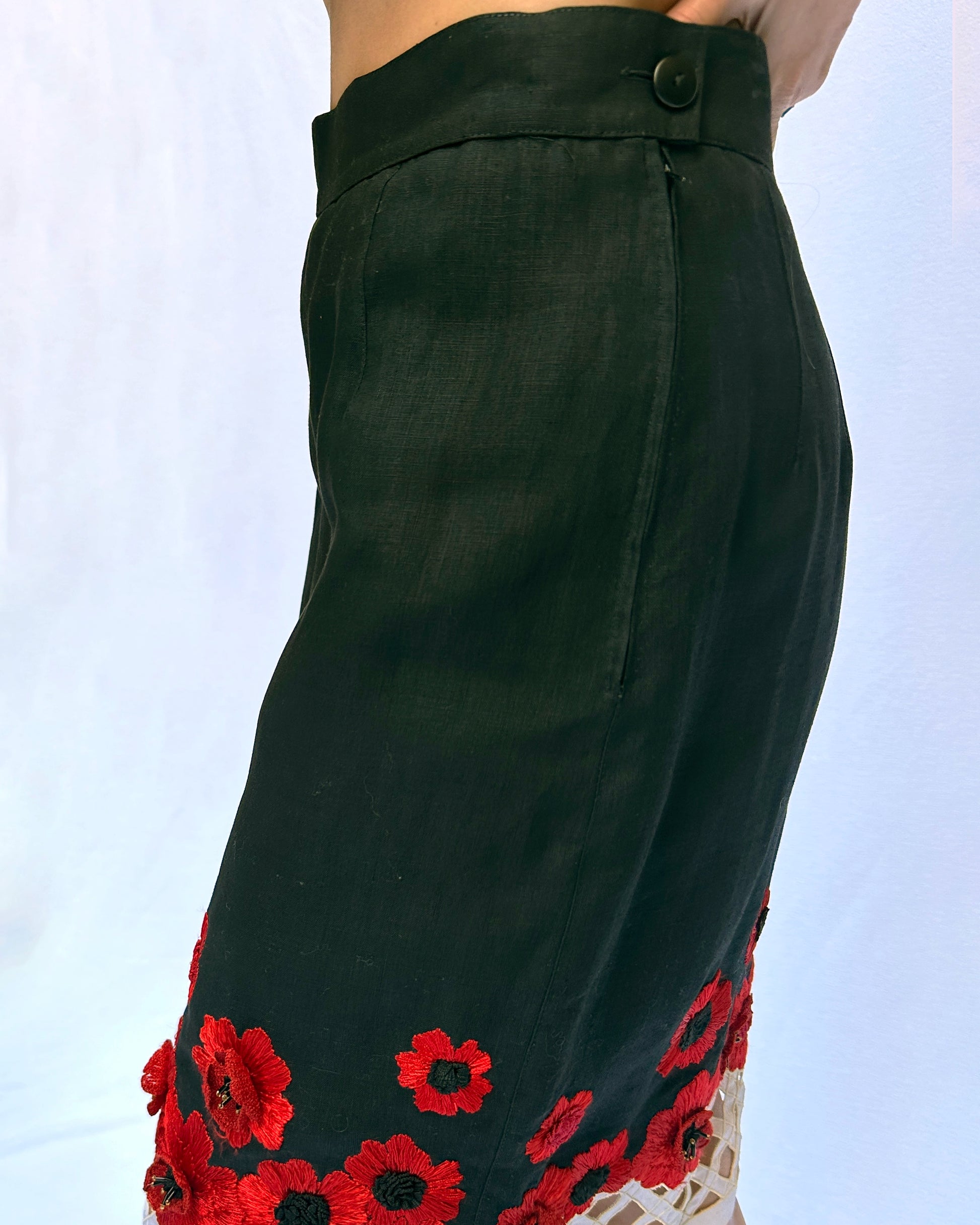 This festive skirt was made by Italian brand RoccoBarocco in the late 90s/early 2000s. The awe-inspiring, intricate embroidery, three-dimensional appliqué, and beadwork forms flowers at the hem, followed by a contrasting white lattice panel. It sits at the natural waist and is fitted through the hips. The fabric has the feeling of a linen/wool/silk blend, with a great deal of structure. It's fully lined, and closes with a size zipper, with a snap and button foldover at the waistband. Made in Italy, complete with the RoccoBarocco tag, as well as the retailer tag of a high-end Italian boutique from which it was originally purchased.