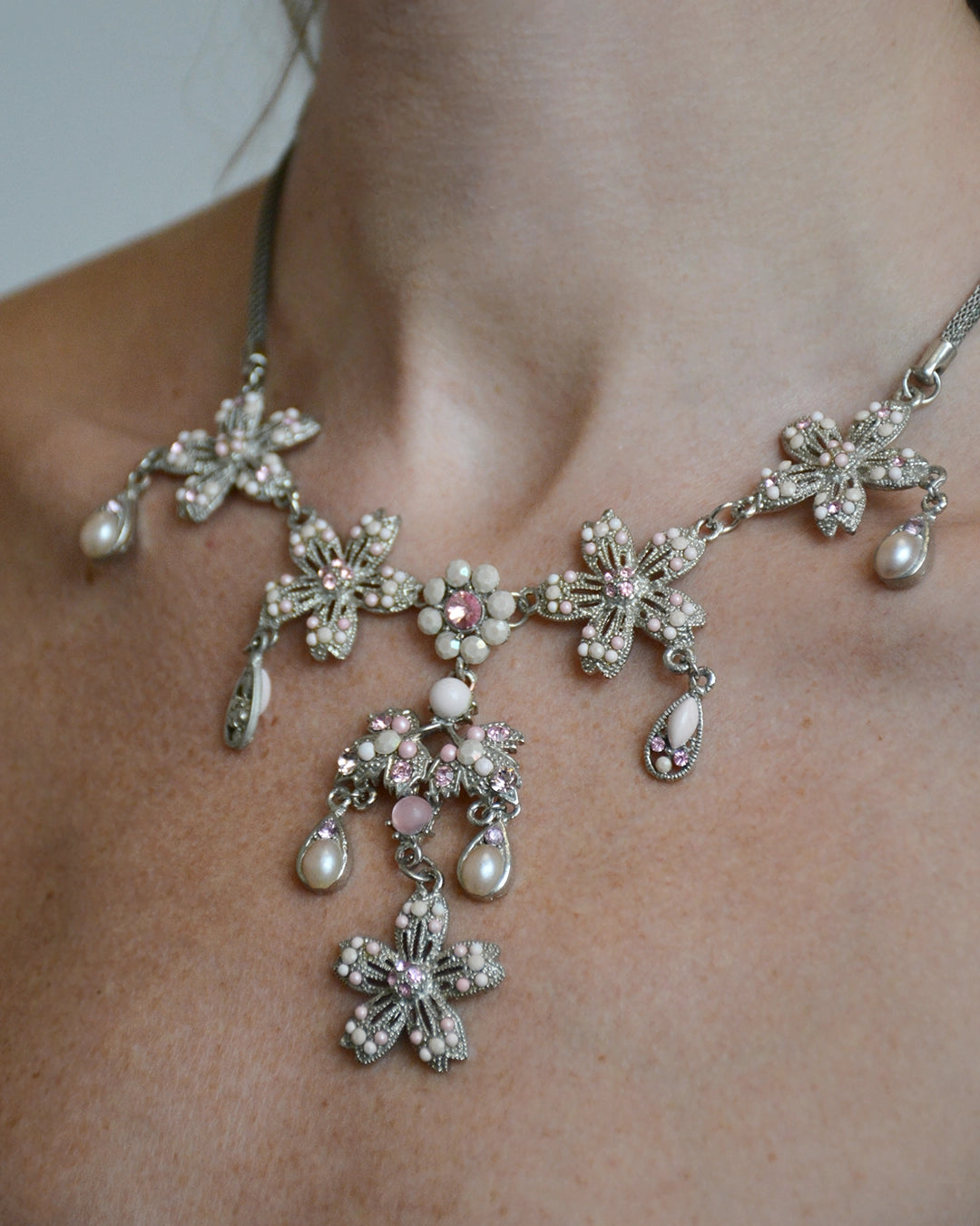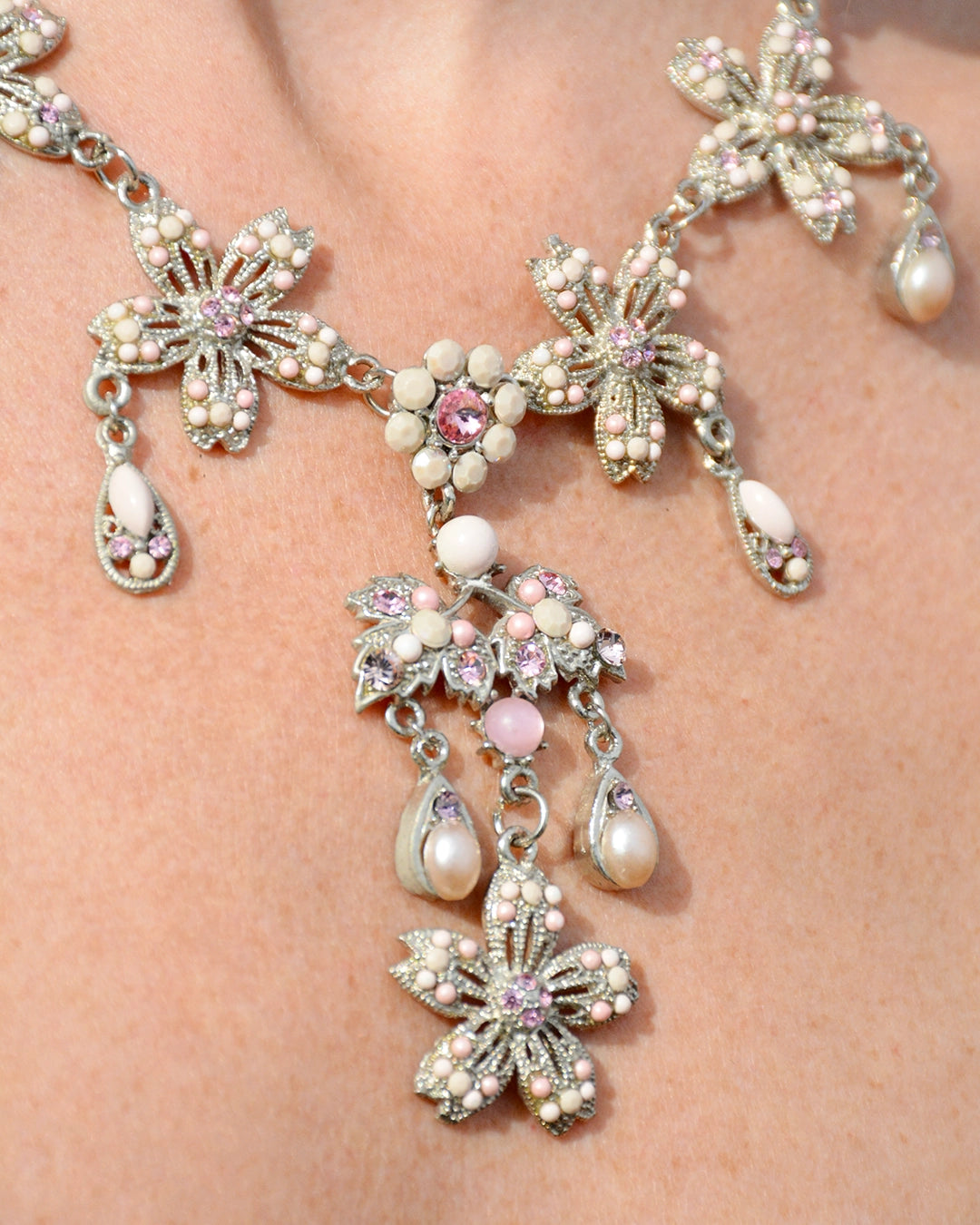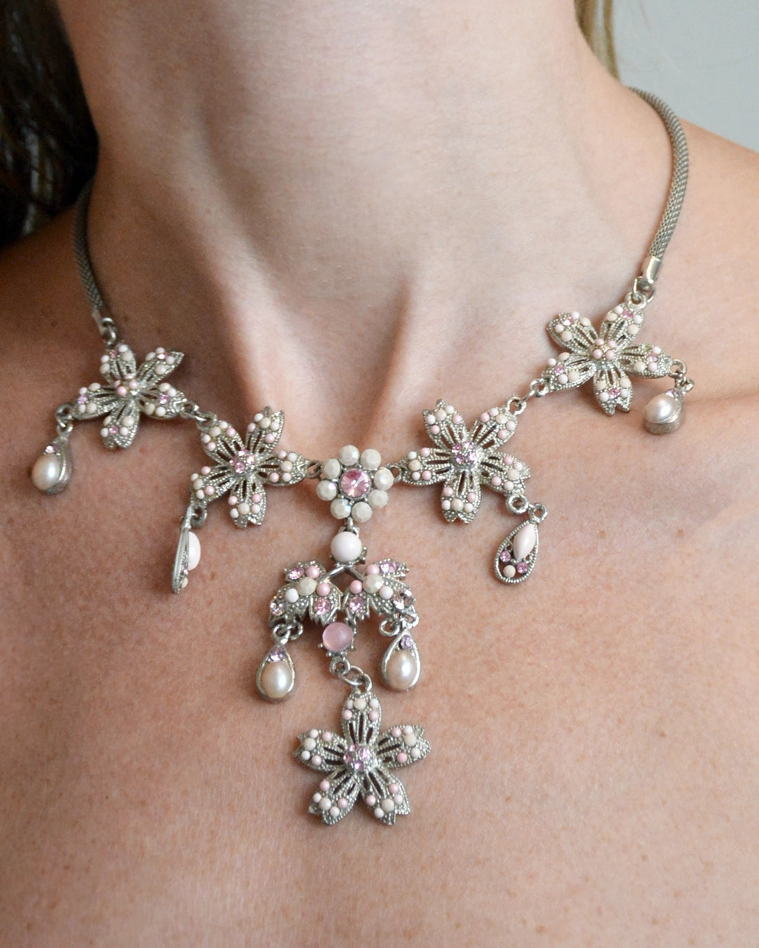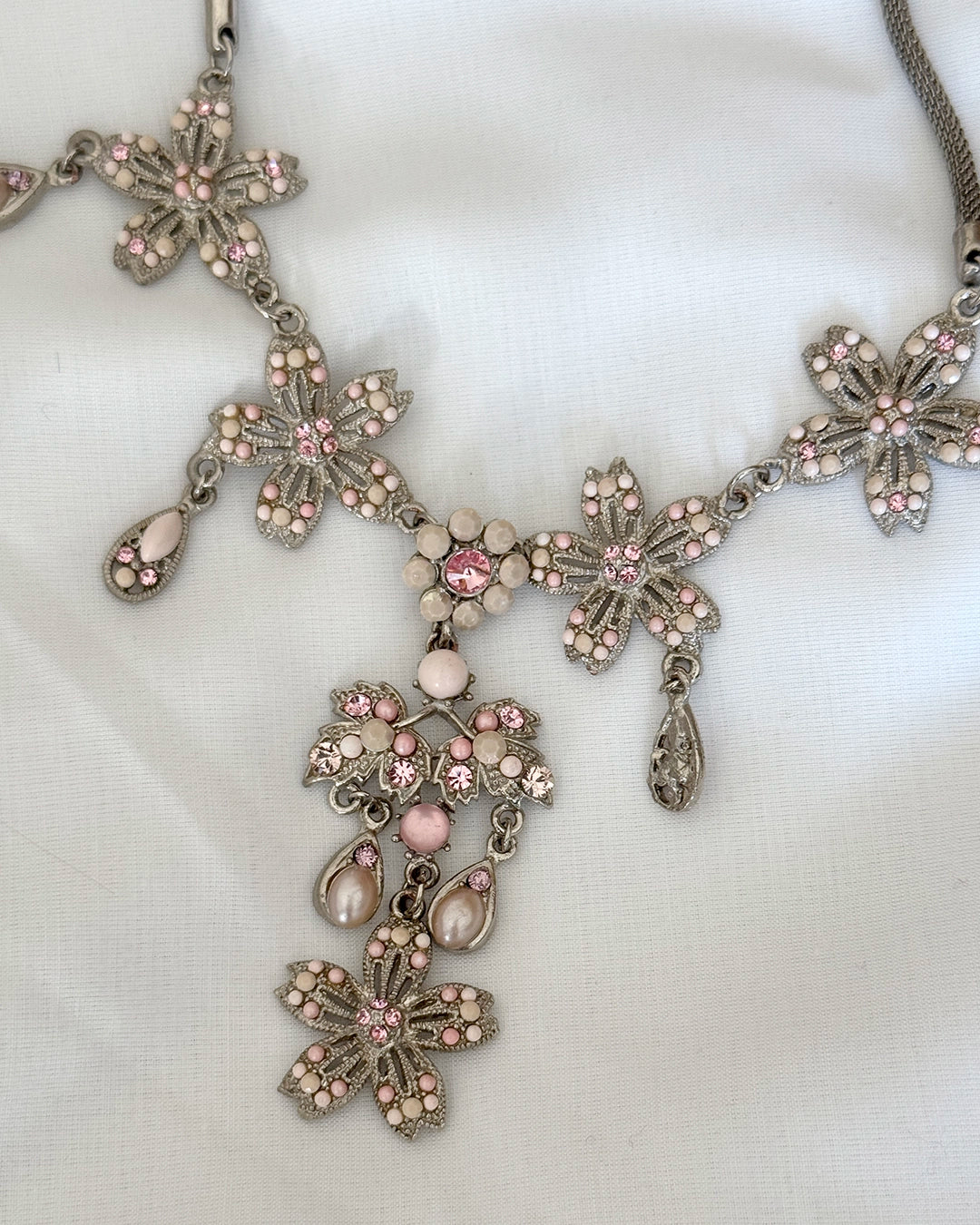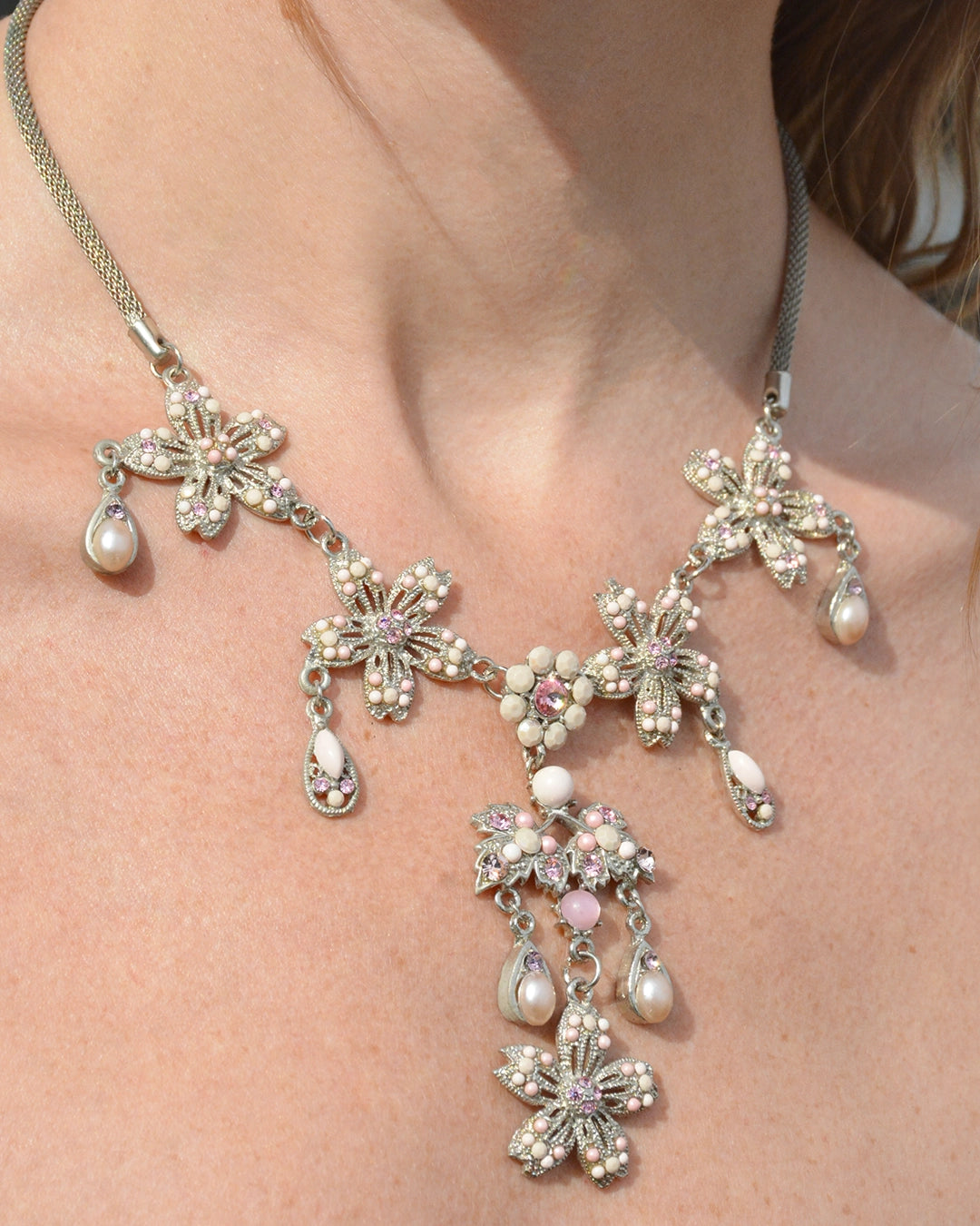 This amazing vintage floral statement necklace features an antique-inspired "festoon" shape, with floral bunches draped at various lengths throughout. It very much gives the Rococo-inspired vibe of Sophia Coppola's Marie Antoinette, instantly making any look super fun. It clasps with a lobster clasp with an extender chain, meaning the length is customizable for the perfect fit with any neckline; total length measures between 16.5" and 19".