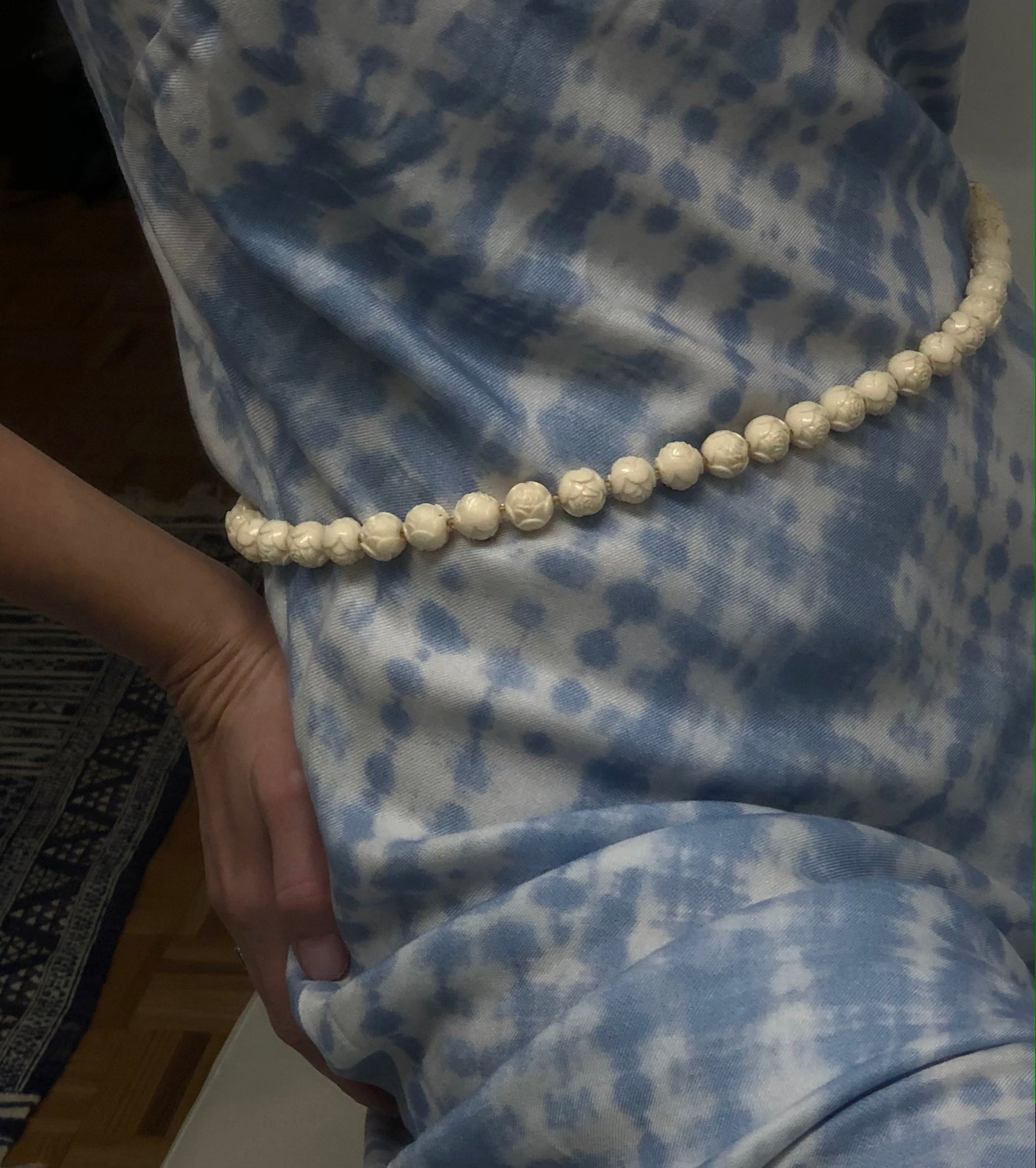 These vintage carved-rose beads are reminiscent of Chanel jewelry. They were made as a longer necklace, but I love it worn as a belt! It can also be doubled and worn as a choker. The details of each bead are beautiful— they look like tiny rosebuds. Finished in the back with a lobster clasp, it measures about 30" long; each bead is 14mm in diameter.
