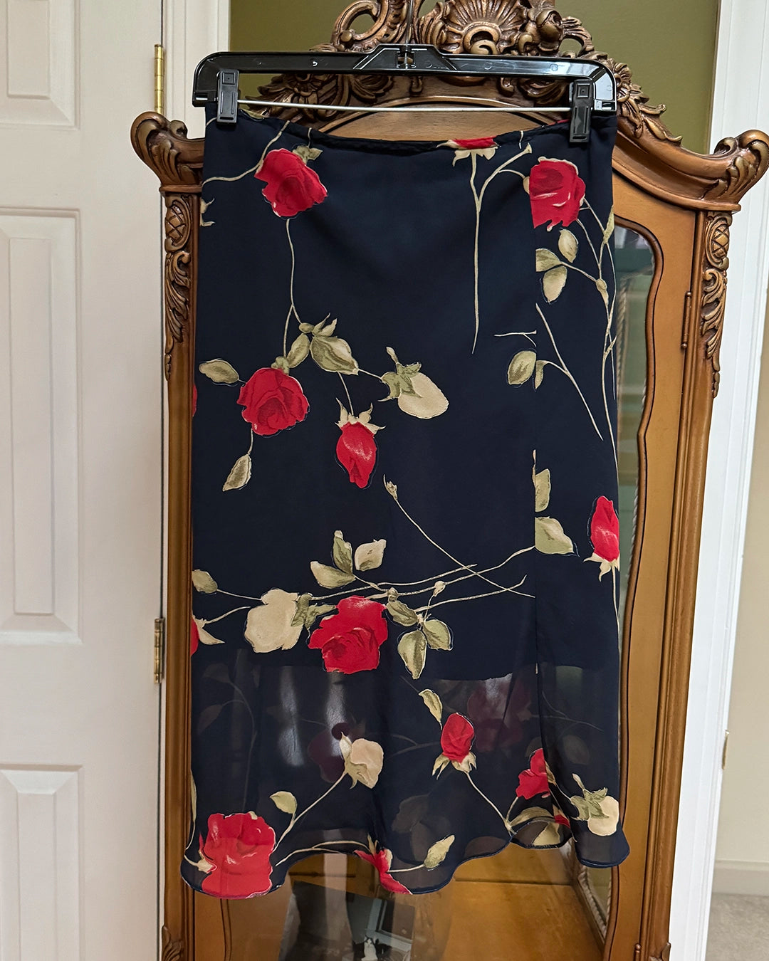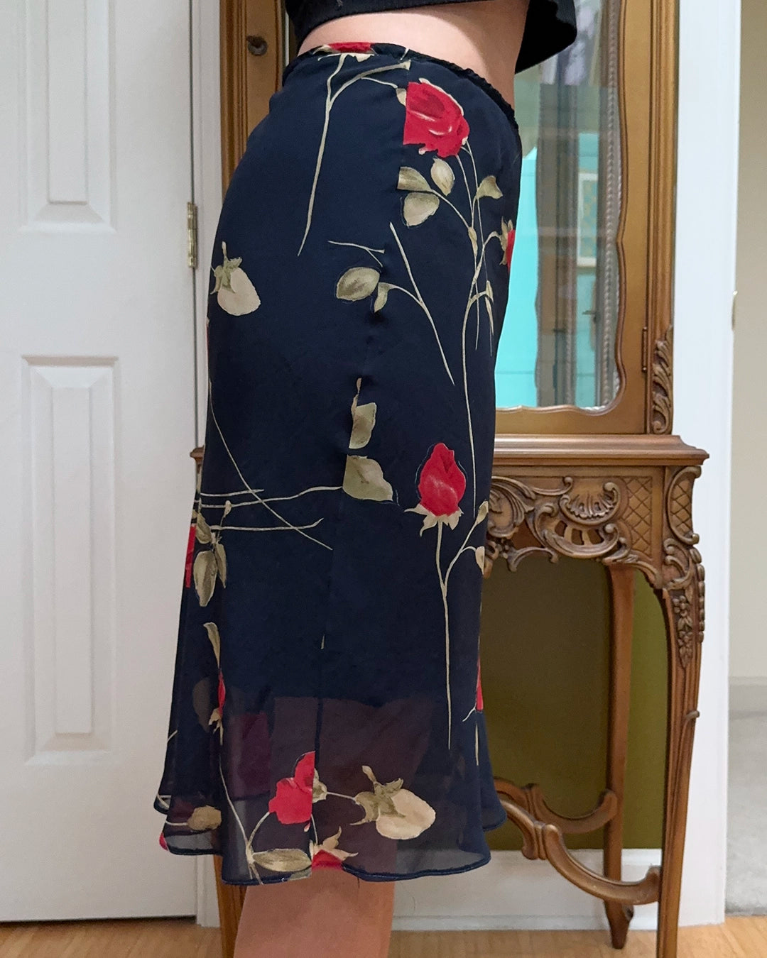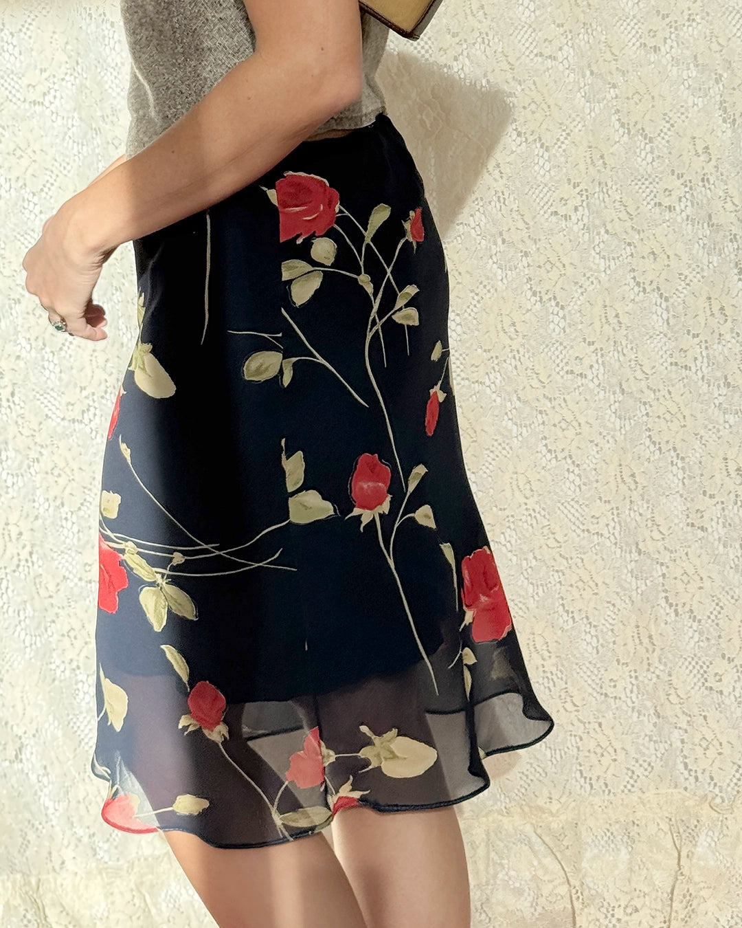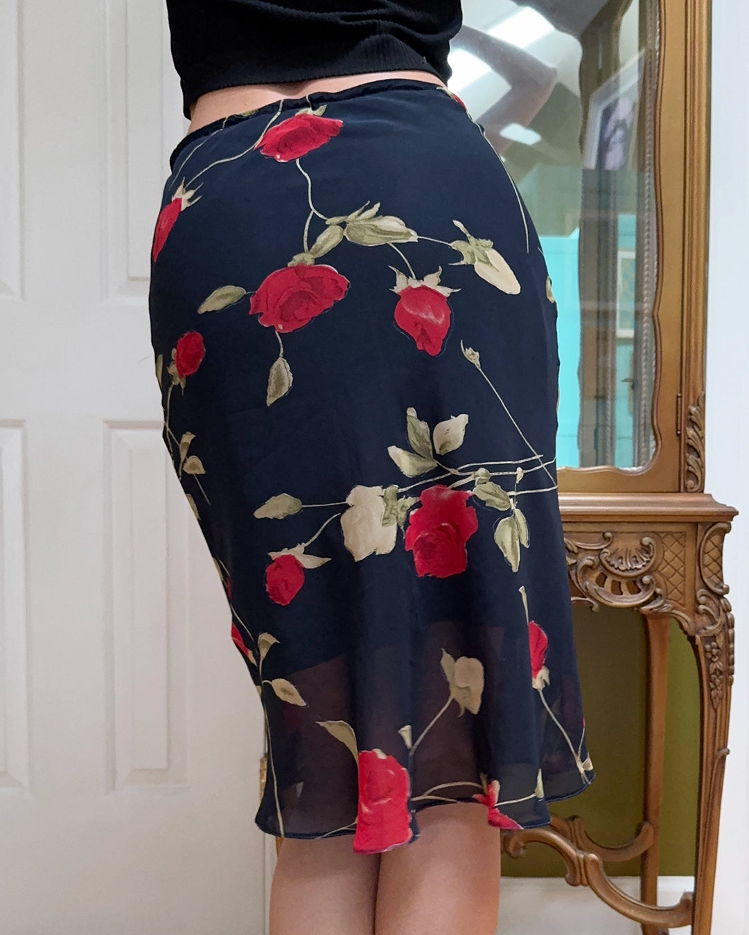 This vintage rose print bias-cut chiffon skirt feels very Carrie Bradshaw. Circa late 90s, there are a million ways to style it and I love that it's truly seasonless— it will look good with a tiny top in the summer, and amazing layered with tights, chunky knits, cardigans, boots, etc. in the colder months. The bias-cut chiffon is so flattering and really hugs the curves, fluttering out at the hem. The chiffon is sheer, and is lined about 4/5 of the way down, allowing for some alluring sheerness towards the hem. The waistband has hidden elastic, and the bias-cut fabric has natural stretch, and can be worn low-rise or higher on the waist, depending on the outfit.