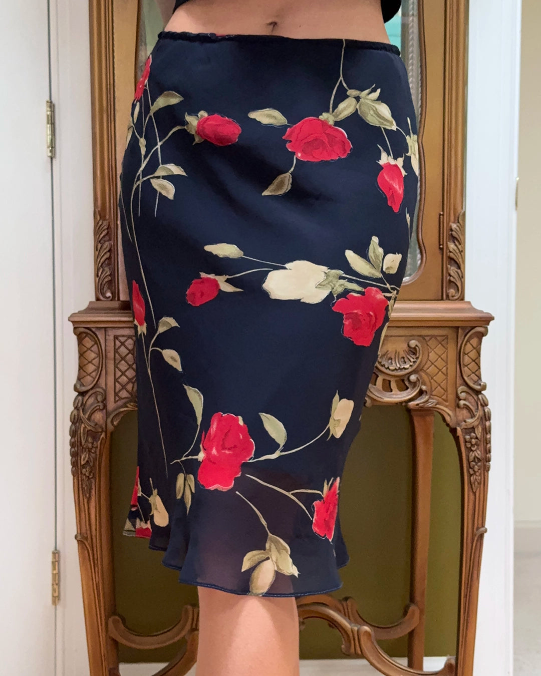 Vintage Rose Print Bias Cut Chiffon Skirt