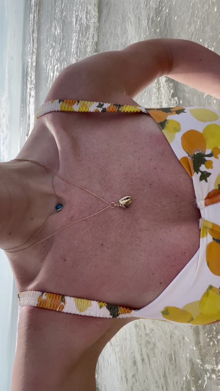 This pendant is crafted from a genuine auger seashell, and mounted with a gold-toned metal bail. It was sourced in Italy, and I love to imagine the adventures it has been on. The shape is so unusual, spiraling to get wider towards the bottom: Mother Nature is the greatest designer of all. It is available with or without a chain; note that the chain is not the exact one pictured but you can view details here. Measures 3.25" long with bail x 5/8" at widest point.