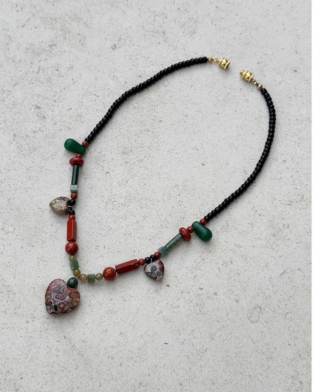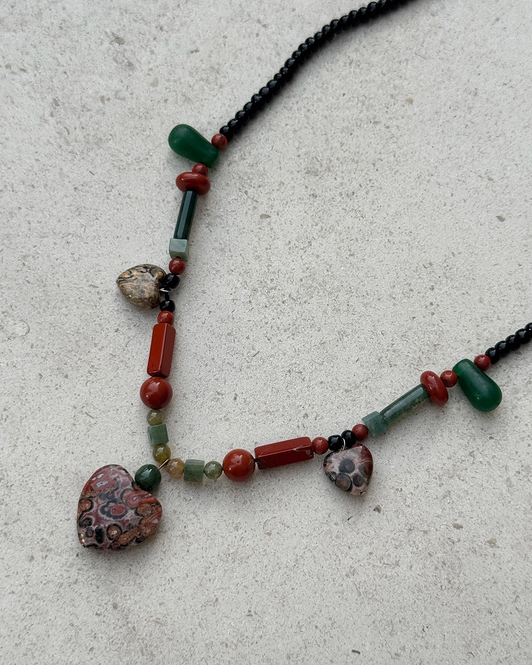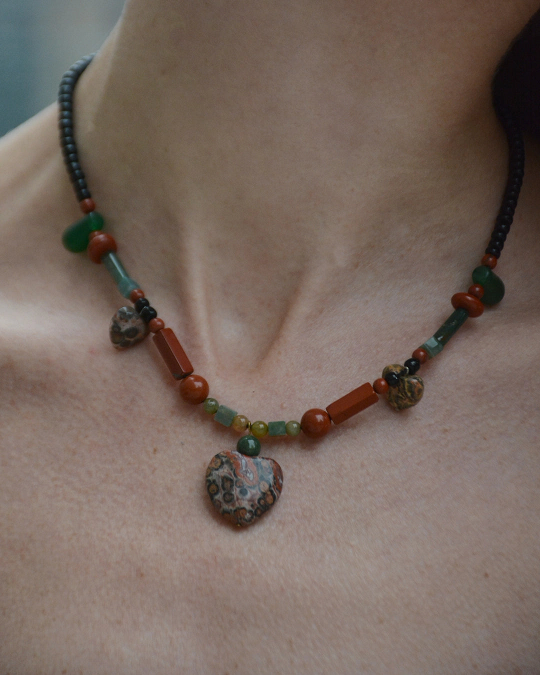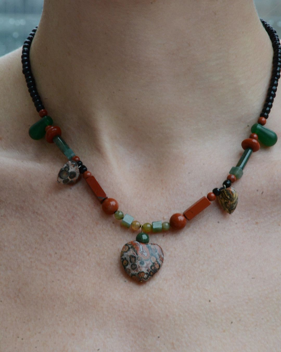 This vintage necklace is crafted of beads of semi-precious gemstones, which are polished into a variety of shapes, finished with a heart-shaped drop. Included are varieties types and colors of quartz and chalcedony, stones known for their healing properties. It closes with a screw clasp, and measures 16.75".