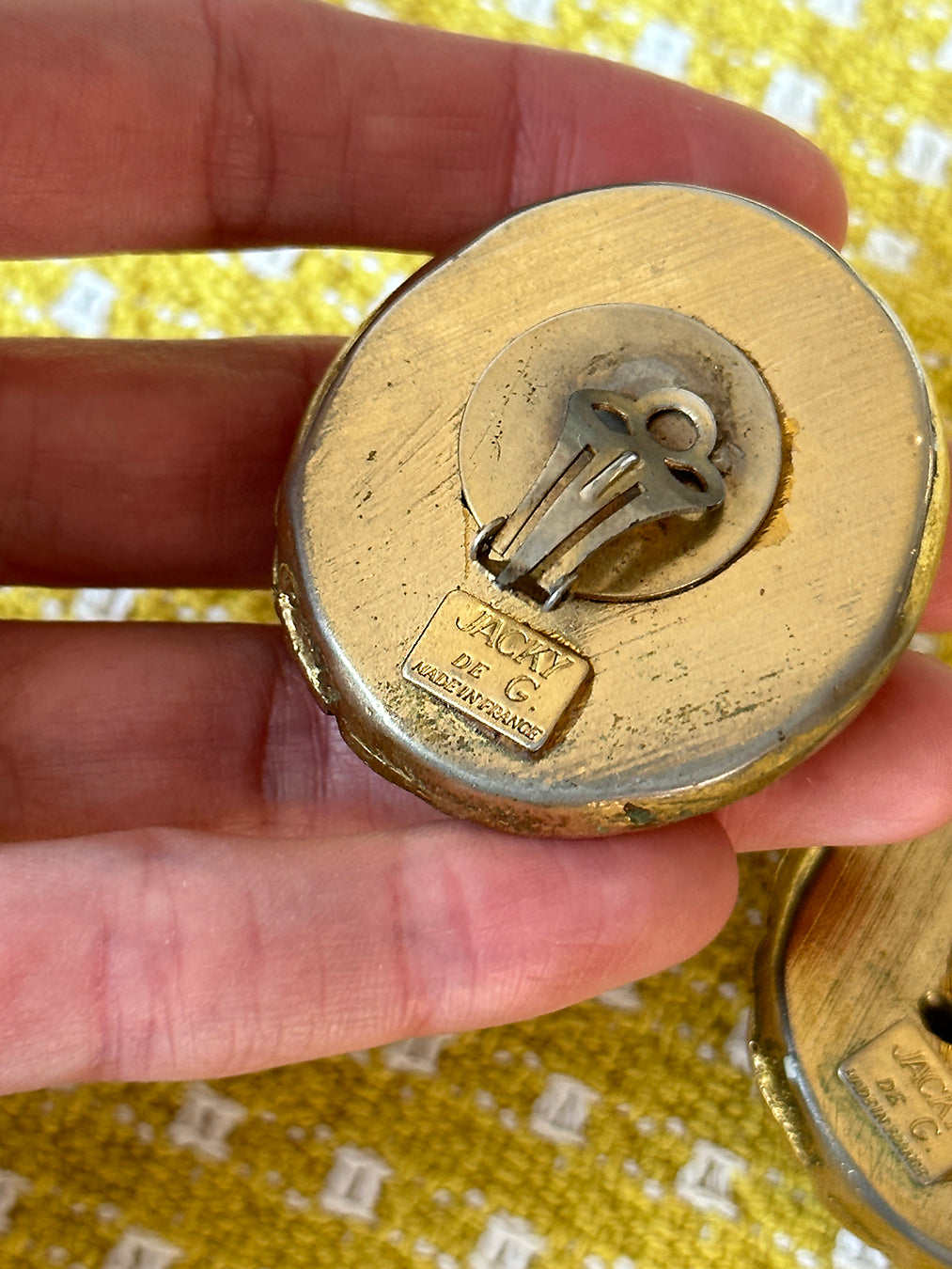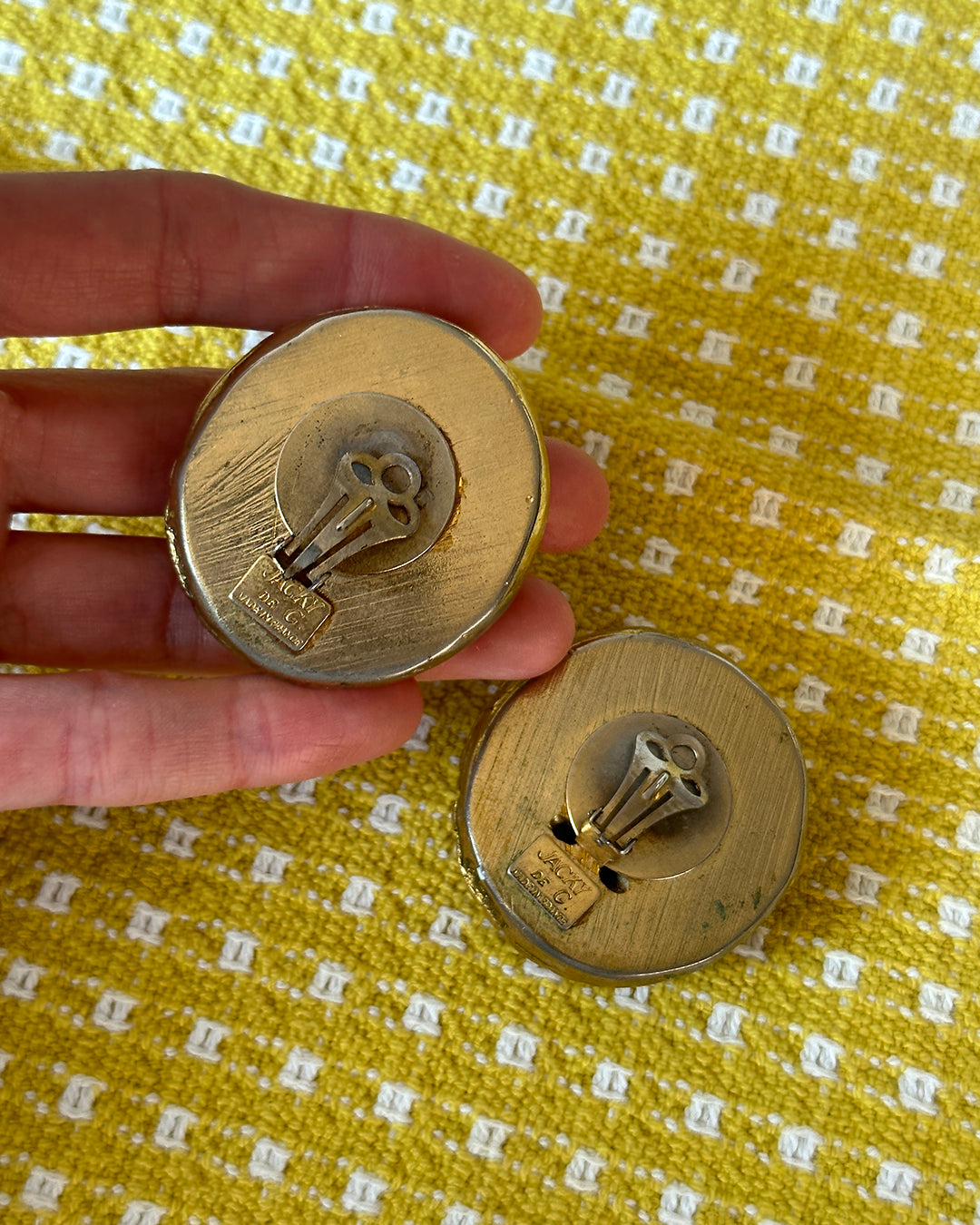 Great vintage condition; there is one spot on one of the earrings where the outer gold textured part has slightly chipped, but it feels like part of the design when worn/is something that you wouldn't notice unless looking because it blends in with the metal's texture. With any questions about the specific condition or size, please email shop@verybreezy.com for additional photos or measurements, as all sales are final.